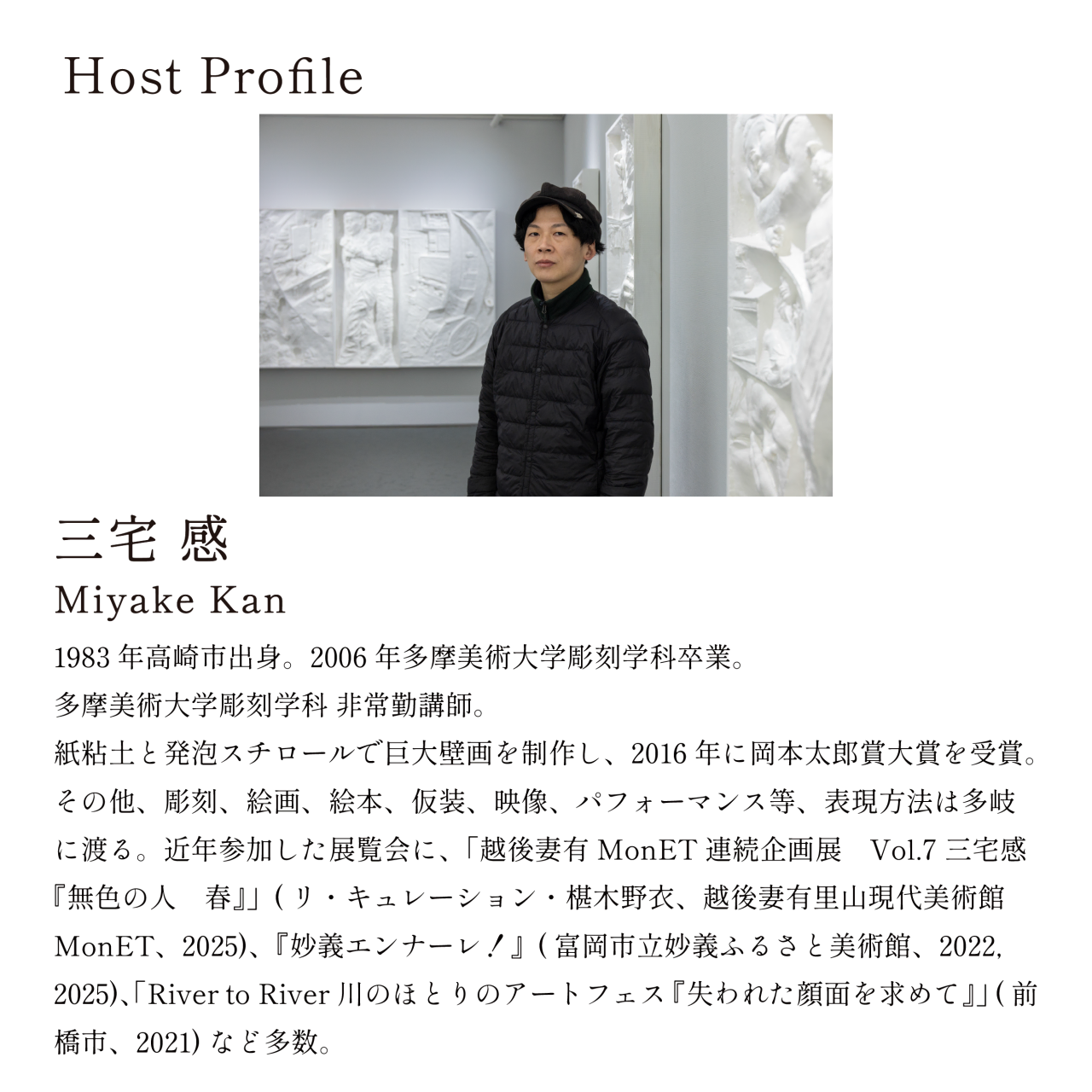 三宅感さんは2006年に多摩美術大学彫刻学科卒業し、多摩美術大学彫刻学科 非常勤講師を務めています。紙粘土と発泡スチロールで巨大壁画を制作し、2016年に岡本太郎賞大賞を受賞。その他、彫刻、絵画、絵本、仮装、映像、パフォーマンス等、表現方法は多岐にわたっています。近年参加した展覧会には、「越後妻有MonET連続企画展 Vol.7 三宅感『無色の人 春』」(リ・キュレーション・椹木野衣、越後妻有里山現代美術館MonET、2025)、『妙義エンナーレ!』(富岡市立妙義ふるさと美術館、2022, 2025)、「River to River 川のほとりのアートフェス『失われた顔面を求めて』」(前橋市、2021) など多数ございます。