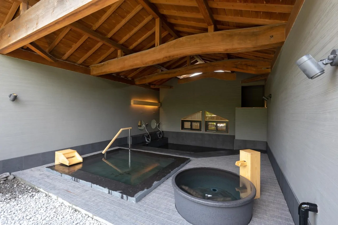 客室では、押入れだったスペースに冷蔵庫や掛け収納をしつらえるなど、現代の滞在に寄り添った和モダンの設えとしています。和紙や竹細工、竹編みを想起させる文様のモザイクタイルなど、由布の風土と響き合う素材を随所に取り入れ、くつろぎの時間に静かな品格を添えました。1階の特別な客室に備えられた露天風呂は、杉皮張りの塀で囲い、当初のお庭を更に上質な空間に。自然に溶け込むような設えのなかで、誰にも邪魔されない穏やかな湯の時間をお楽しみいただけます。