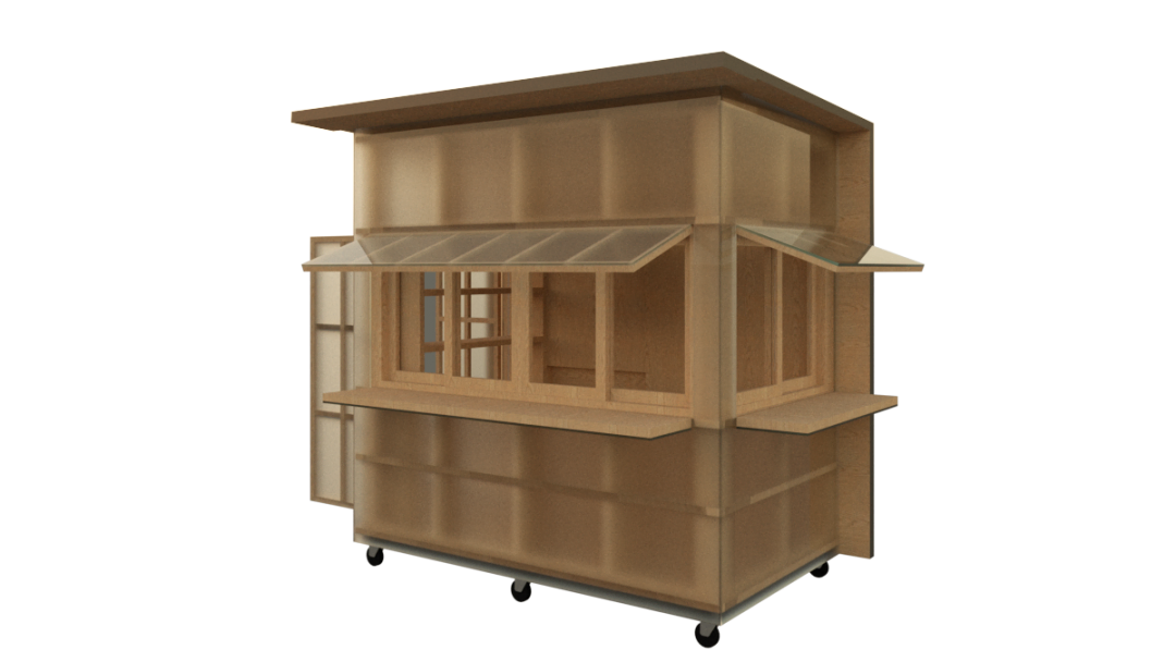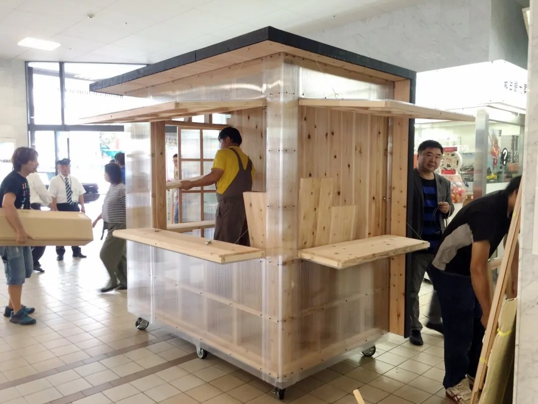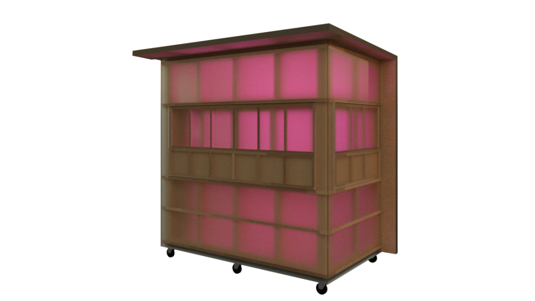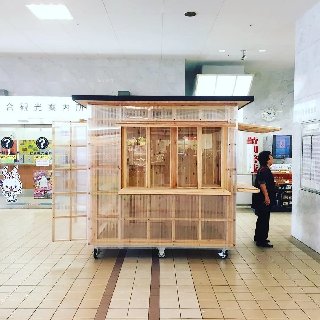 大分県産材の杉でできた「屋台骨」を中空ポリカーボネートという半透明の素材で覆っております。また三方に扉がついており、開けると透過性の高いインフォメーションセンター、閉じると結晶体のような広告塔として機能します。