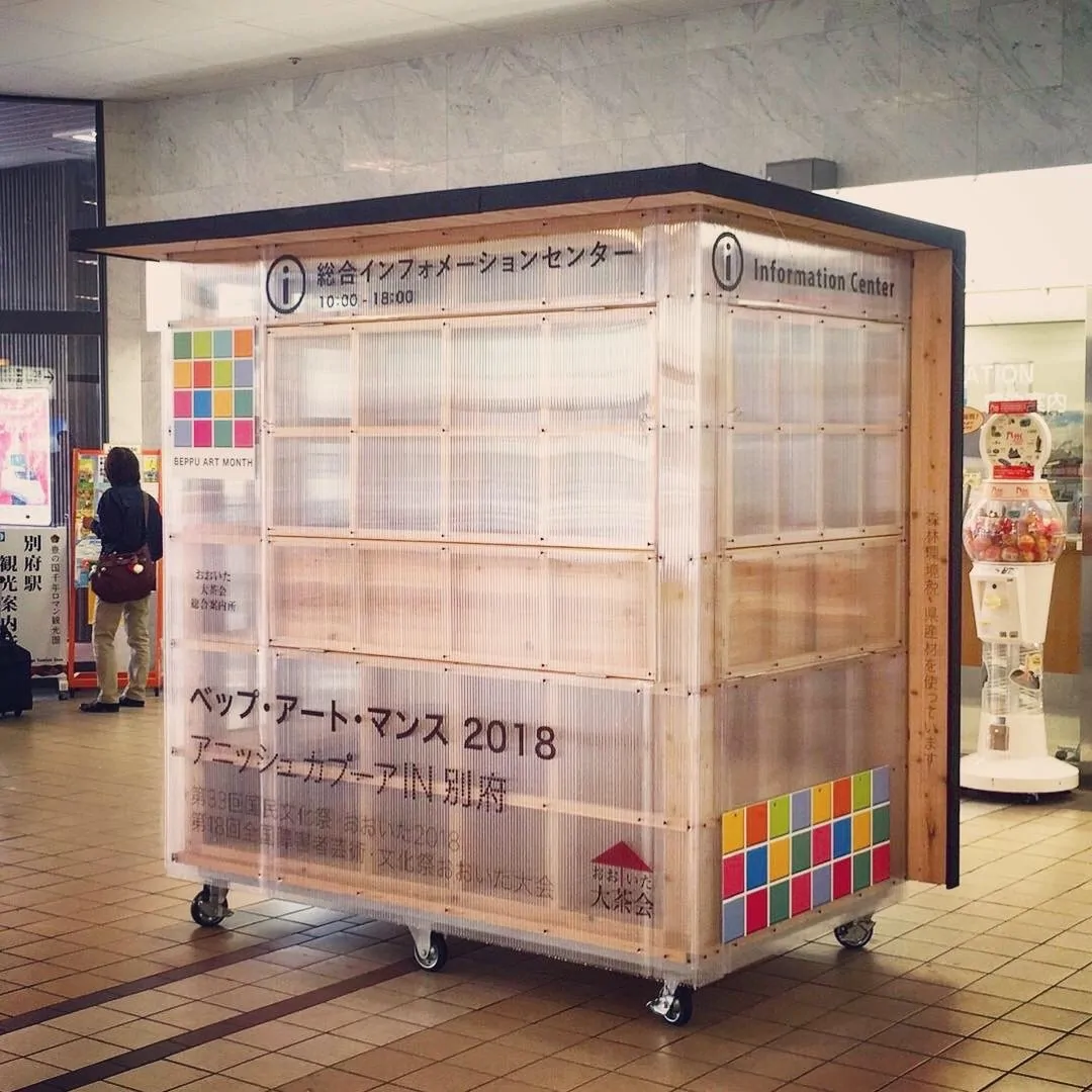 「アニッシュカプーア in BEPPU」のチケット売場を兼ねた「第33回 国民文化祭・おおいた2018、第18回 全国障害者芸術・文化祭おおいた大会」、「ベップ・アート・マンス2018」のモバイルインフォメーションセンターを製作した。