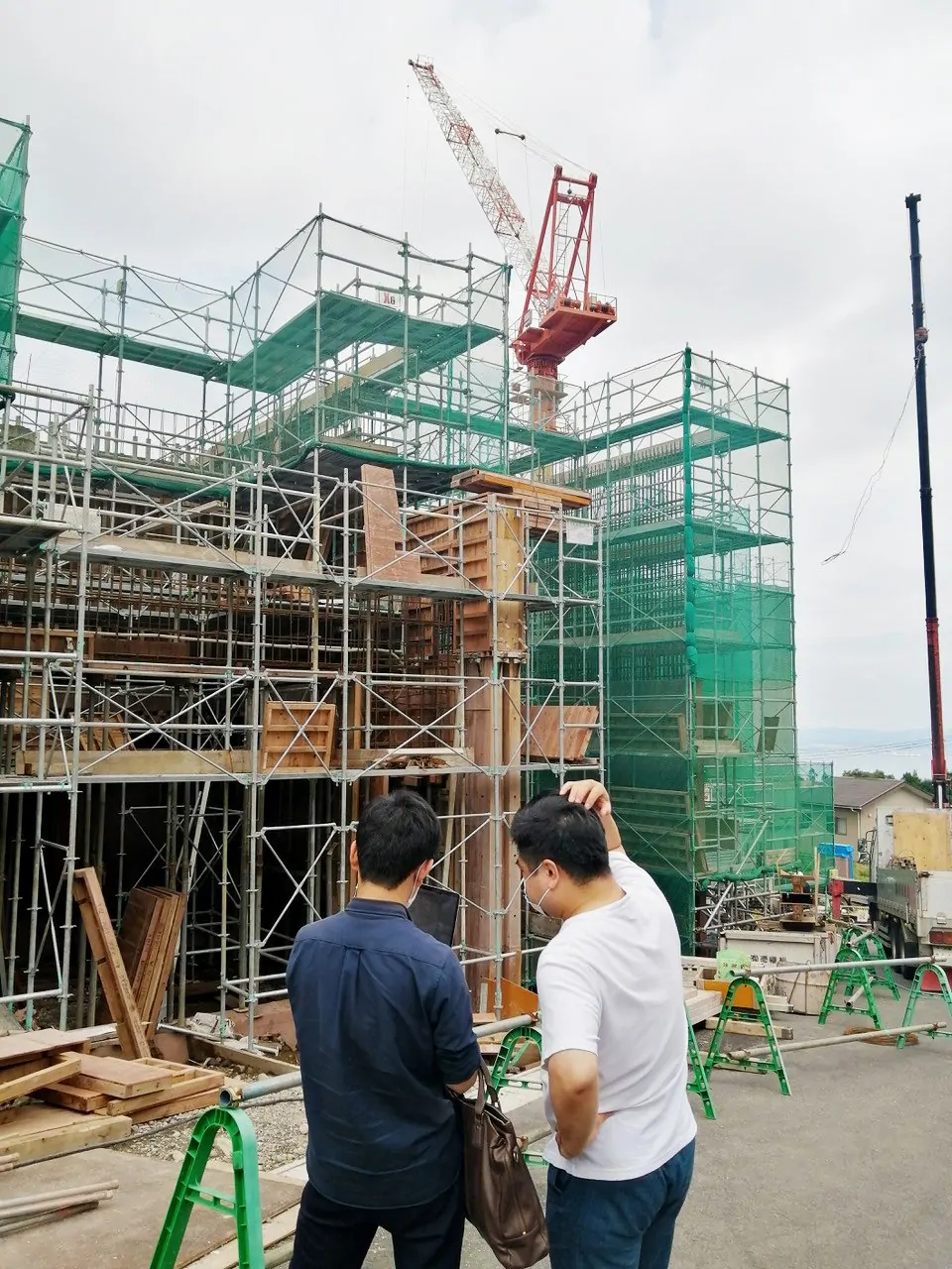 コンクリートの打設が着々と進み、3階まで壁や床が出来て建物らしくなっていました。現場に来るたびに杉型枠カラーコンクリート面のシブさにクゥ~ッとなります。連続した壁に囲まれていると、異世界に迷いこんだようです。表面の杉板の模様や錆び跡、エフロレッセンスの表情が箇所ごとに違っていて見飽きません。普通ならこういった跡がつかないように気をつけるところですが、今回の建物ではわざとそのままにしていて、”現象”をそのまま見せています。時間の経過でも色合いが変化しているようで、完成する頃には一体どんな風になっているのでしょうか、楽しみです。