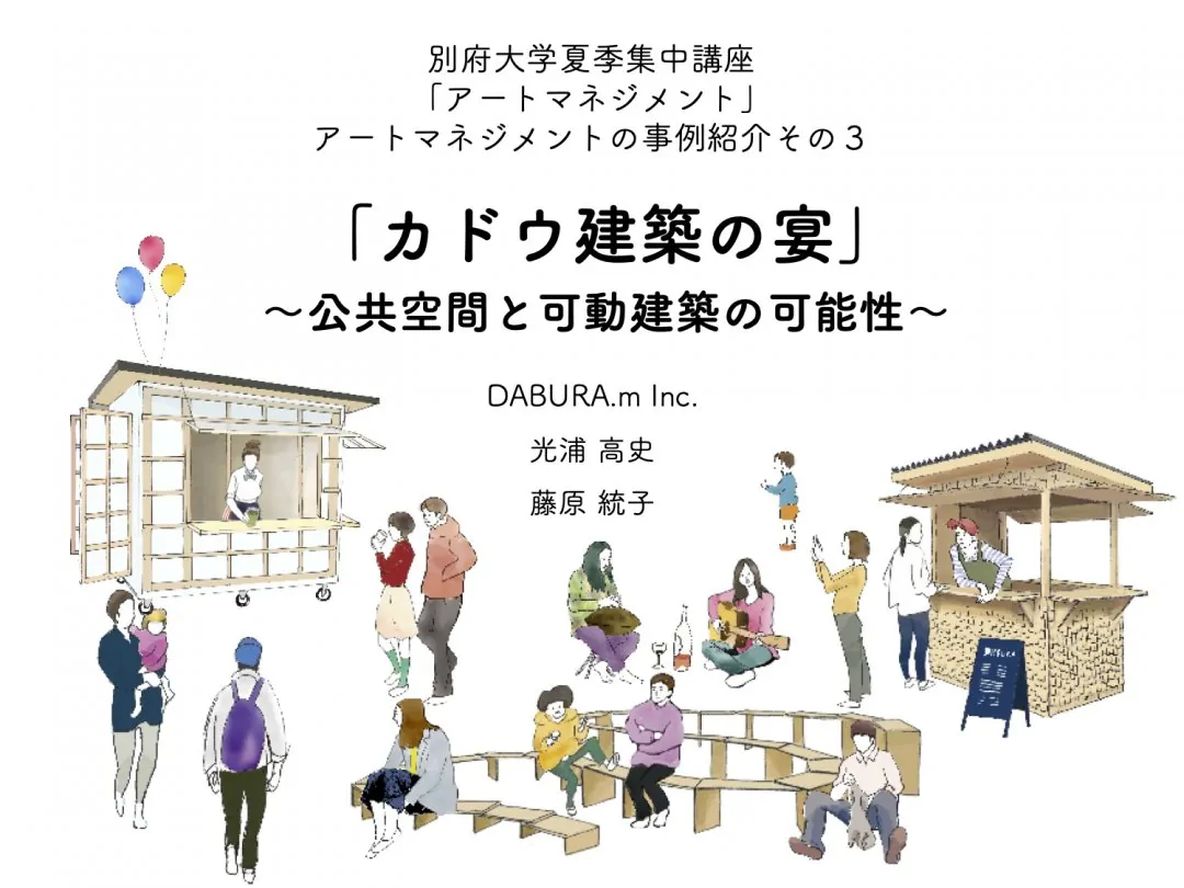 広報ののりこです。昨日ご縁をいただいて、別府大学のアートマネジメントをテーマとした夏季集中講座に参加致しました。弊社は、その中の1コマで、昨年別府公園で実施した「カドウ建築の宴」を中心にお話しする機会をいただきました。可動建築を使って公共空間に参加することで、これからのまちを変えることができるのではないか?ということを、学生の皆さんにお伝え致しました。私は、これまでのプロジェクトで描いてきたイラストやロゴデザインなどのVIについて説明する役目でしたが、社長の特訓のおかげで、自分が関わってきたプロジェクトについて楽しくお話しすることができました。学生の皆さんに、少しでも何かが伝わっていたらいいなぁと思います。