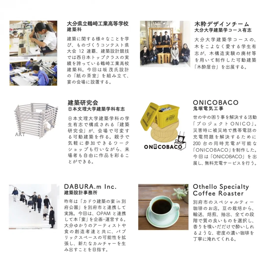 「カドウ建築の宴」は、パブリックスペースを活用した公民連携の社会実験です。可動型の建築を活用しながら、市民が楽しく活動的に過ごせる場所づくりを目指し、アーティストによるワークショップや展示、地域と「食」について創造的に考え実践している飲食店や生産者による出店などを行います。大分県立美術館開館5周年記念事業の一環並びに坂茂建築展の関連事業として実施される「カドウ建築の宴in OPAM」は、OPAMを設計した建築家坂 茂氏の活動につながる、建築や都市空間の社会的な意義に着目したものであり、来館者がよりOPAM内外の空間を楽しく過ごすことにつながる機会になればと願い開催します。弊社DABURA.mは、プロジェクトメンバーとして企画に参加いたしました。また、当日は運営面で協力いたします。楽しく過ごせる1日となりますので、皆様是非ご来場ください!