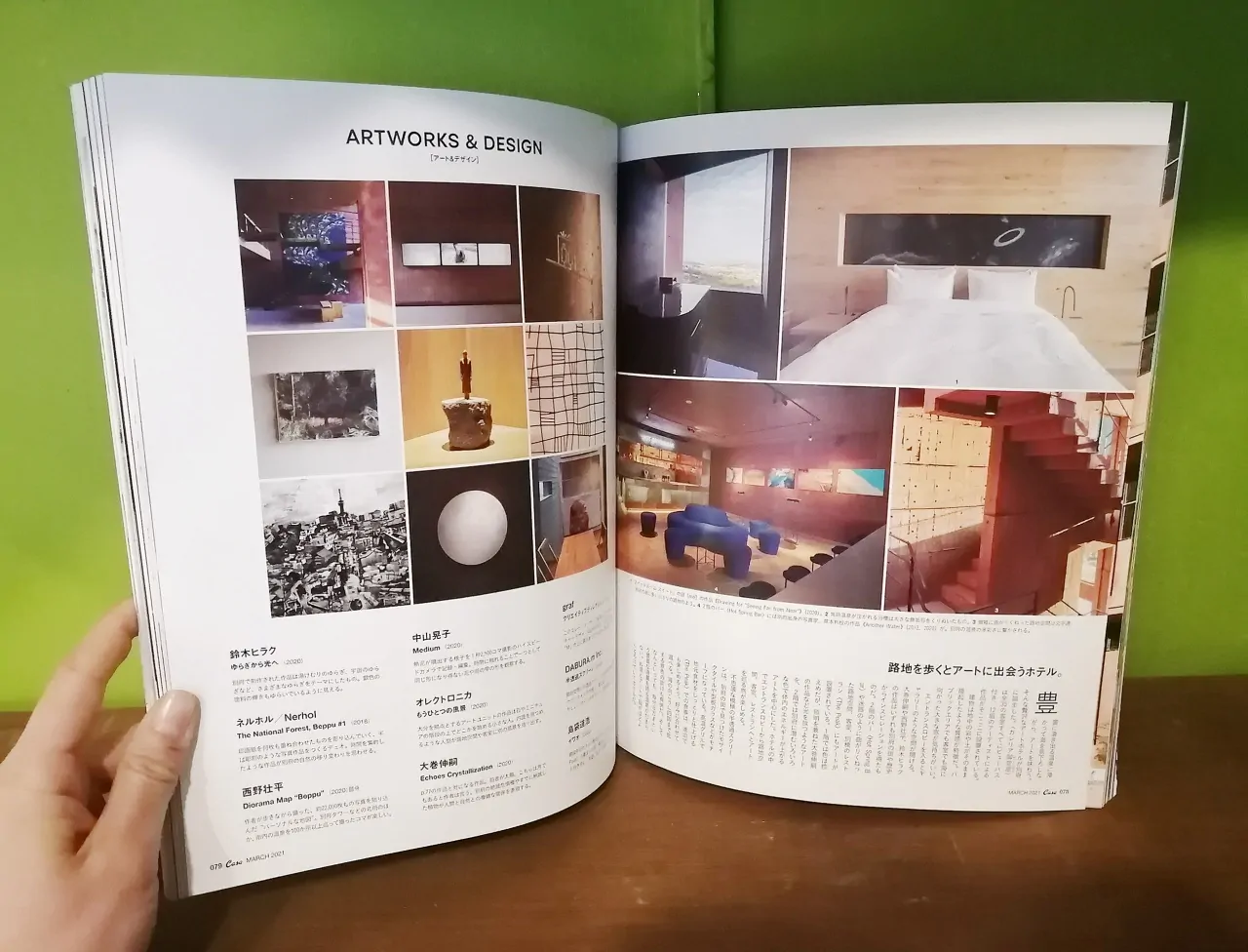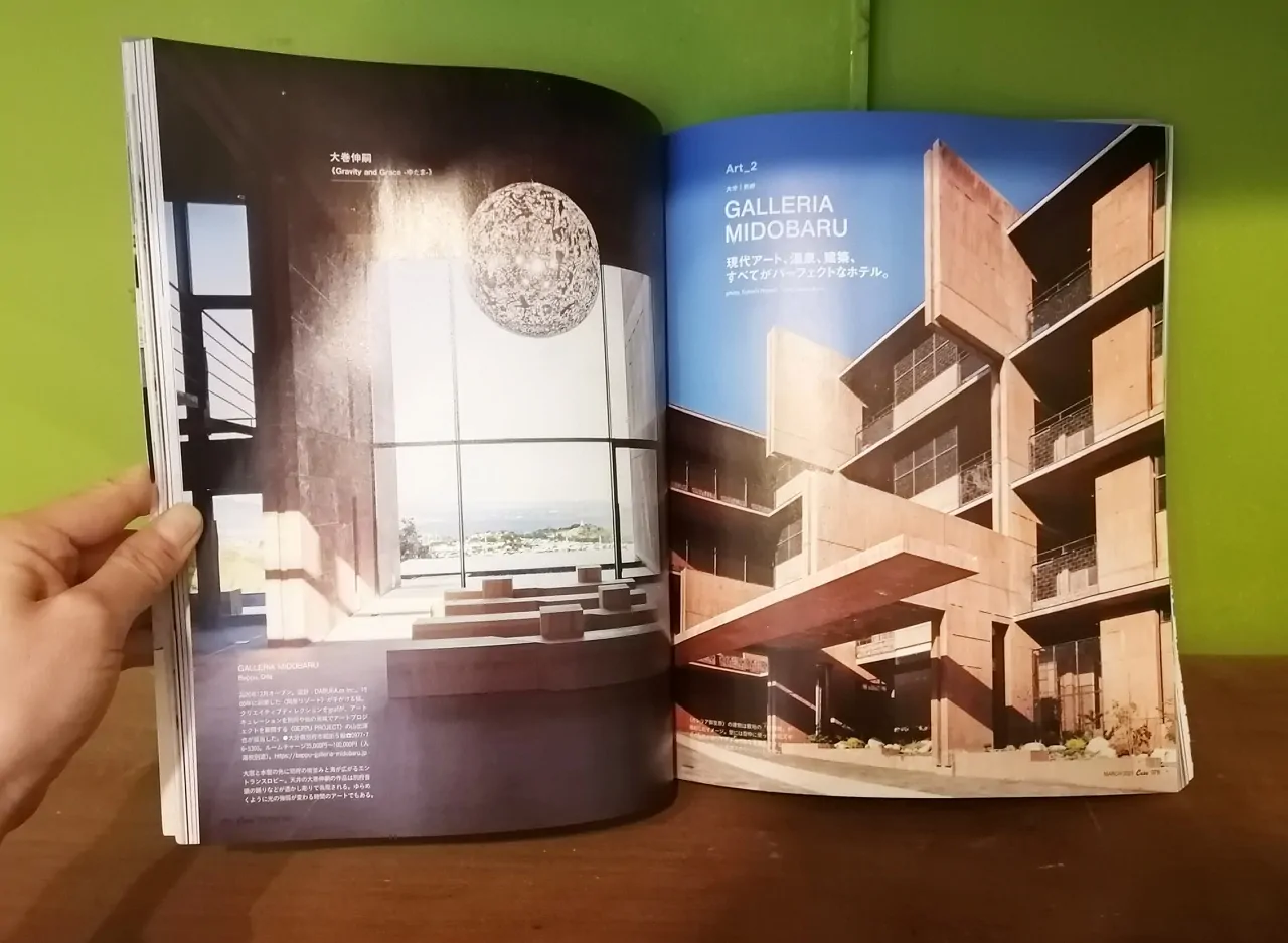 こんにちは。広報担当の藤原です。Casa BRUSUS 3月号「STAY HOTEL 癒しの宿」で弊社が設計・監理した「GALLERIA MIDOBARU」が掲載されています。見出しでは「現代アート、温泉、建築、すべてがパーフェクトなホテル。」と紹介されています!(76p) 空間やアート・デザインについてもしっかり魅力の伝わる特集となっていました。是非、ご覧になっていただければと思います。私も実際に館内を歩いてみましたが、別府というまちを感じながら、素敵なアートや別府を一望できる素晴らしい空間となっております。レストラン「THE PEAK」では特別な石窯で調理した地元食材を楽しめる食事もいただけます。美味しいですよ!皆様、是非、足を運んでみてください!