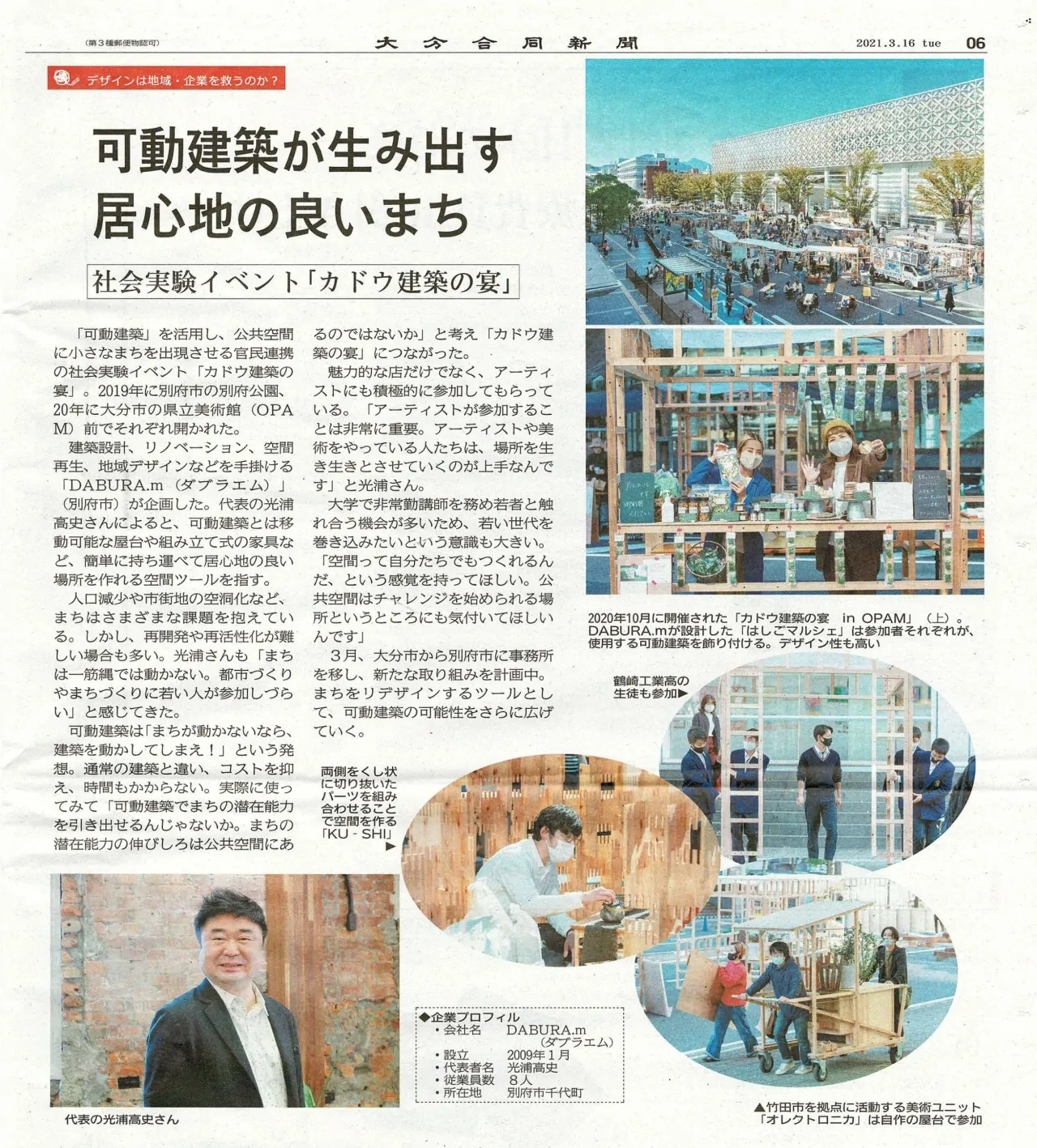 本日の大分合同新聞「GX PRESSビジネス」にて、弊社代表光浦をご取材いただき、記事が掲載されております。まちのパブリックスペースの潜在力を引き出す「可動建築」についてや、それらによって実際にパブリックスペースをアクティベートする公民連携の社会実験「カドウ建築の宴」について写真も交えて解説して頂いております。皆様是非ご覧ください!