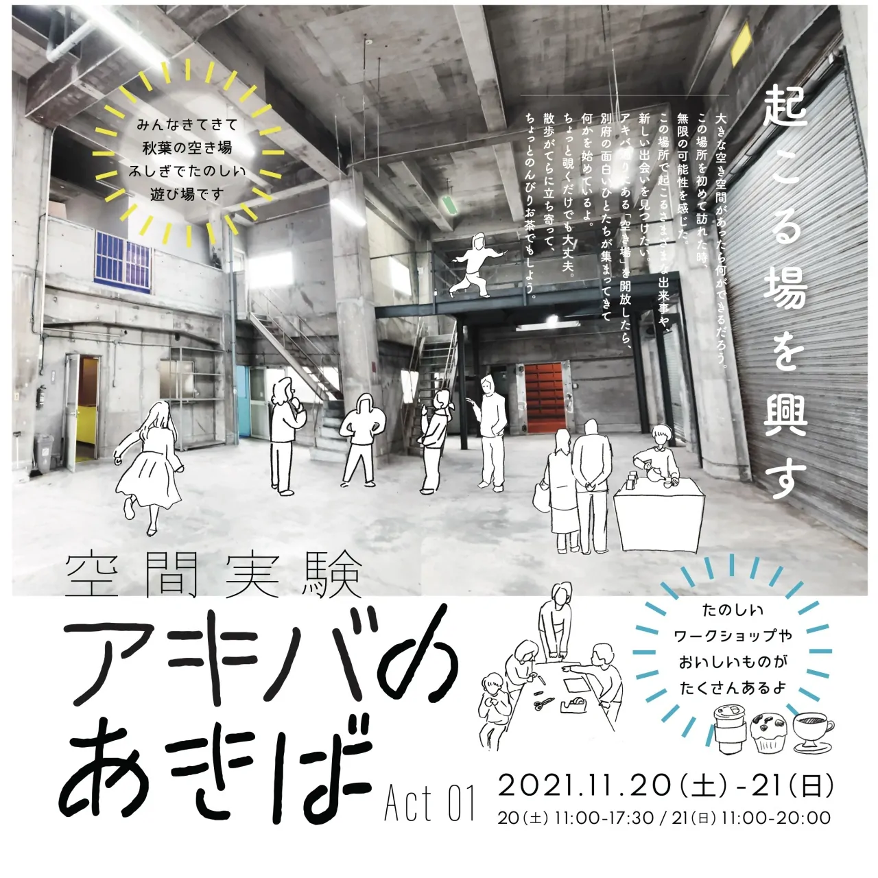 芸術や食欲の秋ということで、11/20(土)21(日)に、DABURA.mオフィスよこの空き空間と、同ビルの空き室を使って「アキバのあきば」という空間実験を行います!