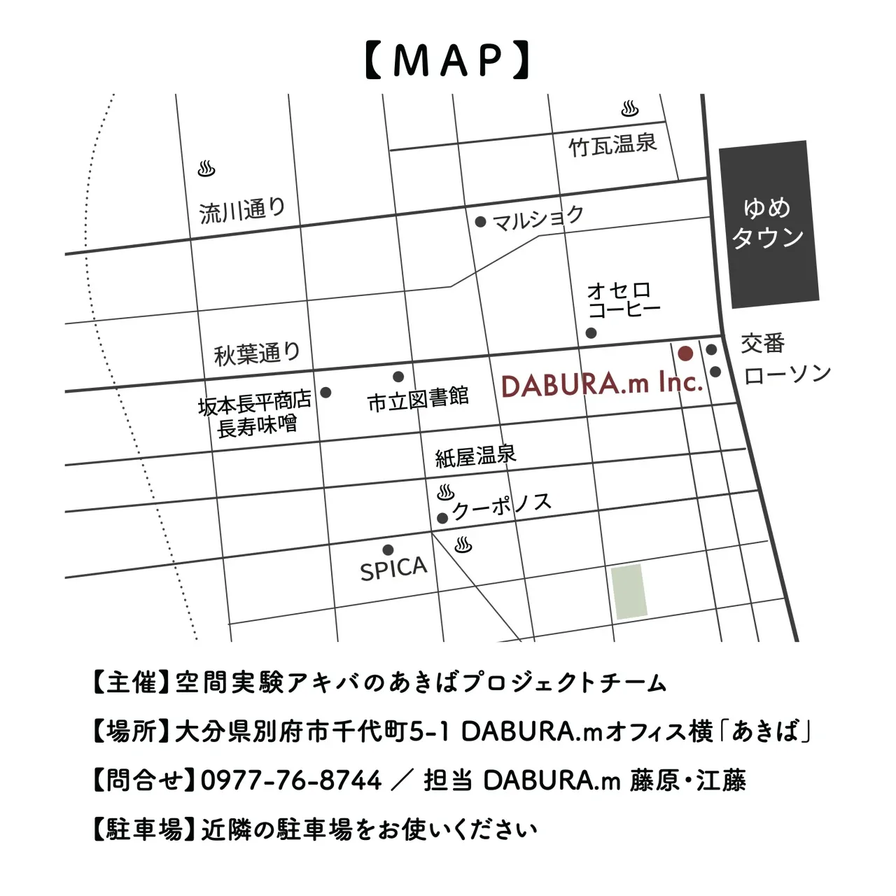 【場所】大分県別府市千代町5-1 DABURA.mオフィス横「あきば」