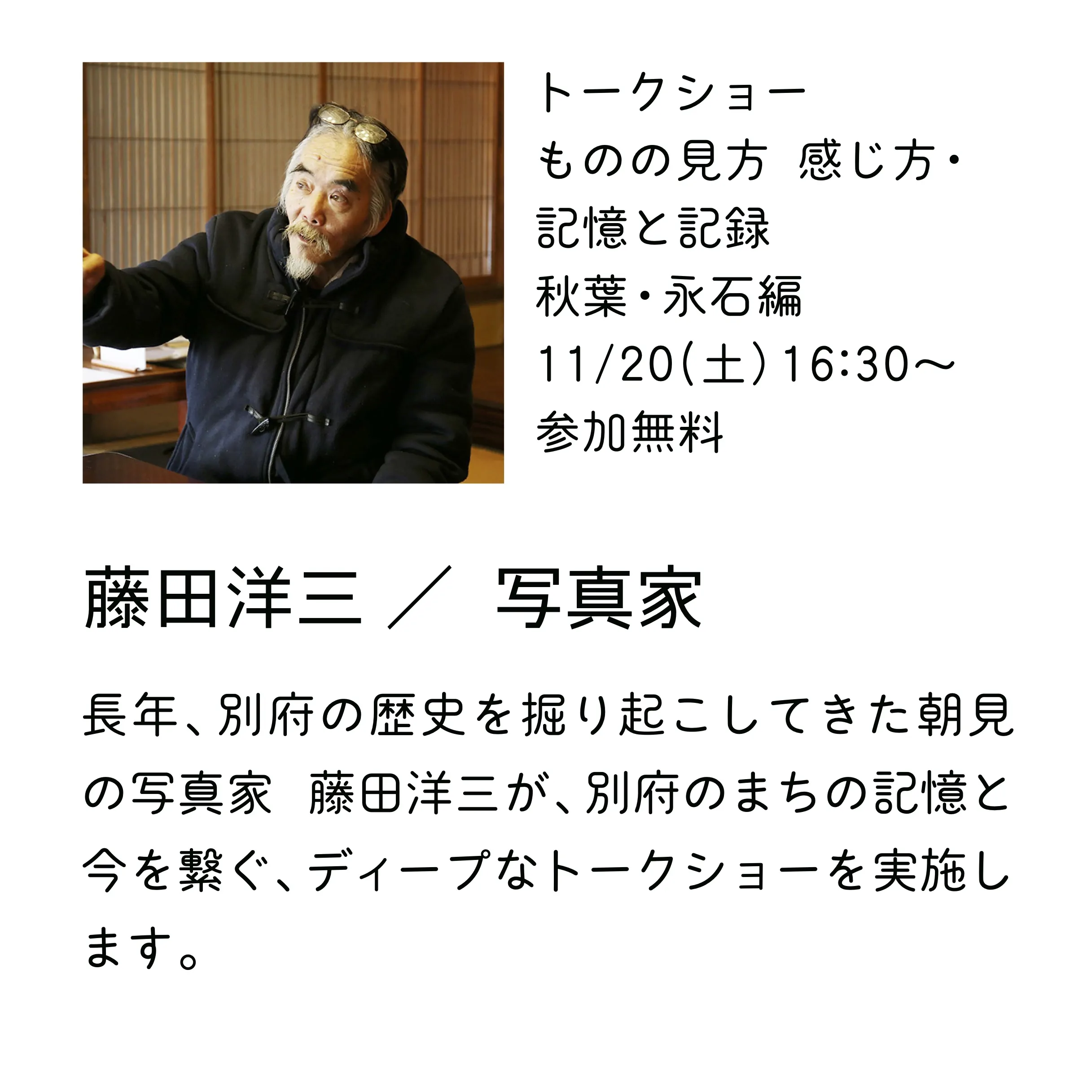 ●20(土)藤田洋三「ものの見方 感じ方・記憶と記録 秋葉・永石編」16:30~17:30(参加無料)/FOOD あきば購買部