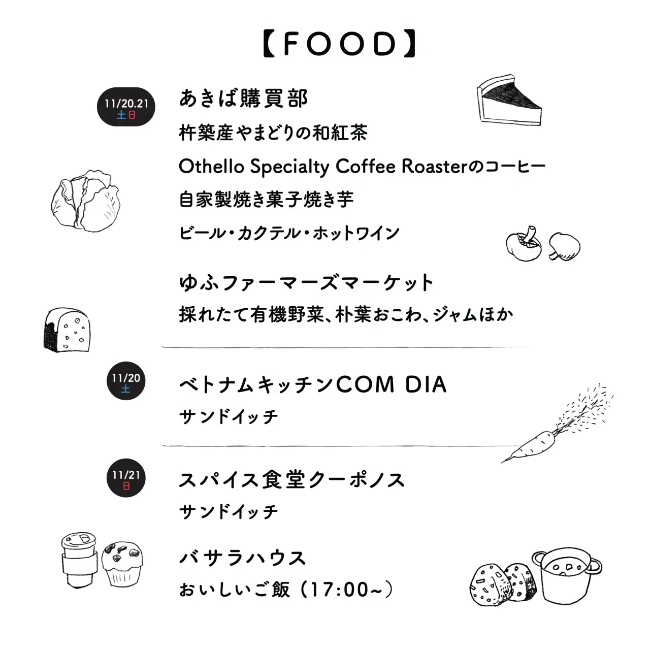 あきば購買部/スパイス食堂クーポノス/バサラハウス/ベトナムキッチンCOM DIA/ゆふファーマーズマーケット/やまどり/オセロコーヒー