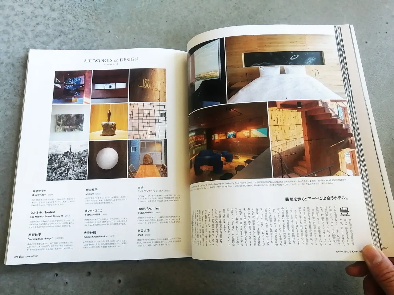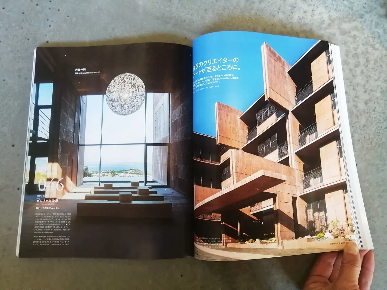 そして、弊社が手掛けた「GALLERIA MIDOBARU」も、「進化するデザイン温泉」Art部門にて、堂々の4p見開きでご紹介していただきました。