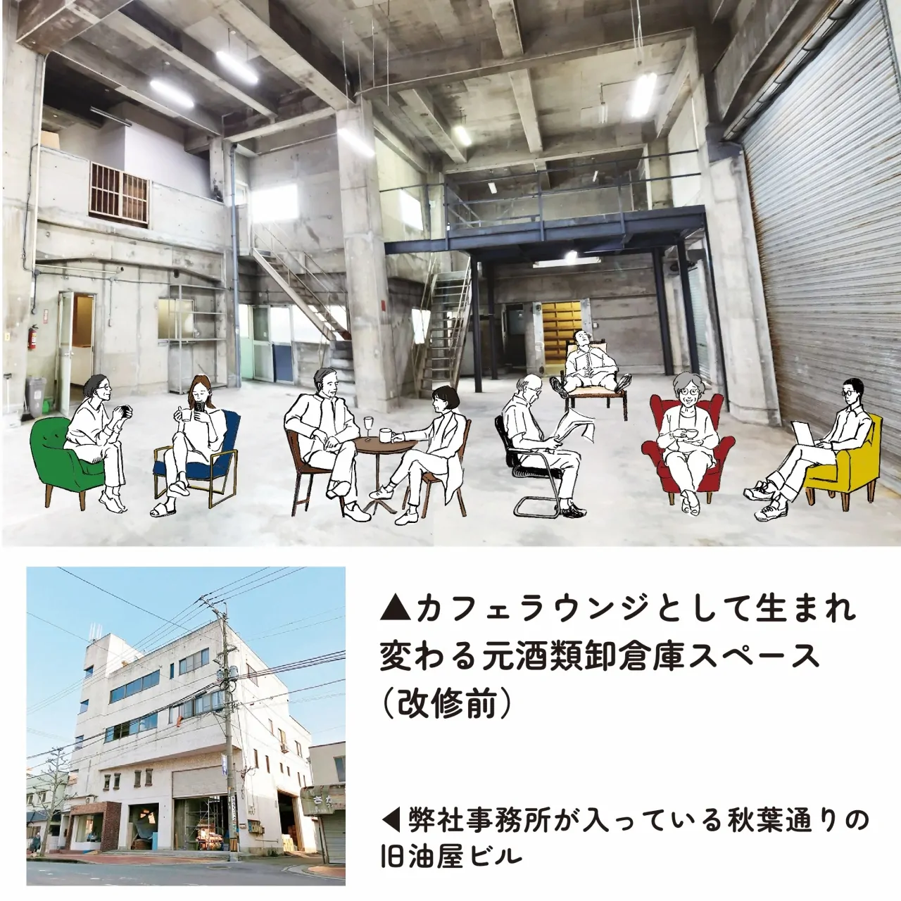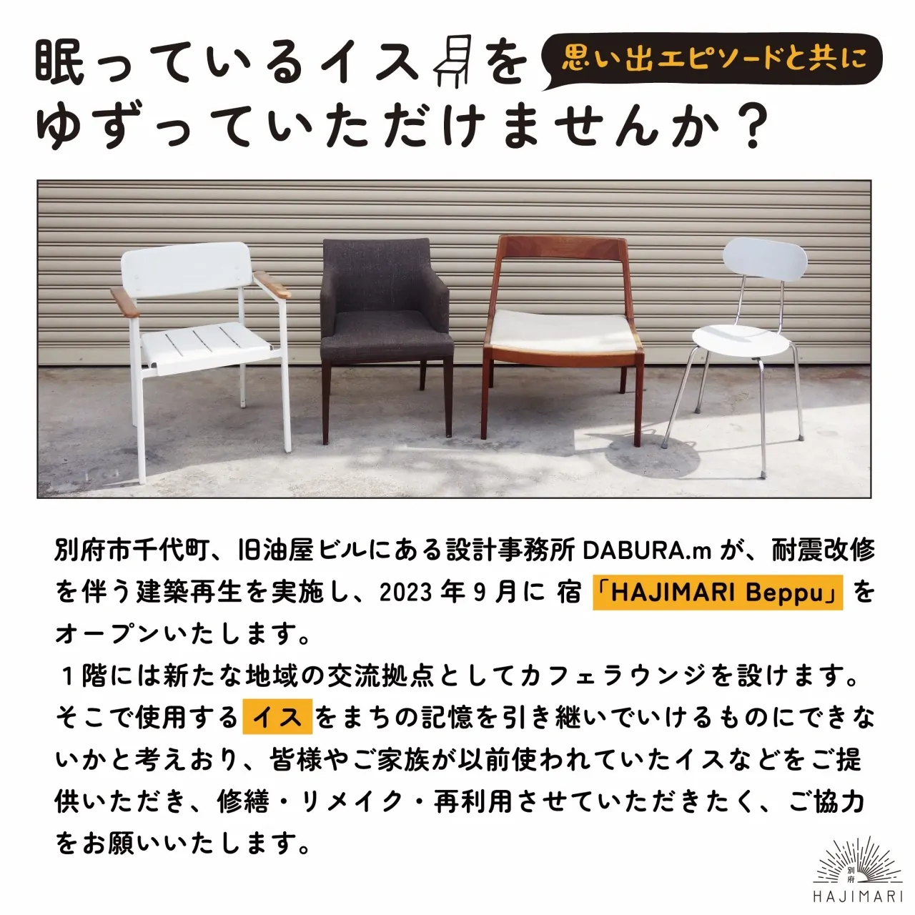 別府市千代町、旧油屋ビルにある設計事務所DABURA.mが、耐震改修を伴う建築再生を実施し、2023年9月に宿「HAJIMARI Beppu」をオープンいたします。1階には新たな地域の交流拠点としてカフェラウンジを設けます。そこで使用する椅子をまちの記憶を引き継いでいけるものにできないかと考えおり、皆様やご家族が以前使われていたイスなどをご提供いただき、修繕・リメイク・再利用させていただきたく、ご協力をお願いいたします。