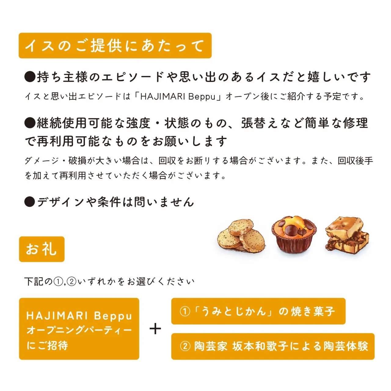 ●持ち主様のエピソードや思い出のあるイスだと嬉しいです イスと思い出エピソードは「HAJIMARI Beppu」OPEN後にご紹介できれば幸いです。 ●継続使用可能な強度・状態のもの、張替えなど簡単な修理で再利用可能なものをお願いします ダメージ・破損が大きい場合は、お引き取りできない場合がございます。また、お引き取り後に手を加えて再利用させていただく場合がございます。 ●デザインや条件は問いません