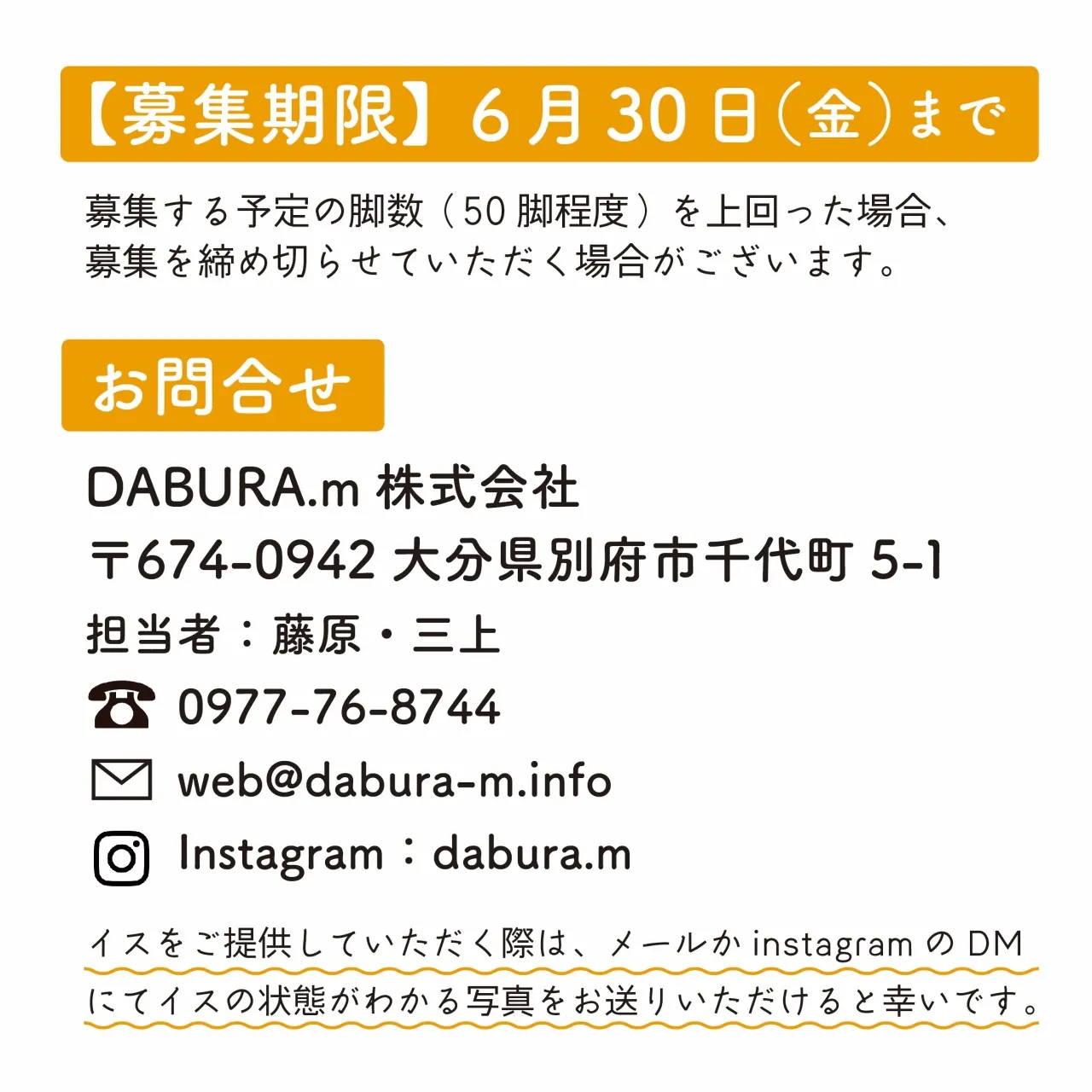 【お問合せ】 DABURA.m株式会社 〒674-0942大分県別府市千代町5-1 担当者:藤原・三上 TEL:0977-76-8744
