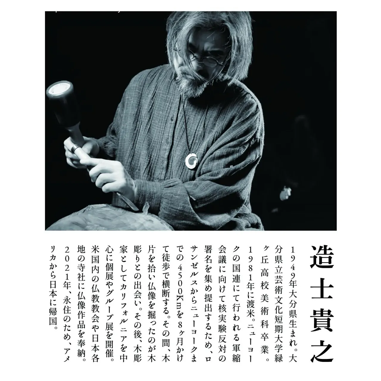 造士貴之(ぞうしたかゆき)さんは、大分県出身の木彫家です。1981年に渡米されて以来、長らく米国にてご活躍されていましたが、2021年に帰国し、現在は大分に拠点を移して制作されています。