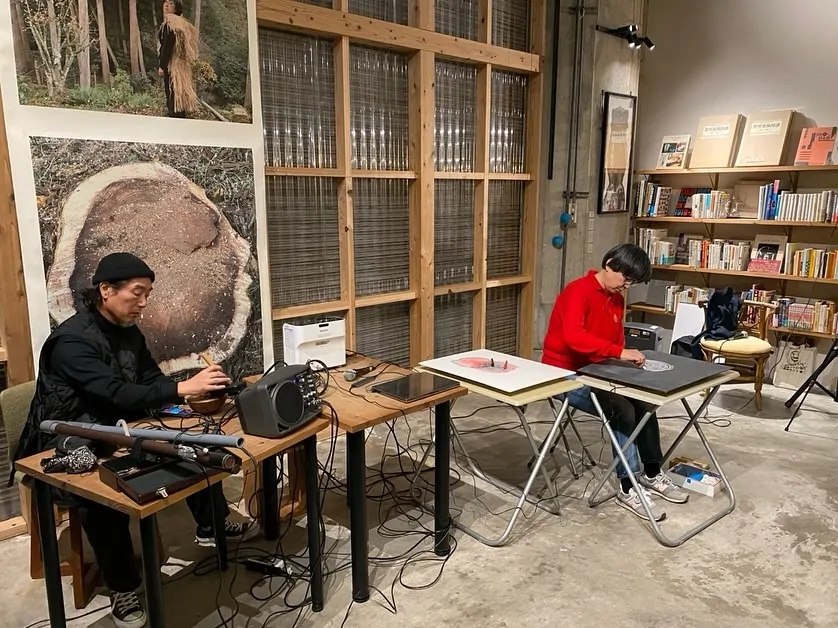 12月6日(金)はHAJIMARI BEPPU ARTIST BARが開催されました。ホストに諏訪眞理子さん、また共演者として江上靖さんをお迎えしました。諏訪さんが制作された「ツリー リングス ドローイング」のパズル、映像の上映、そして江上さんとのパフォーマンスという流れでしたが、諏訪さんの世界観にすぐ引き込まれ、心地よい空間が広がりました。諏訪さんのドローイングに江上さんの作り上げた音、お二人のセッションに魅了された、そんな夜でした。諏訪さん、江上さんありがとうございました。