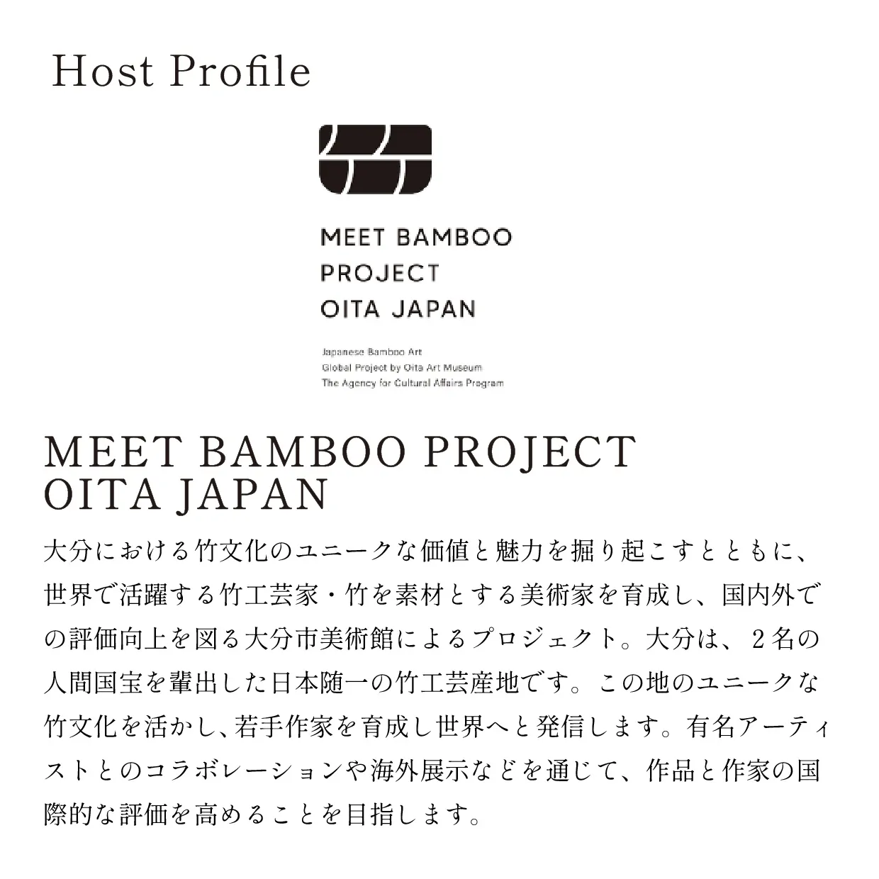 ホストは、MEET BAMBOO PROJECT OITA JAPANより、大分市美術館 館長の宇都宮 壽さんと、大分市美術館 学芸員の後小路 萌子さん、同じく大分市美術館 学芸員の曽我 俊裕さんを迎え、MEET BAMBOO PROJECT OITA JAPANとはなにか、その活動についてお話しいただきました。