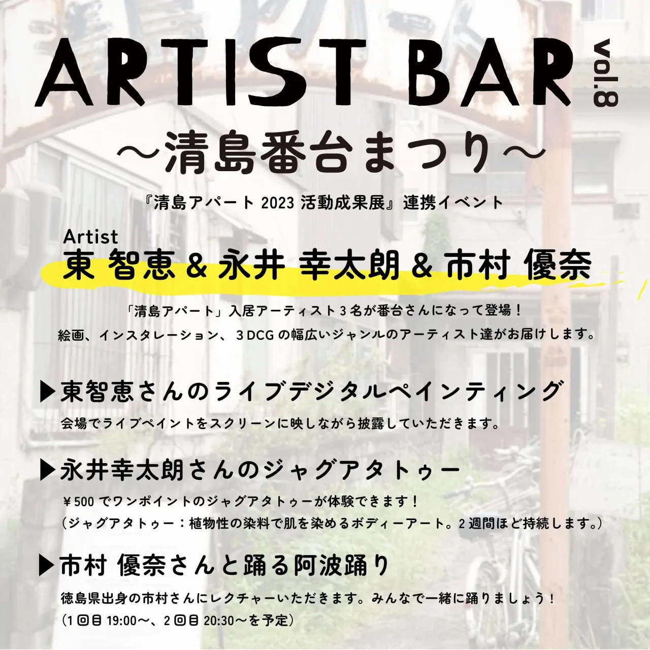 第8回目は、『清島アパート 2023 活動成果展』連携イベントとして、清島アパート入居アーティストの東智恵さん、永井幸太朗さん、市村優奈さんがマスターとなります。アーティストそれぞれの作品をご覧いただけるだけでなく、体験できるコンテンツもご用意しております。アーティストと過ごす特別な夜を、お楽しみください。