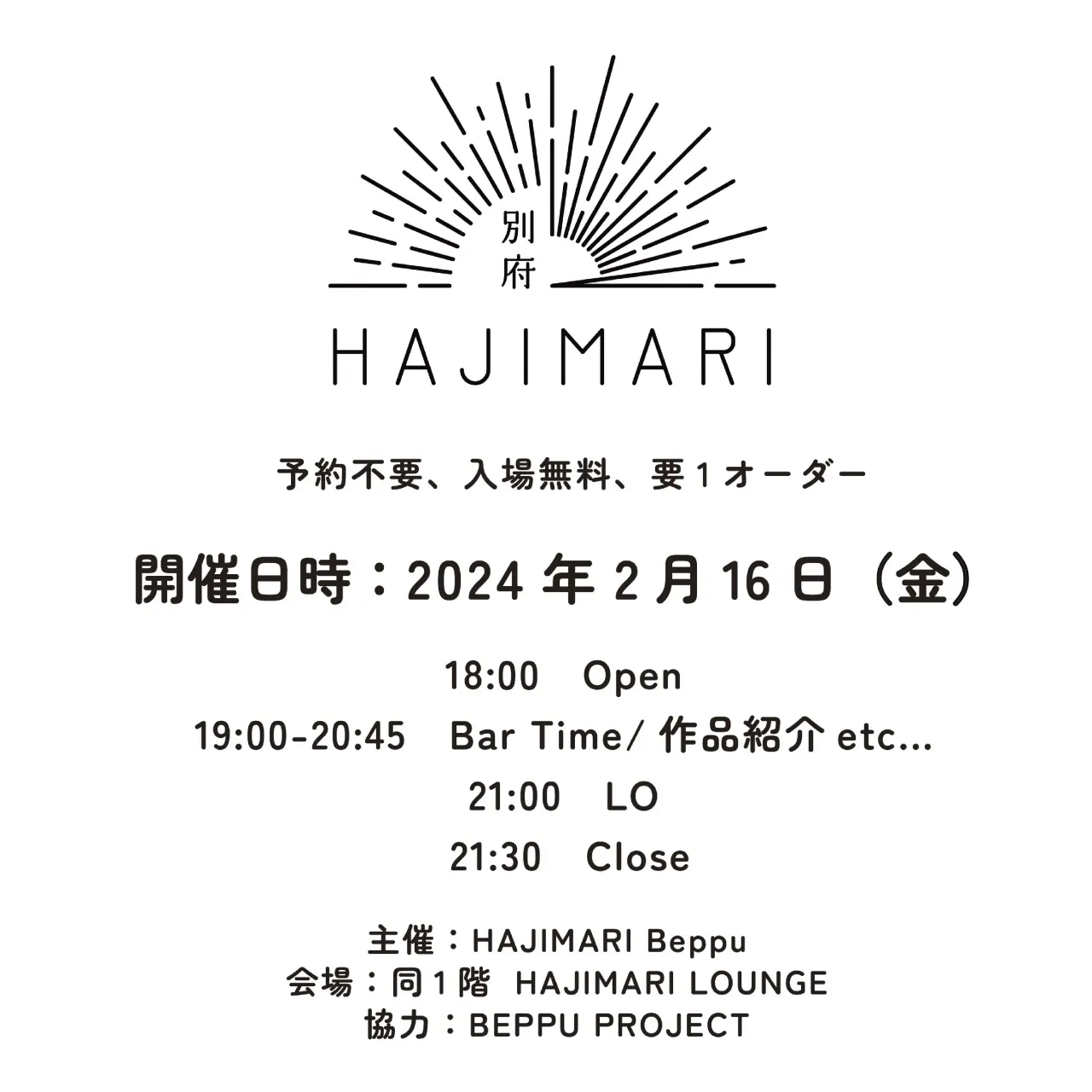 会 場:HAJIMARI LOUNGE (HAJIMARI Beppu 1階) 大分県別府市千代町5-1