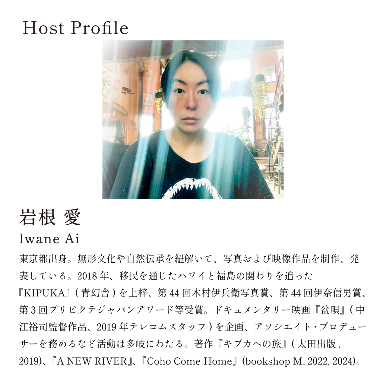 岩根愛さんはカリフォルニアのペトロリアハイスクールにて、オフグリッド、自給自足の暮らしの中で学び、1996年より写真家として活動を開始。2006年よりハワイにおける日本文化に関心を深め、2011年以降は福島とアメリカをつなぐ移民史をテーマに取材を続けています。写真集『KIPUKA』(青幻舎、2018年) は、第44回木村伊兵衛写真賞、第44回伊奈信男賞、2022年Prix Pictet Japan Awardなどを受賞。また、ドキュメンタリー映画『盆唄』(中江裕司監督作品、2019年テレコムスタッフ) を企画、アソシエイト・プロデューサーを務めるなど、活動は多岐にわたっています。精力的なフィールドワークをベースに、無形文化や自然伝承を紐解いて、写真および映像作品を制作・発表されています。