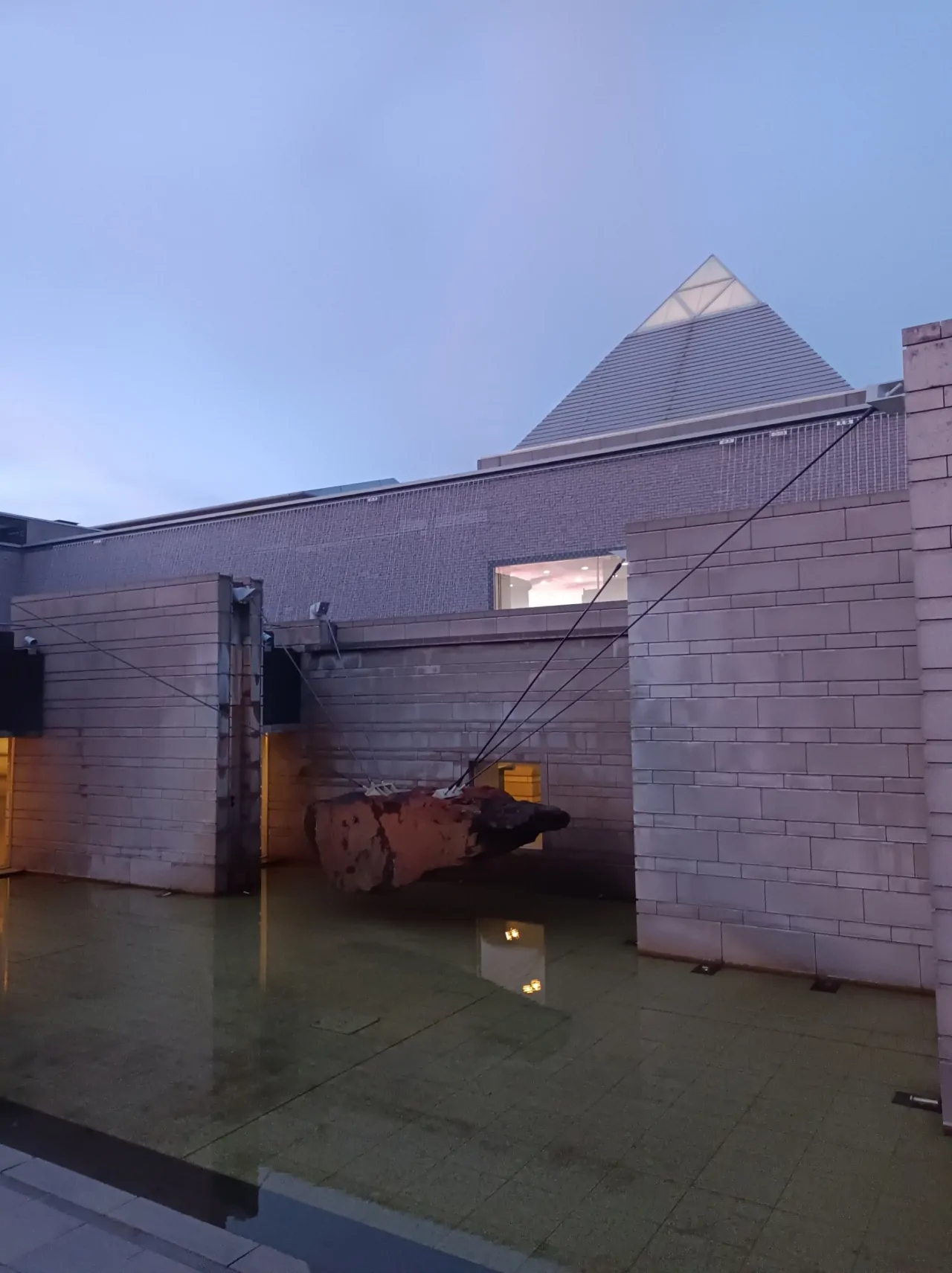 まず圧倒されたのは、展覧会の舞台である水戸芸術館そのもの。形やスケールの異なる“島”のような建物がつながる独特な構成で、展覧会のテーマ「群島としての建築」を体現しているかのようでした。広場には高さ100mのタワーや、浮遊するように吊られた石「カスケード」の存在感もすさまじく、建築とアートが地続きで存在しているような不思議な感覚を覚えました。