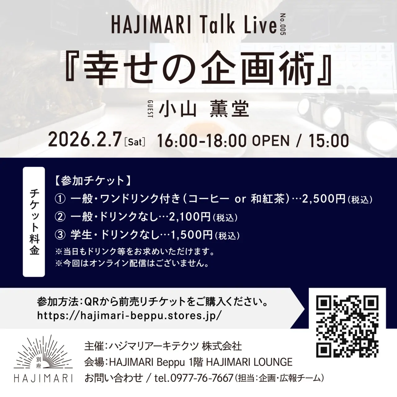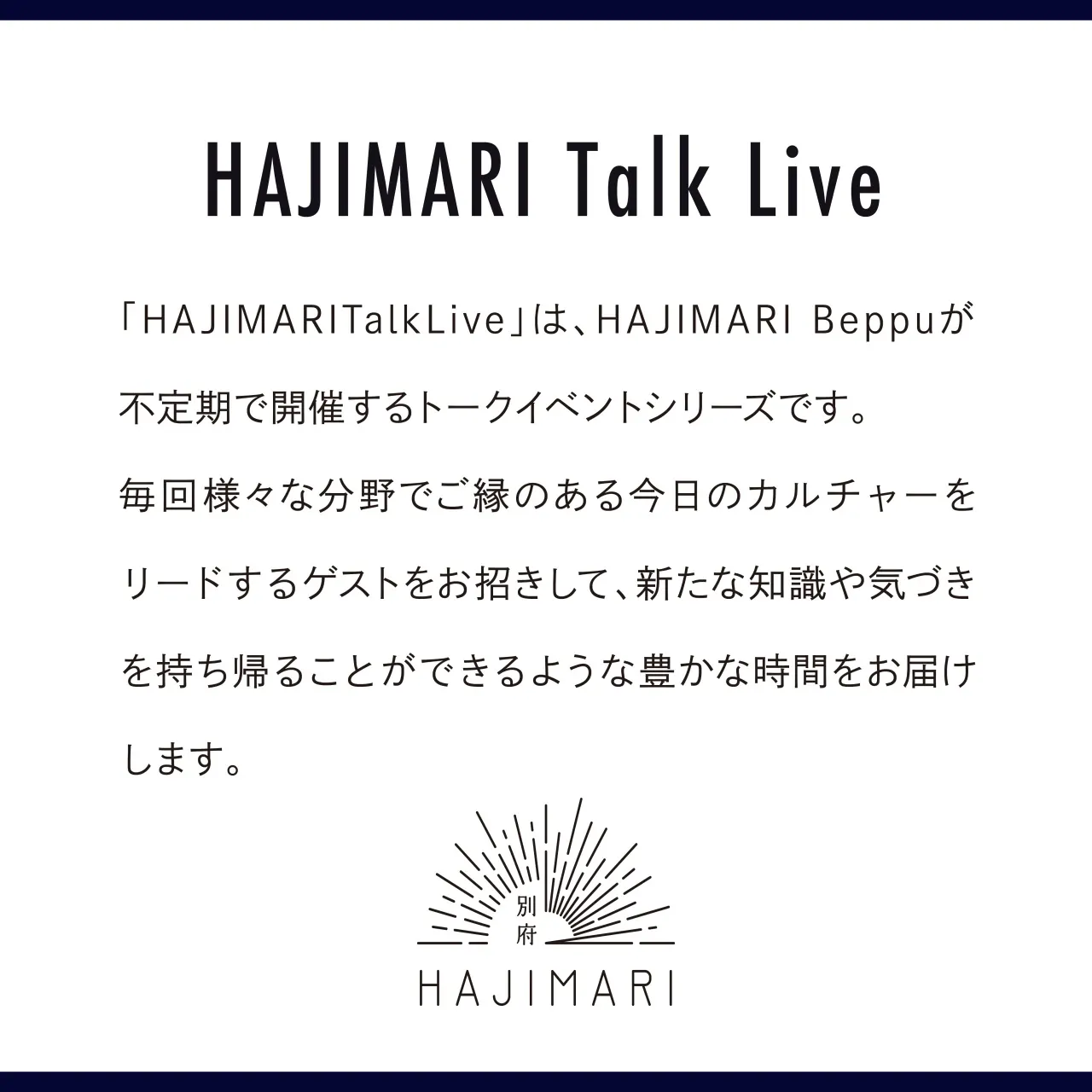 HAJIMARI Talk Liveは、HAJIMARI Beppuが不定期で開催するトークイベントシリーズです。毎回様々な分野で今日のカルチャーをリードするゲストをお招きして、新たな知識や気づきを持ち帰ることができるような豊かな時間をお届けします。