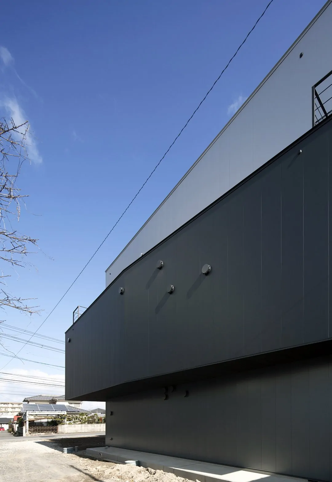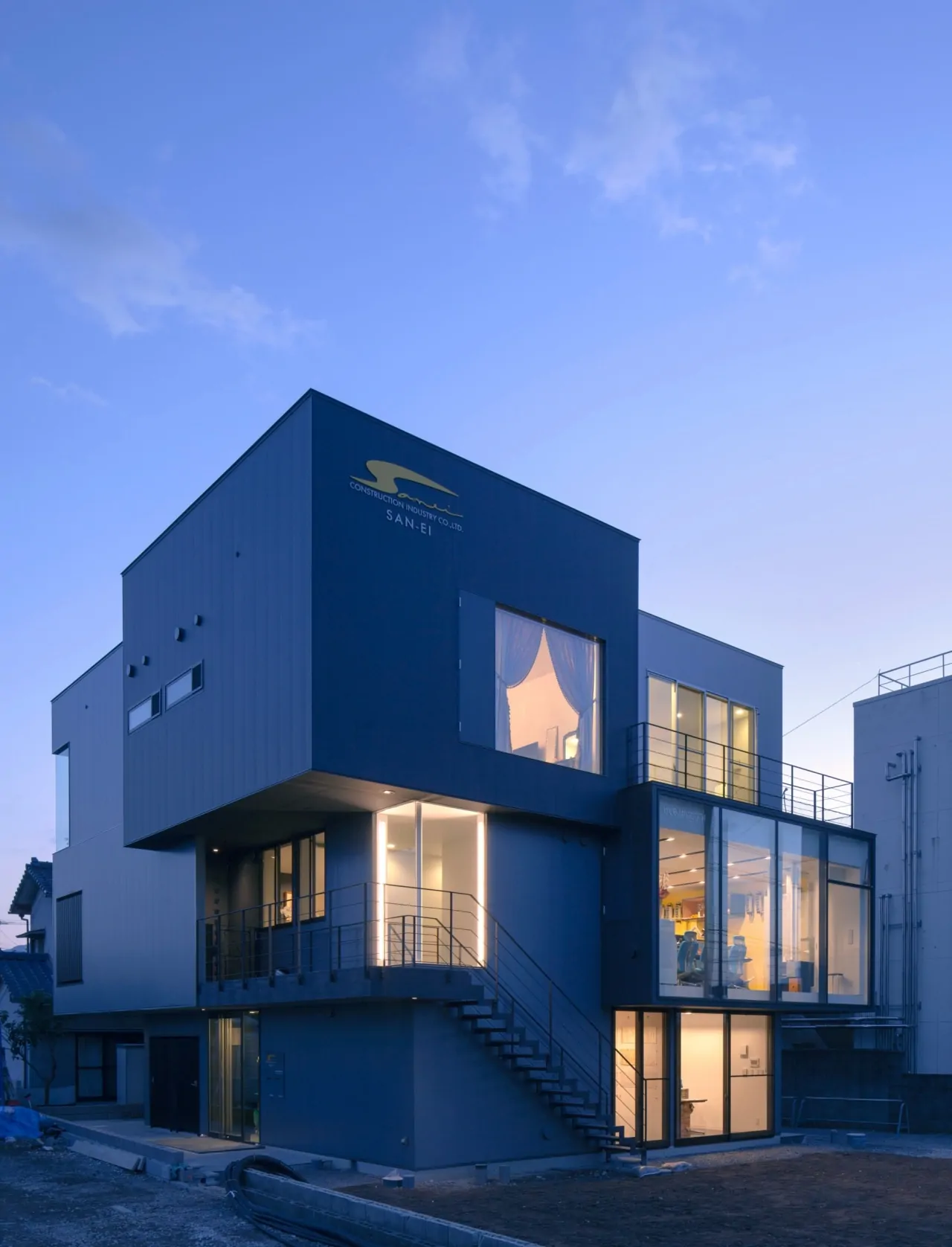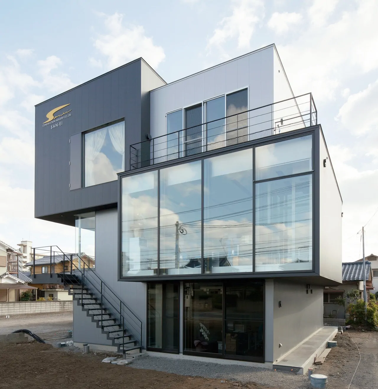 大分市に建つ、住宅と建設会社社屋の複合建築物。鉄骨造3階建て。各階に要求された用途や面積の違いを無理してひとつの箱に整えず、そのまま建築物の凹凸としている。室内に柱型を出さないようブレース構造として、125mm角の鉄骨柱材を採用。木造に近い感覚での空間構成を実現している。鉄骨造の強みを活かしてキャンティレバーを多用し、各階の面積をそのまま凸凹させることで、この建築の特徴としている。各階の凸凹は上にテラス、下に日除けや軒下空間をつくりだしている。