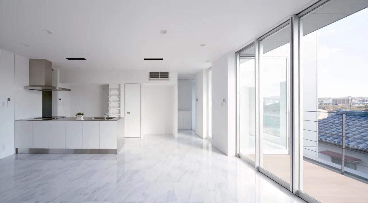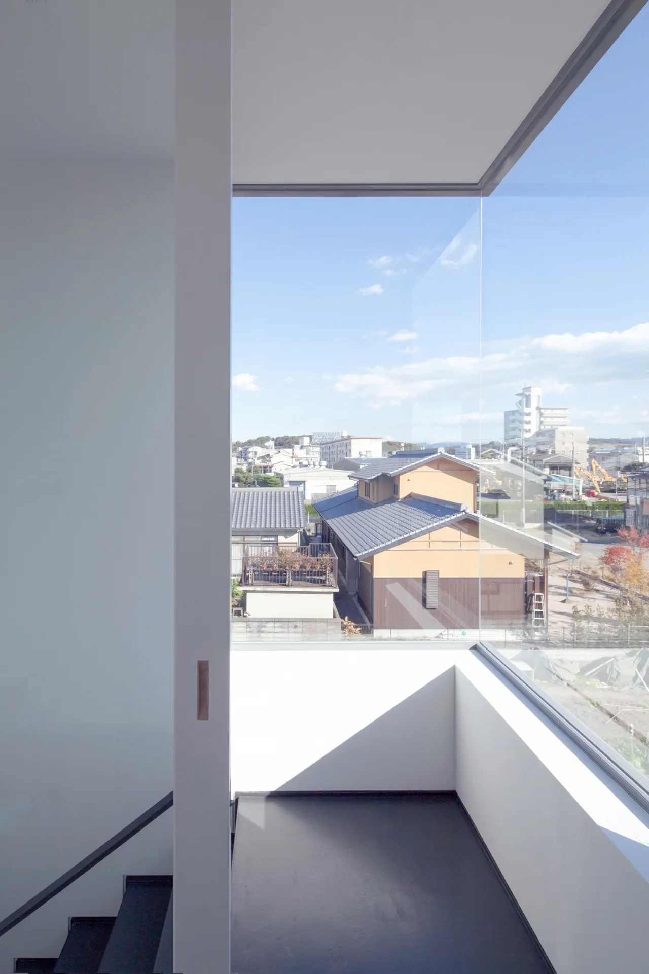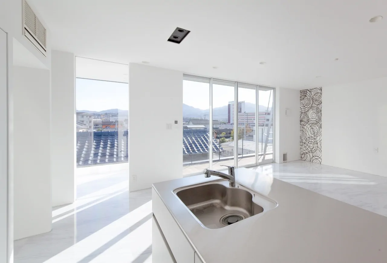 大分市に建つ、住宅と建設会社社屋の複合建築物。鉄骨造3階建て。各階に要求された用途や面積の違いを無理してひとつの箱に整えず、そのまま建築物の凹凸としている。室内に柱型を出さないようブレース構造として、125mm角の鉄骨柱材を採用。木造に近い感覚での空間構成を実現している。鉄骨造の強みを活かしてキャンティレバーを多用し、各階の面積をそのまま凸凹させることで、この建築の特徴としている。各階の凸凹は上にテラス、下に日除けや軒下空間をつくりだしている。