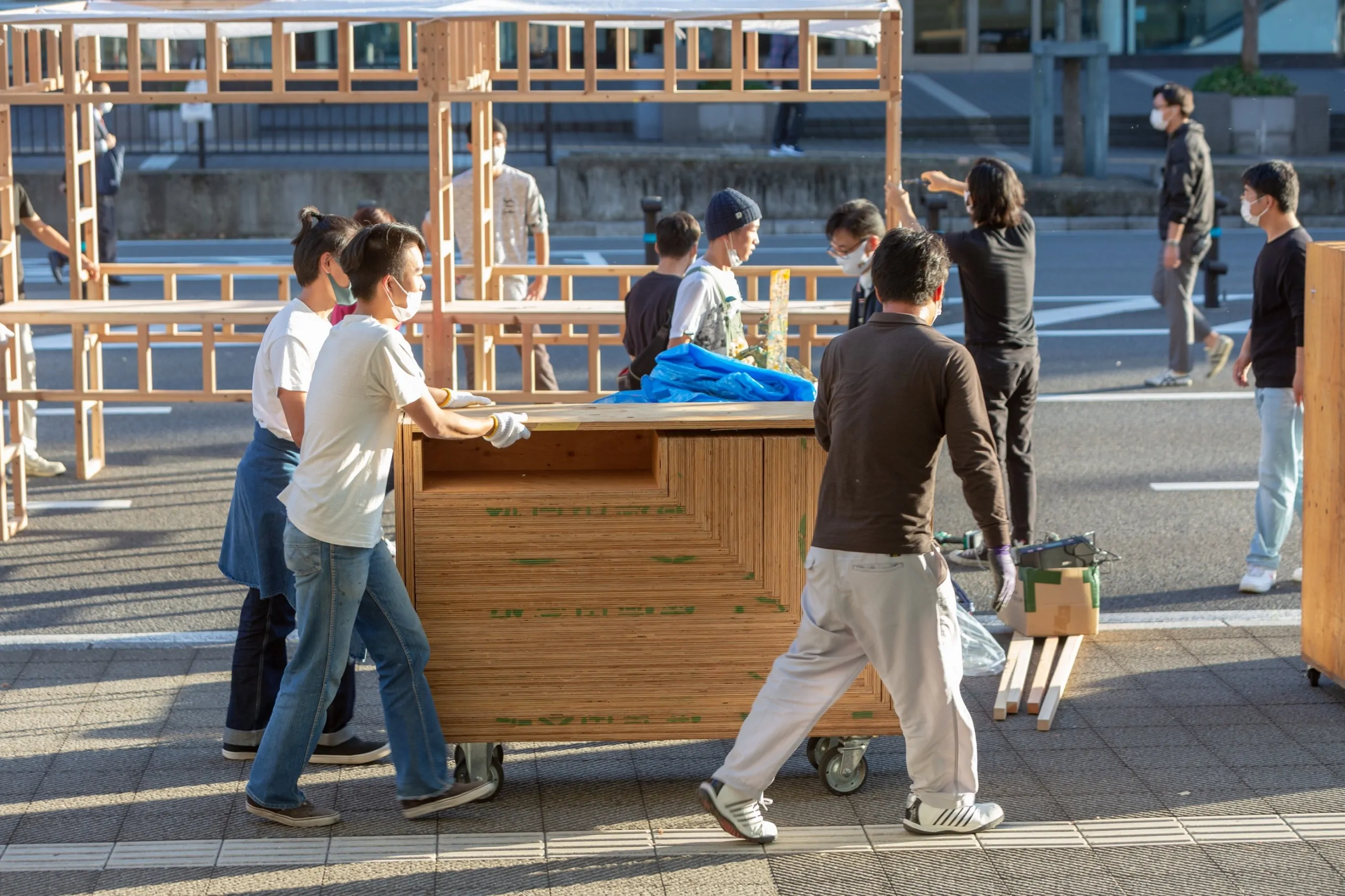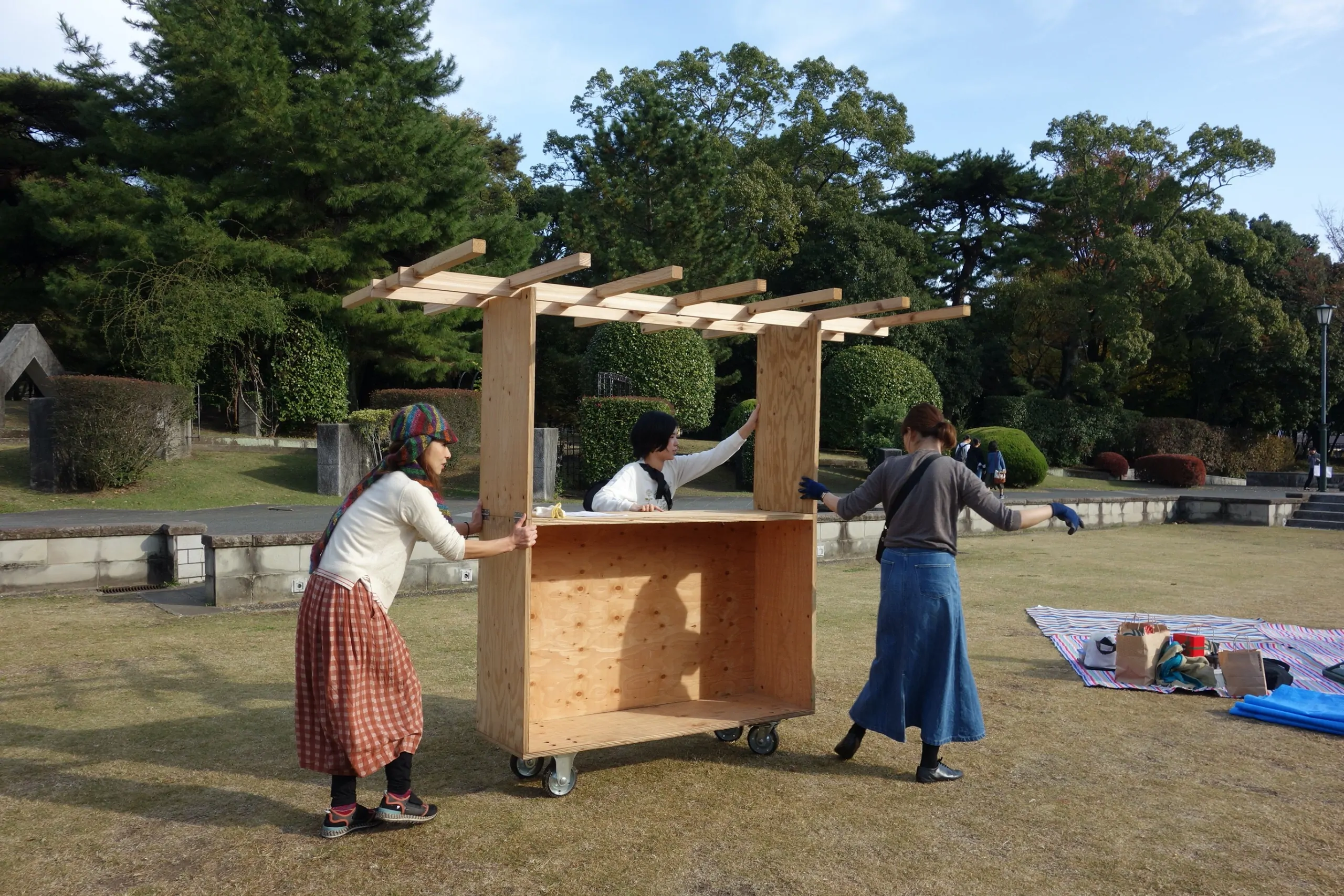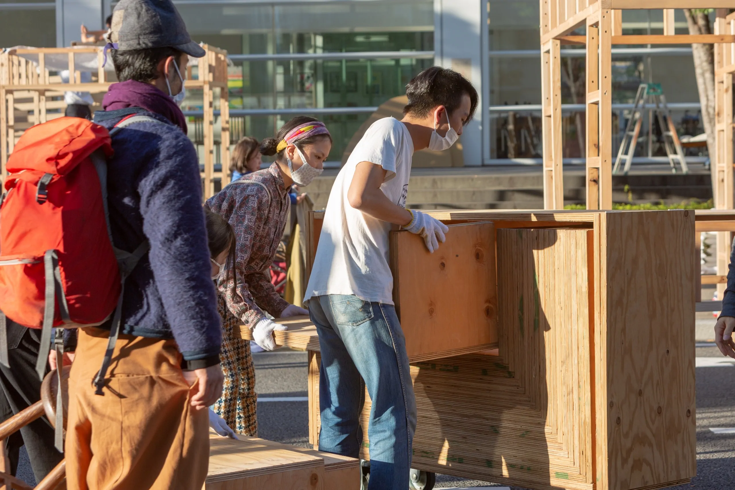 現代の都市では様々なパブリックスペース(広場や公園など)が作られているが、それらはあまり自由に創造的に使われていないことが多い。それは、スペースがあってもそこに参加するきっかけがデザインされていないからではないかと考えた。パブリックスペースを誰もが創造的に使いこなせるようにするためのツールを作りたいと考え、可動建築「モクカイ」を設計した。もちろん、既存の屋外家具やストリートファニチャーなども存在するが、それらはすでに用途が確定している。そうではなく、用途が確定していないパブリックスペースの状態に近い、使う人が自然と使い方を創造しながら場所に参加してもらえるような、可動式で簡単に組み立てられる設えが必要と考え設計した。