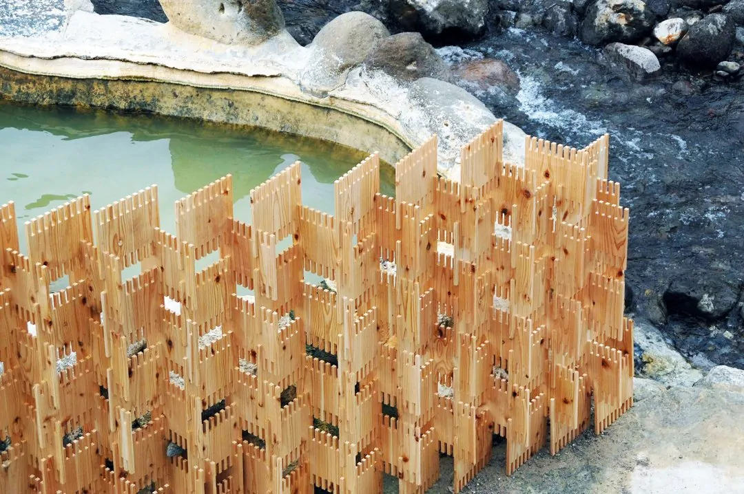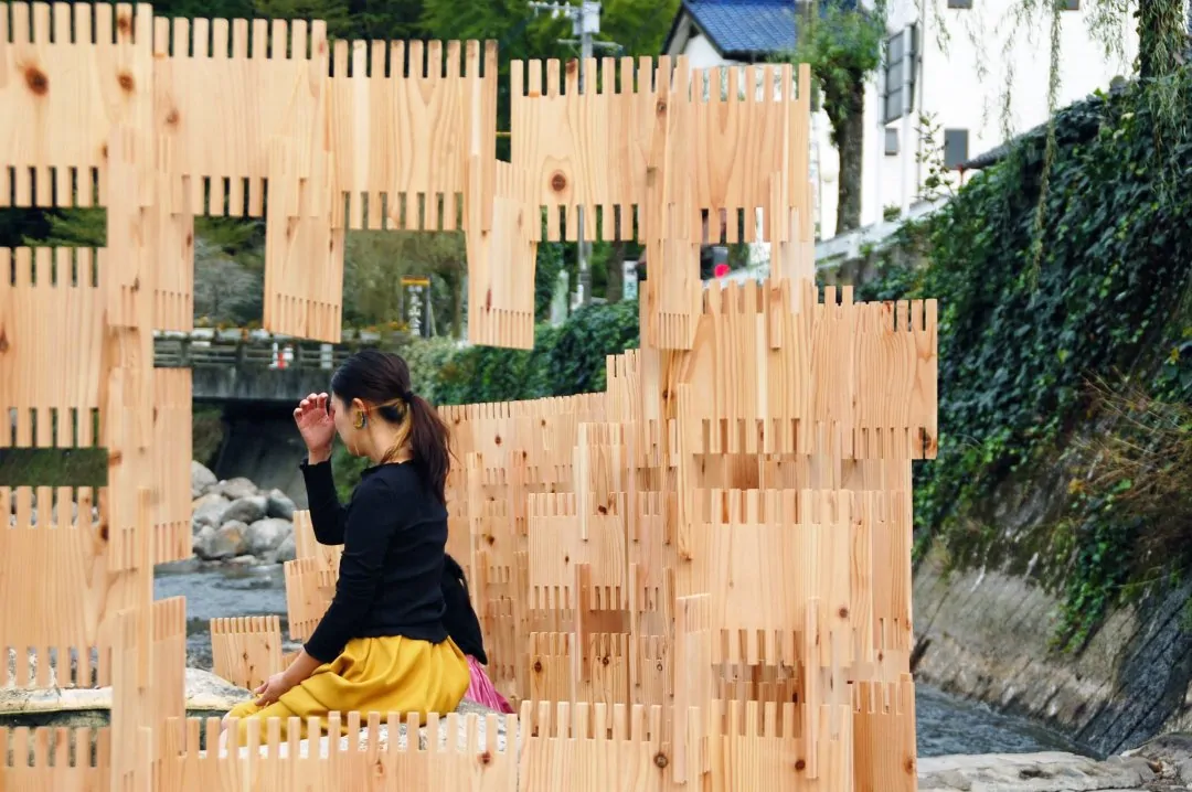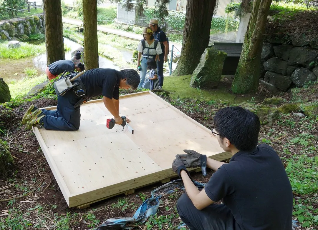 今回用いた「KU-SHI」は、竹田アートカルチャーからの特注で、大分産無垢スギ材パネルを、両側に10本の歯を持った櫛状の形に切り抜いたパーツ。泉水湧水公民館及びその隣接地にて、可動茶室組み立てワークショップを実施した。二回目の茶会はガニ湯温泉に足をつけながら楽しめる、秋の長湯温泉に訪れる人をもてなす茶会が開催された。