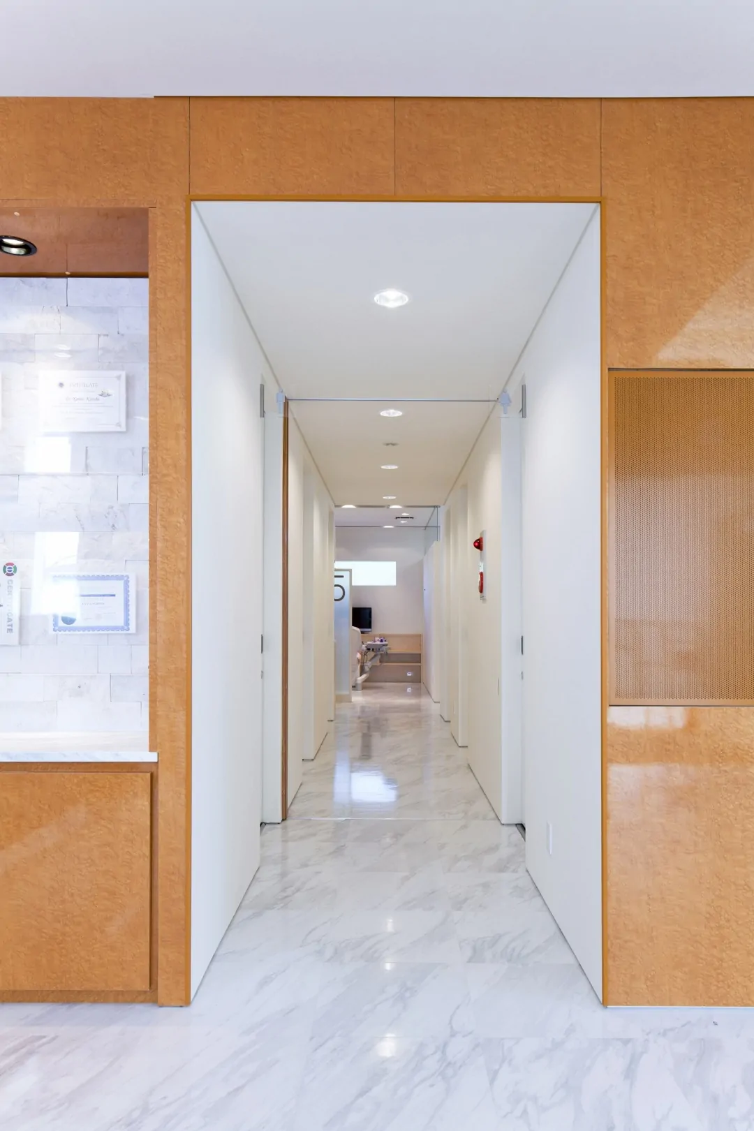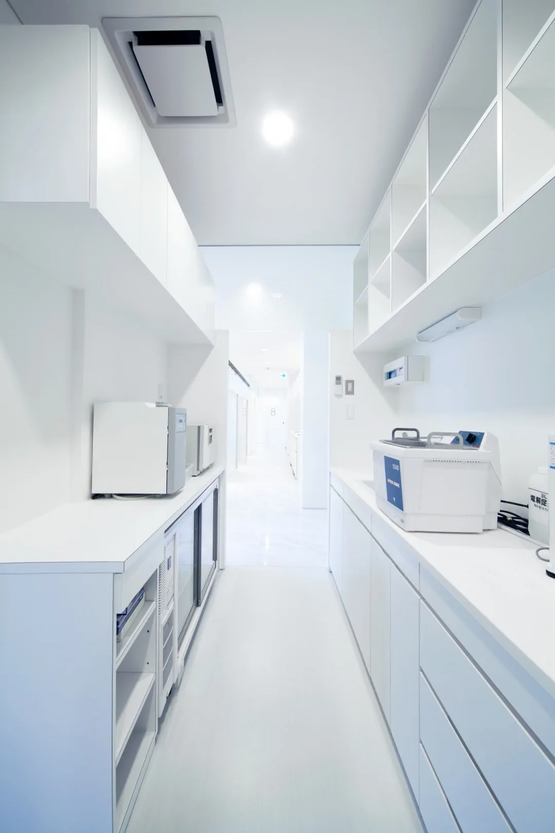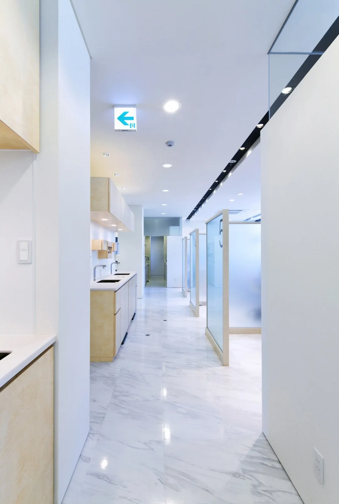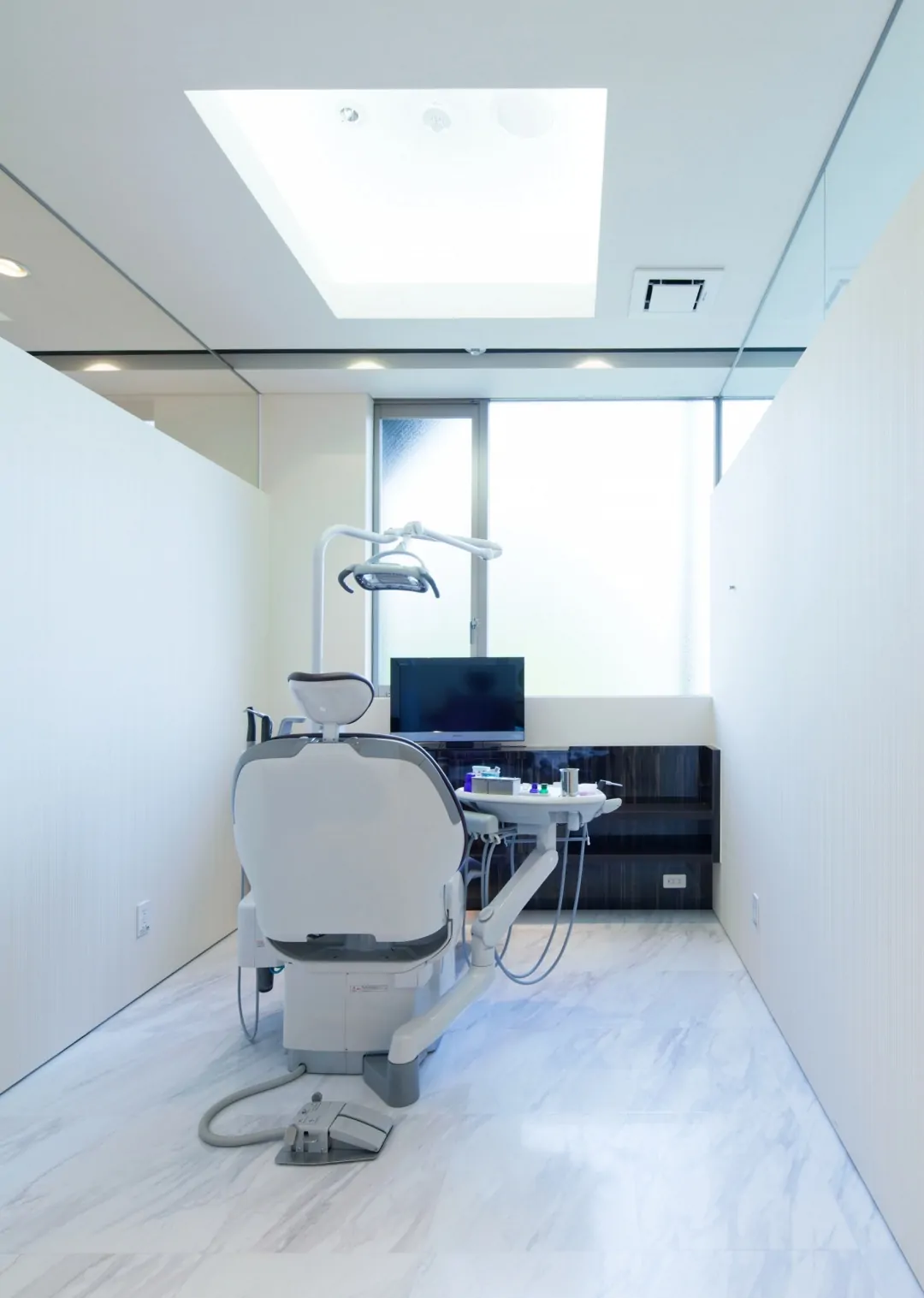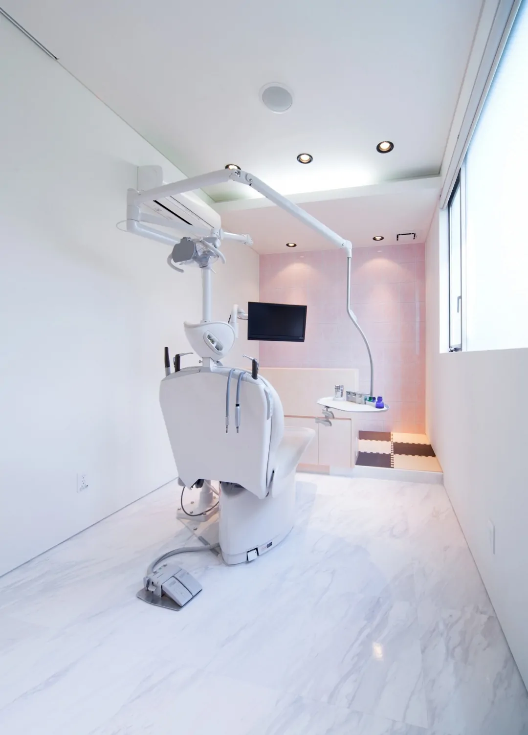 築30年の建物を、新たな歯科クリニックとして再生している。元の建物は、1階が診療台4台の歯科クリニック、2階は100坪程の住宅であった。それを、1階は全て駐車場とし、エレベータと階段を増設して、2階の広い空間を診療台9台(一般診療用4ブース、初診診療ルーム1室、審美歯科ルーム2室、オペ専用ルーム1室、子供遊戯コーナー併設診療ルーム1室)、カウンセリングルーム2室、子供用プレイロット、PCカルテ・画像検索コーナー、消毒コーナー、技工室(技工士3名まで作業可)などからなる総合歯科クリニックとして再生した。再生建築ならではの空間的ゆとりがあればこそ、多機能をローコストで実現できている。外観は、既存建物の特徴を活かしながらもデザインを一新。通りからの視認性が高められ、街の目印的存在となっている。内観は、安らぎと清潔感のある空間に。女性向けパウダールームなども充実させた。工事にあたっては、2階部分を先に完成させ、1階から2階に引っ越した後に1階を解体、駐車場とする「診療しながら再生」を実施。工事中も診療に切れ目を生じさせなかった。