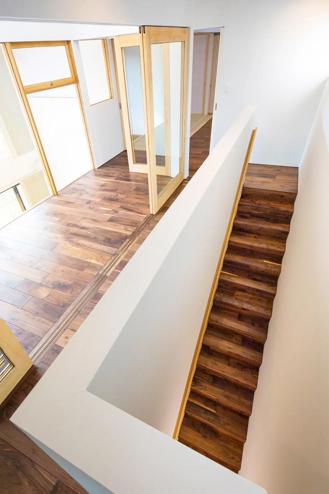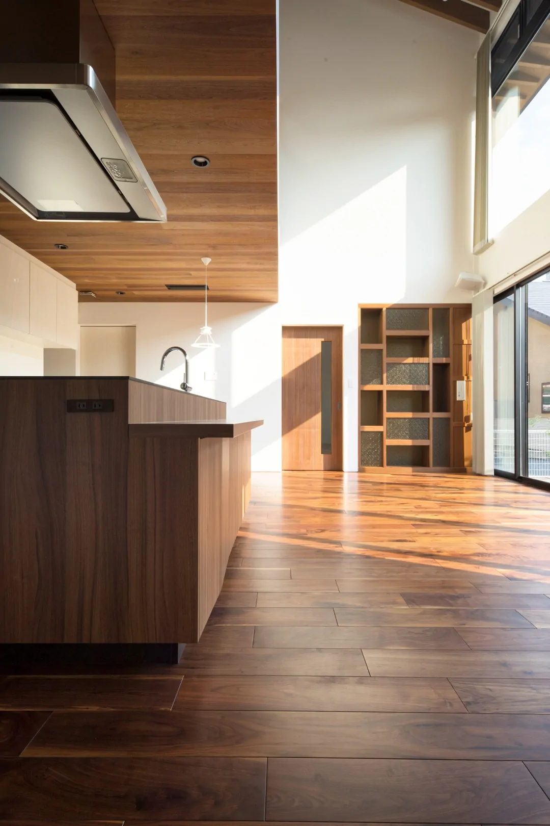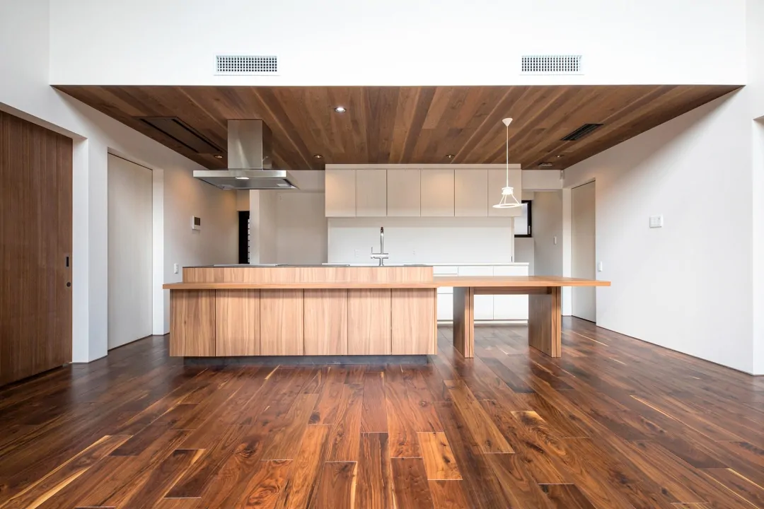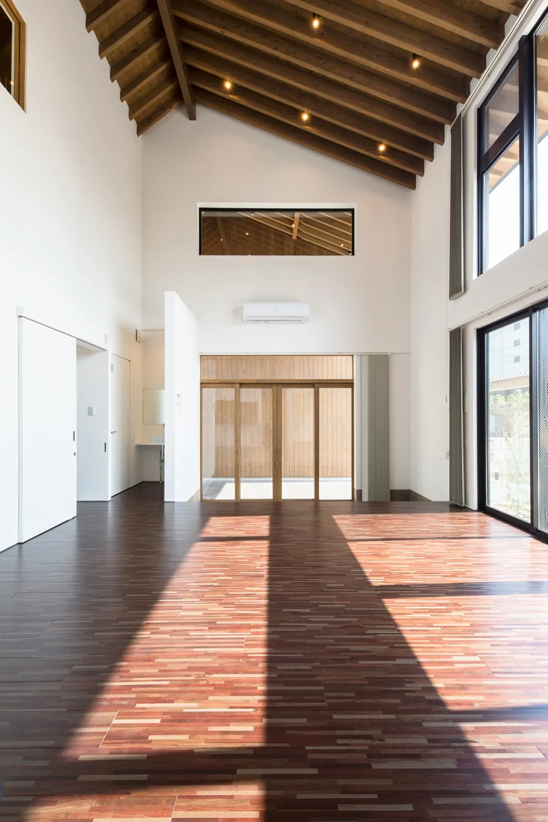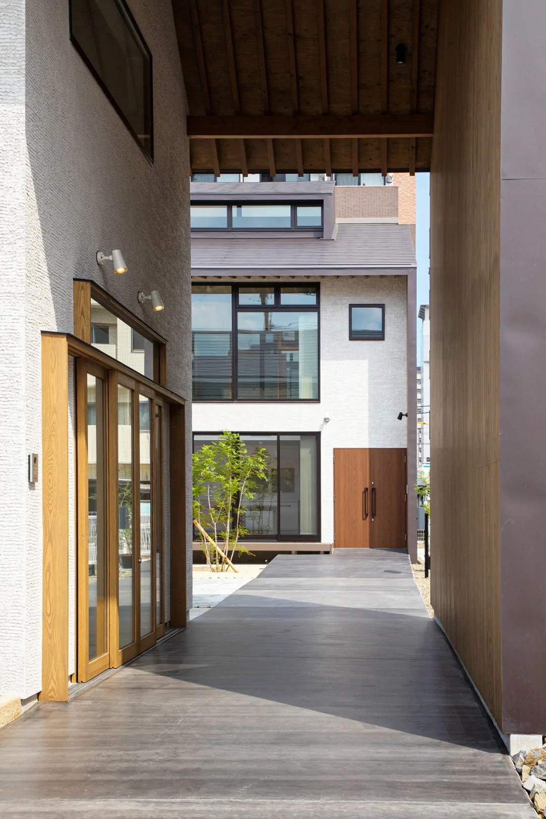 市部の広い敷地に2棟で構成される住宅。「母屋」と「離れ」は中庭とアプローチの通路で結ばれている。パブリック性の高い「離れ」から落ち着いた「母屋」に向かって、中庭を解しながらグラデーショナルに空間が連なっている。「母屋」の方は、ダイニングキッチン、リビングから2層の吹抜けを介して、2階に設置されたインナーバルコニーへ、立体的に空間がつながっている。各諸室は立体的な一つの空間に面している。リビングは南面からの大きな開口があり、光が多く入る開放的な空間である。インナーバルコニーには、ハイサイドライトが設けられていて、柔らかい光が頭上から降り注ぐ。家全体に風が抜けやすくなっている。「離れ」は、プライベートな集まりごとに加えて地域に開放されることもあり、子どもたちが集まって食事をしたり読書をしたりすることもある。