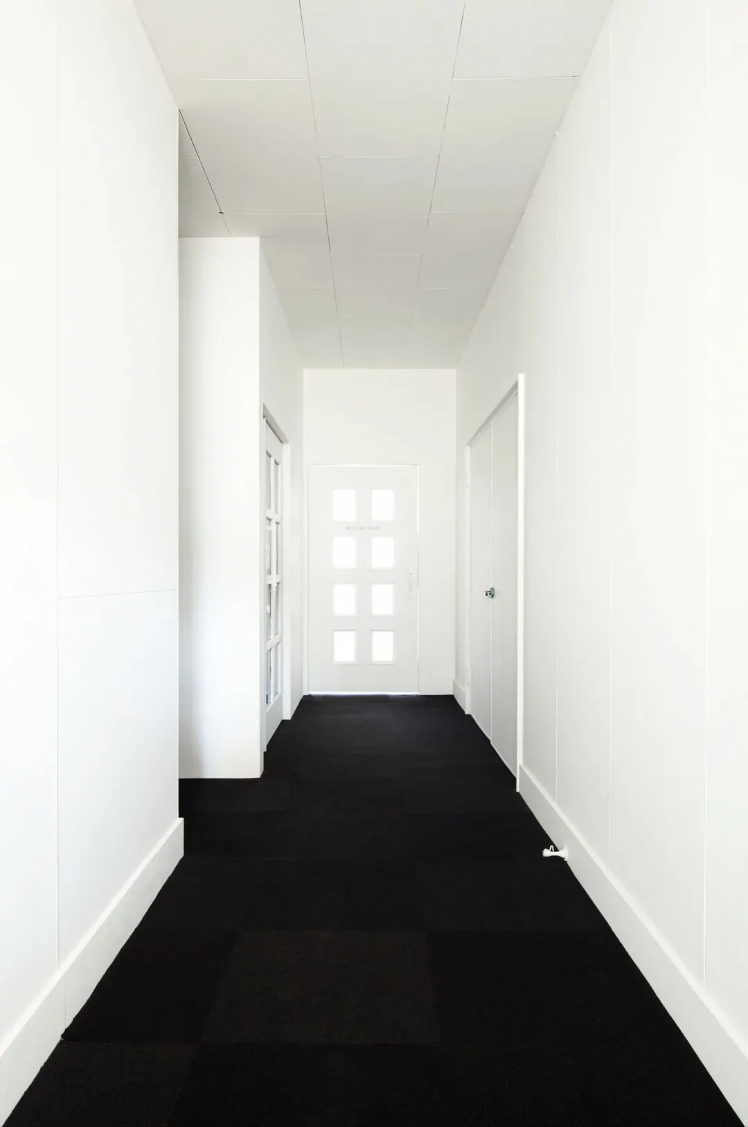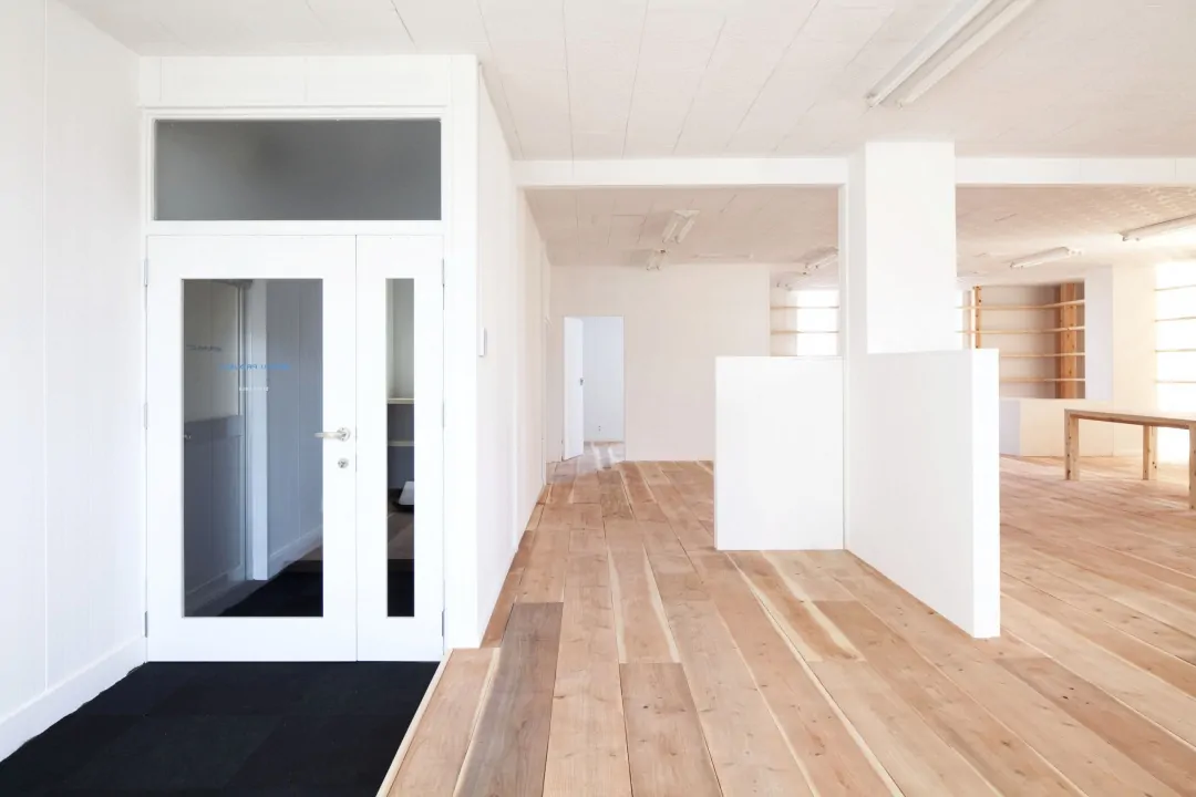 既存の空間は、長期間利用されていない工務店の2階事務室。余分なものを排除し、白を基調とした明るく大きな一室空間へ。床は作業していても暖かい様に地元の木を使い、壁面には書類等がたくさんの収納ができるよう、シェルフとライトシェルフ(光を拡散して室内に反射させるための板)を兼ねた棚がぐるりと連続している。