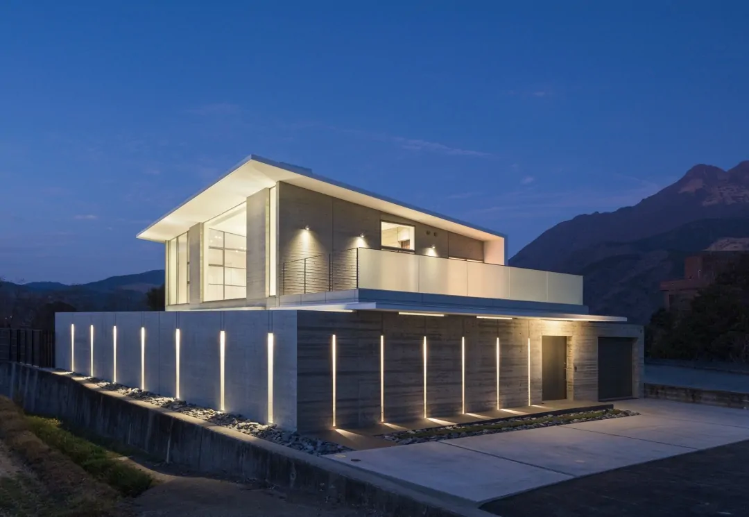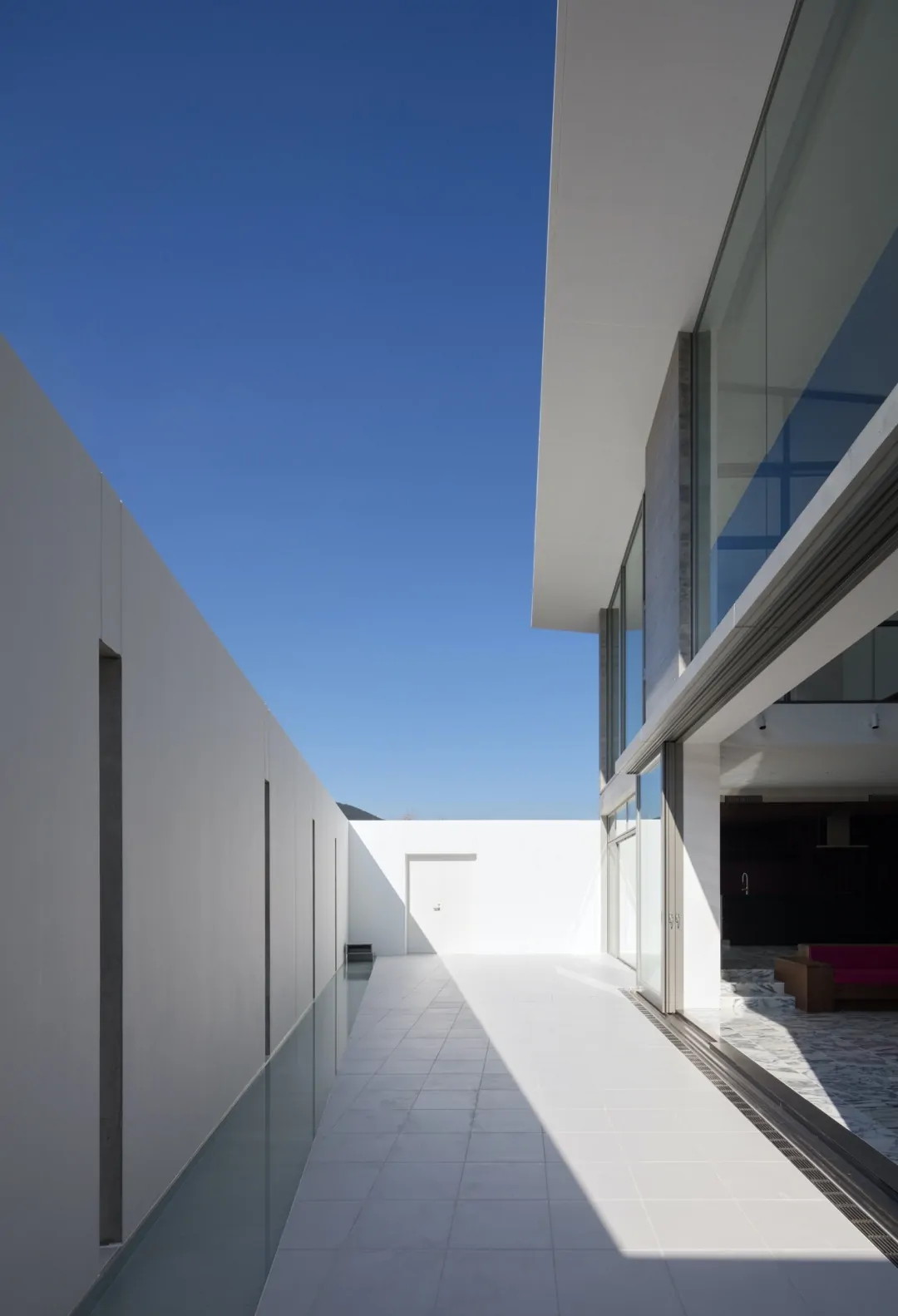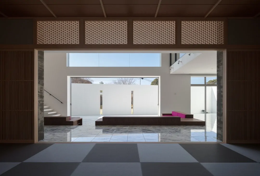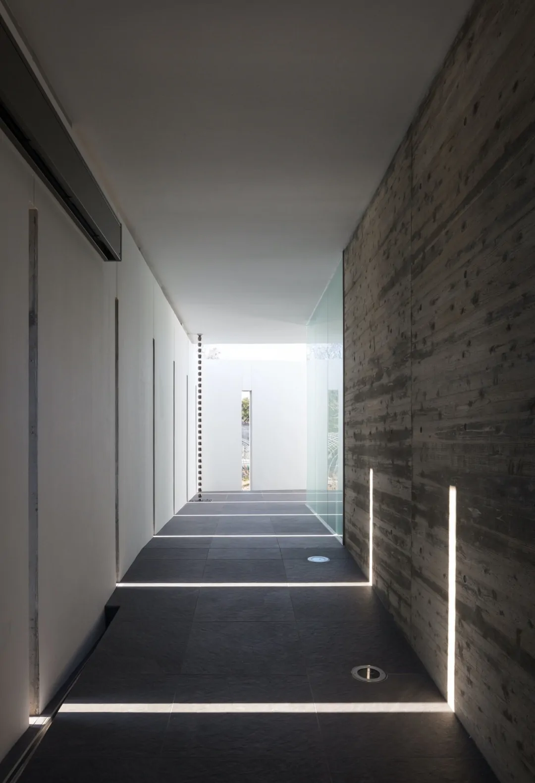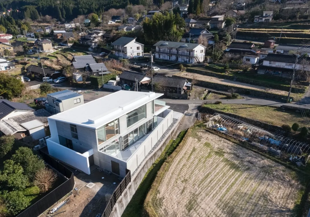 湯布院盆地の田園地帯に建つ住宅。この住宅を考えるにあたり、見通しの効く平地であるため、クライアントは適度にプライバシーを保ちながらも、周囲の環境とつながりのある居住環境を求めました。居住エリアと外部環境との間には、連続するスリットが開けられた壁と、それによって生じる中間領域を設けています。この中間領域は、屋根のない一層の建築空間とも言えます。田園地帯の外部環境、中間領域、セミパブリックな内部空間、個の空間が途切れることなく連続的に連なっていく空間構成としました。住居内の空間からはスリットを介して、または二層目に解放された空間を介して、外部の環境や湯布院の風景と繋がることができます。外部からこの建築を見た時には、居住者と直接的に視線を合わせることはないですが、外部と内部のつながりを認識できる部分が多くあるため、閉鎖的な印象は受けません。