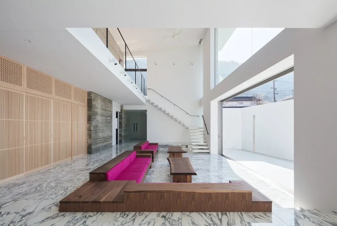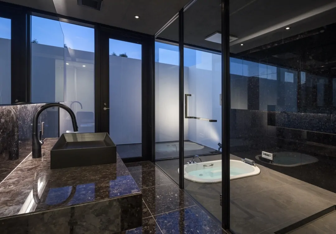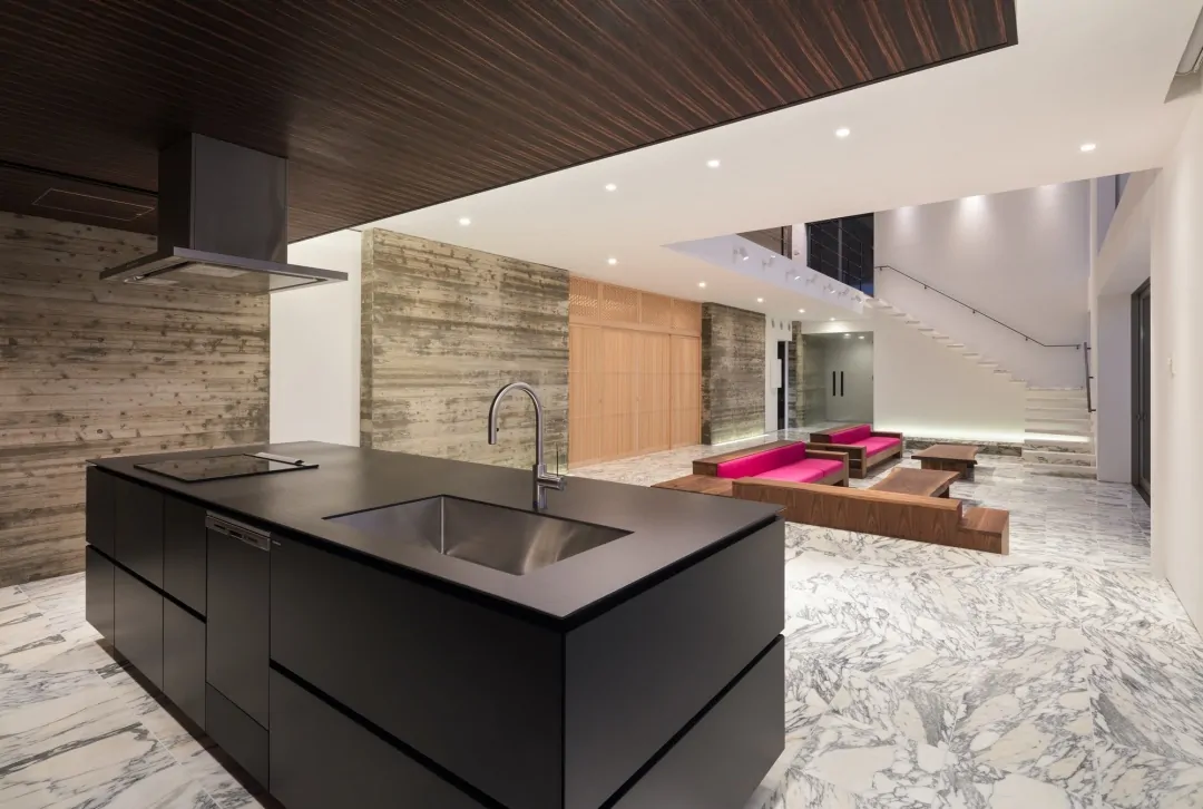 セミパブリックの内部空間では、床に華やかな模様のある大理石を使用しました。キッチンは白い大理石の平面に浮かぶ黒いオブジェクトの存在感とし、リビングの大きな空間とキッチン周りの親密な空間は、エボニーによるL型の壁と天井によって調整されています。浴室は洗面脱衣、バス、シャワー、浴室テラスが一体空間としてとらえられるような空間としており、白基調のセミパブリックスペースと対比的な黒基調の囲われた安心感のある最もプライベート性の高い空間として存在しています。