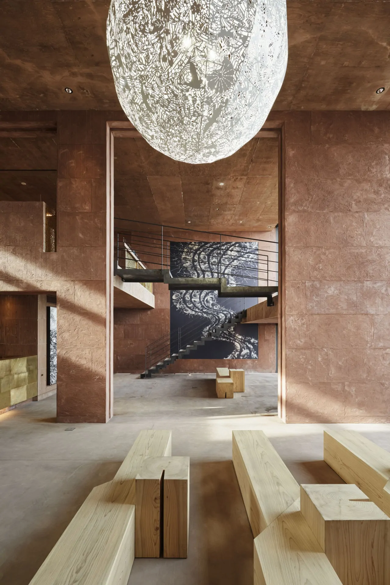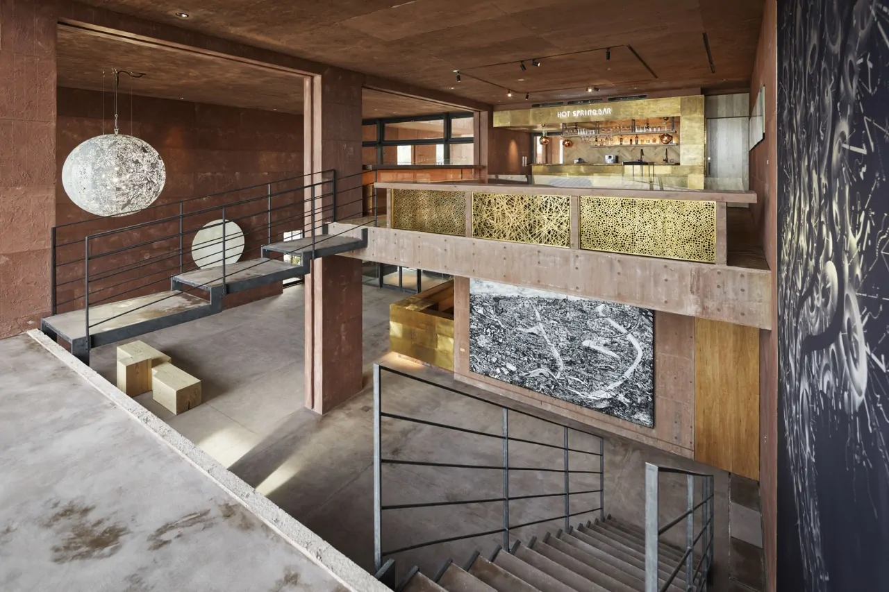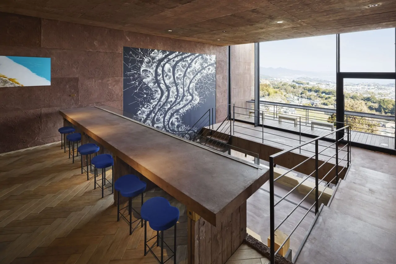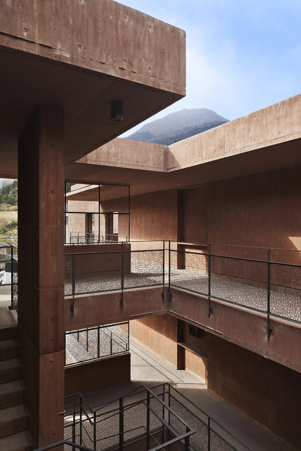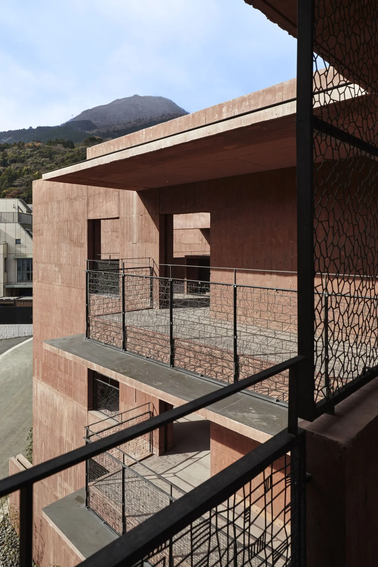 この建築のプログラムは宿泊機能を中心としていますが、宿泊者のみならず、堀田温泉エリアの新たなパブリック性のある拠点として、鶴見岳登山やアクティビティ参加の機会で一時的に来訪する旅行者、レストランやカフェ・バーを利用する近隣や地域の住民の来訪も想定されています。また、12組の現代美術作家による別府との邂逅から生まれたコミッションワークが館内に展示され、それらが今後少しずつ変化し増えてゆくギャラリーとしての機能もある為、美術鑑賞者も訪れるでしょう。様々な来訪者が自由に過ごし交流できるよう、2層吹き抜けたロビー、半屋外のテラススペース、水盤テラス、屋外のテラススペース、カフェ・バー、スタジオが用意されています。それぞれのパブリックスペースは、壁の孔により途切れているようで繋がっています。