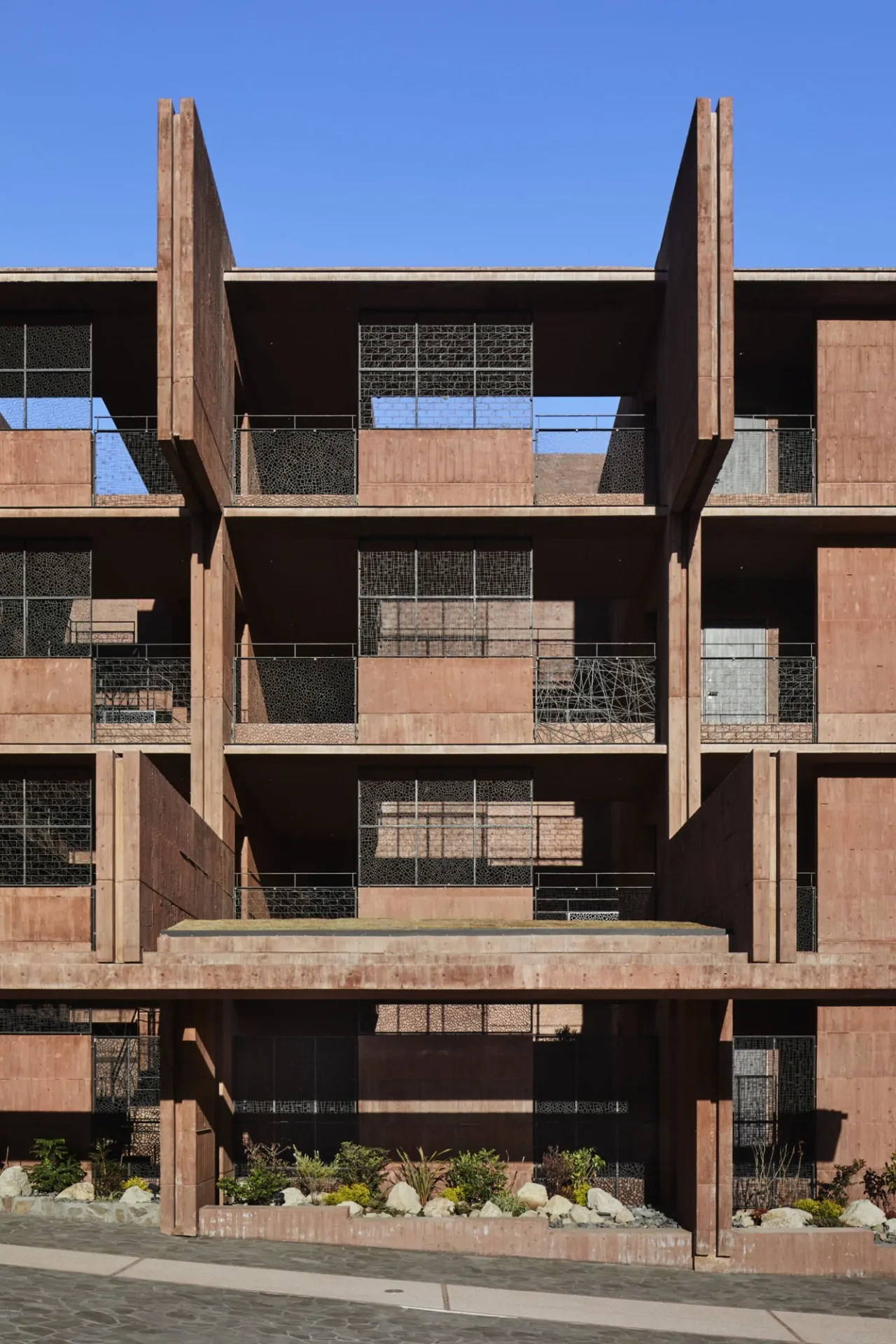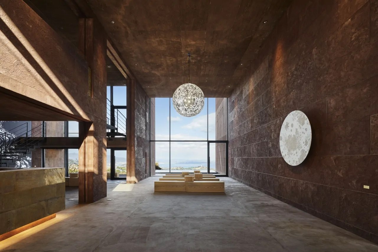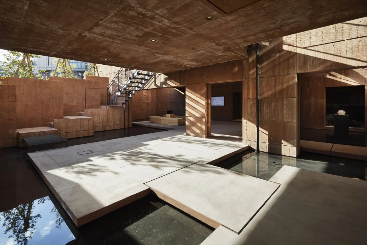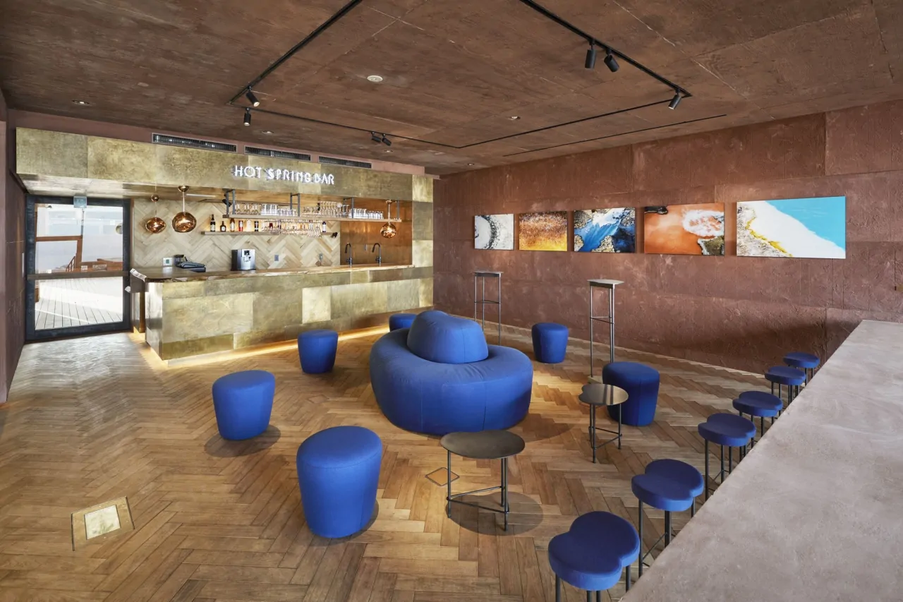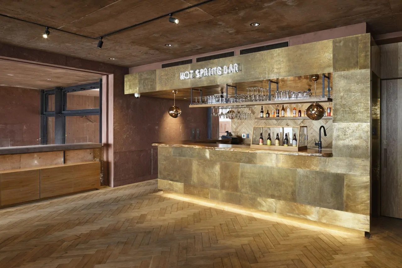 この建築のプログラムは宿泊機能を中心としていますが、宿泊者のみならず、堀田温泉エリアの新たなパブリック性のある拠点として、鶴見岳登山やアクティビティ参加の機会で一時的に来訪する旅行者、レストランやカフェ・バーを利用する近隣や地域の住民の来訪も想定されています。また、12組の現代美術作家による別府との邂逅から生まれたコミッションワークが館内に展示され、それらが今後少しずつ変化し増えてゆくギャラリーとしての機能もある為、美術鑑賞者も訪れるでしょう。様々な来訪者が自由に過ごし交流できるよう、2層吹き抜けたロビー、半屋外のテラススペース、水盤テラス、屋外のテラススペース、カフェ・バー、スタジオが用意されています。それぞれのパブリックスペースは、壁の孔により途切れているようで繋がっています。