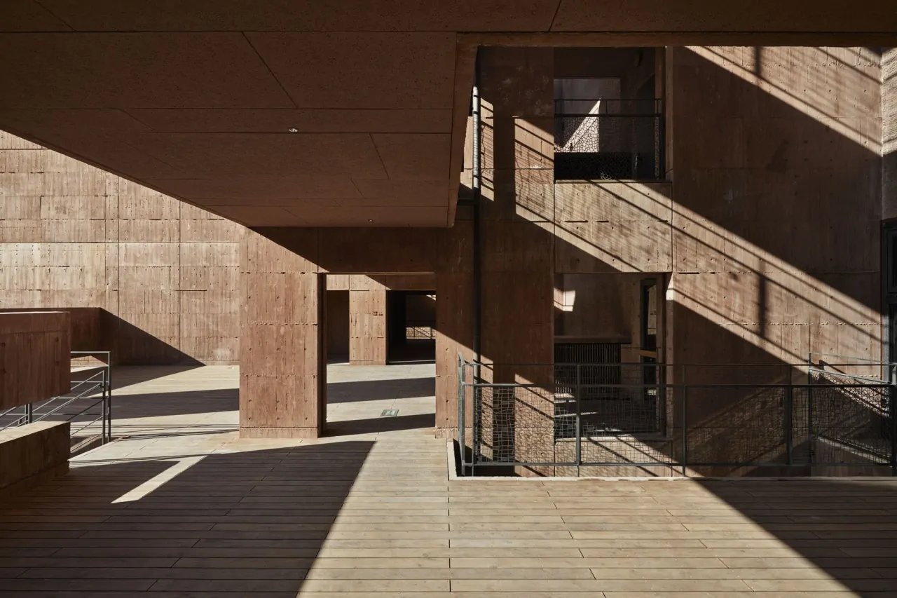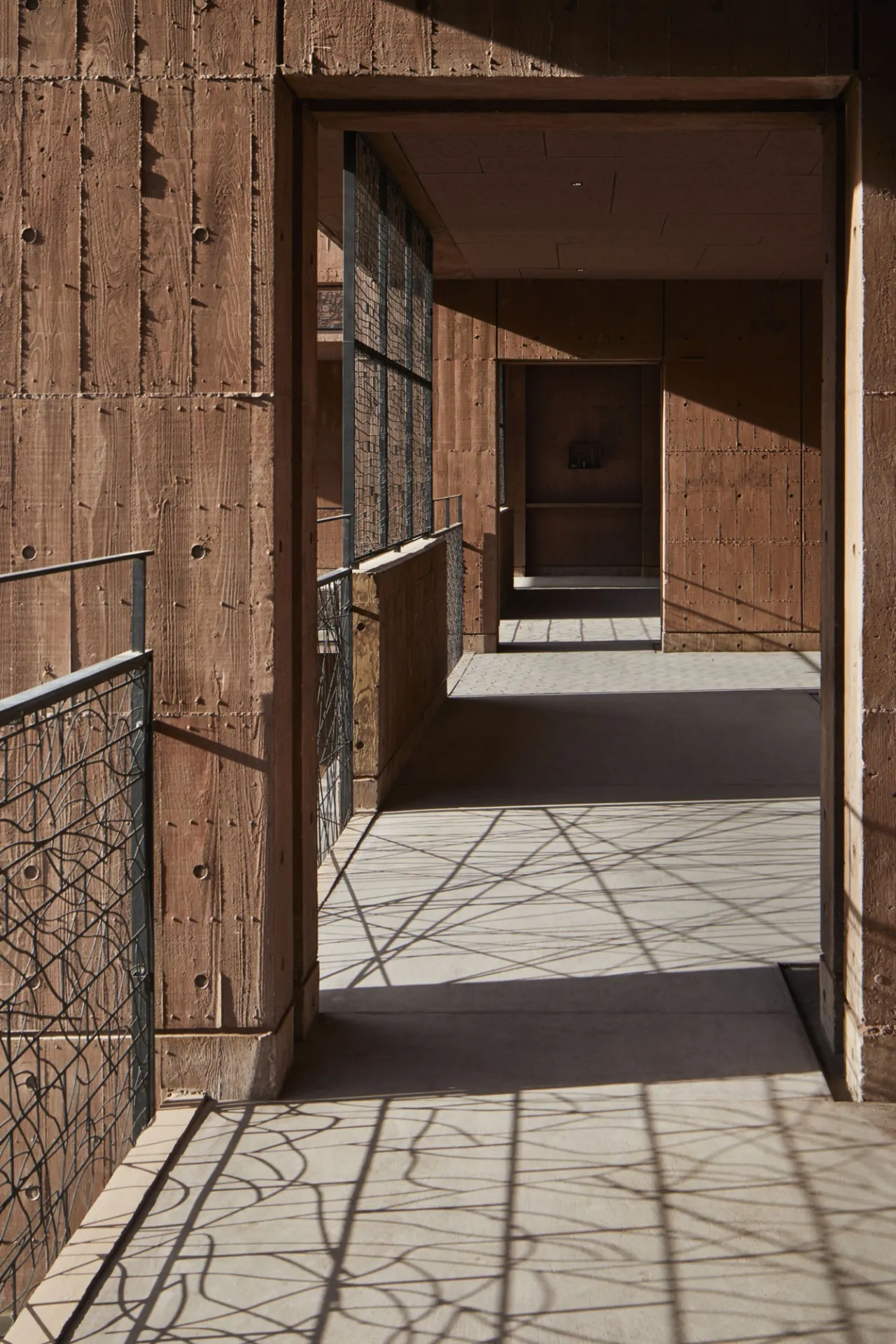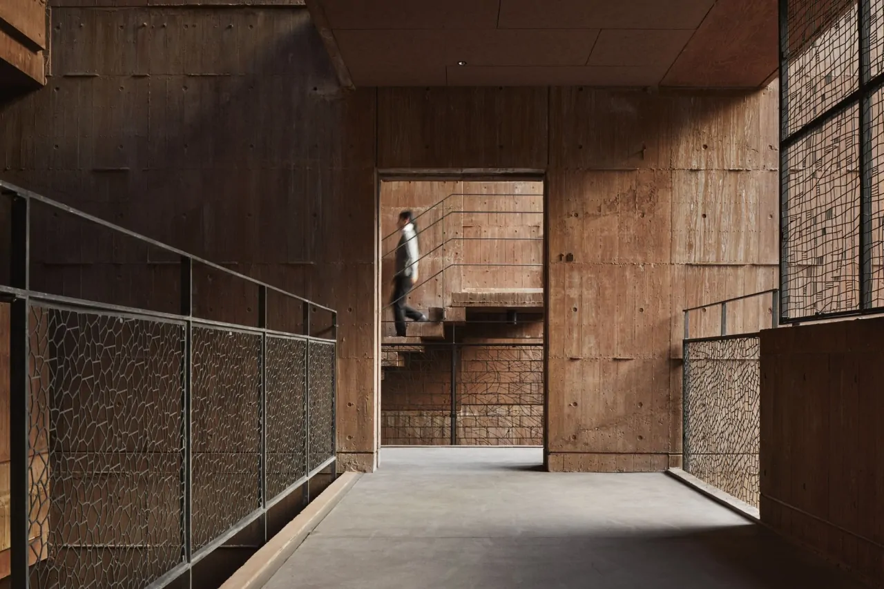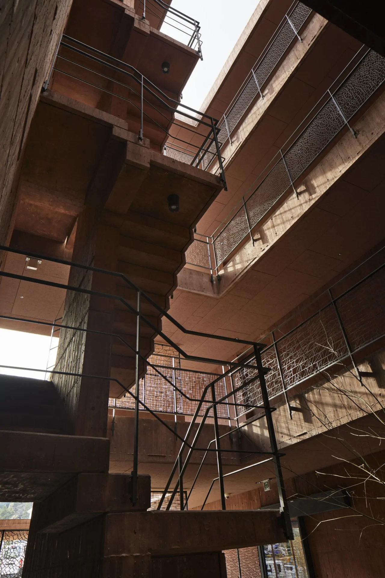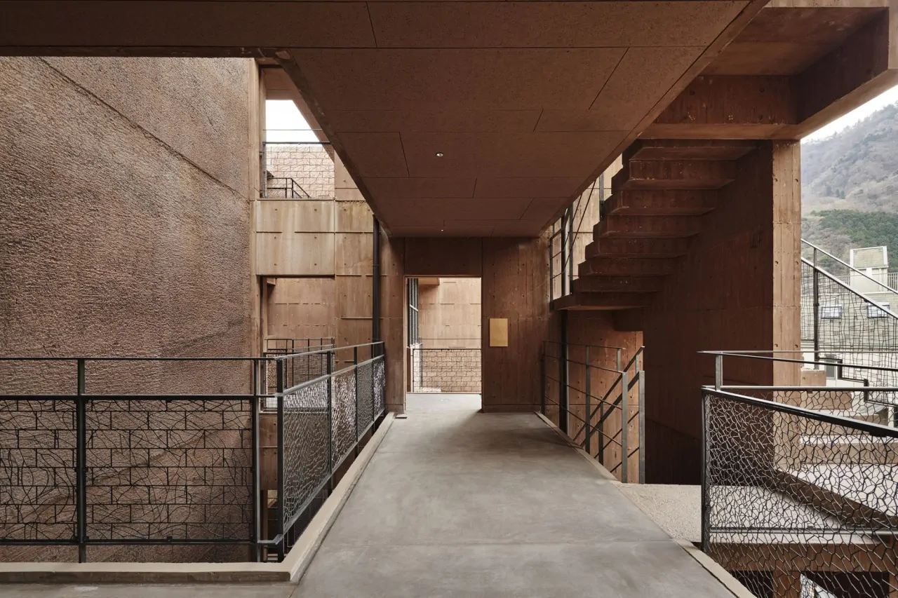 本棟は、地上5階建ての規模が必要で、耐火建築物とする必要性から、RC造としました。先述した「断層崖に連続する『削り出された大地』としての壁の群れ」を生み出すにあたり、南洋材でできた合板型枠(コンパネ)を極力使用せず、新たな型枠を大分の林産業者と開発しました。「まく板型枠」といわれるもので、大分県と林産業者が砂防ダムなどの土木工事用に開発していたものをベースとして開発しました。主な型枠は大分県産の無垢スギ材でできており、寸法は外形650mm×1800mm、スギ板は幅100mm。表面はノコで切ったままの表情とし、板間や型枠間の隙間を設け、脱枠時に凹凸が残ったり残らなかったりという偶発性が現れるように。型枠は丈夫な為、3回~4回の転用ができました。この型枠の寸法や表情が、階高をはじめ空間全体を通底するリズムを成しています。