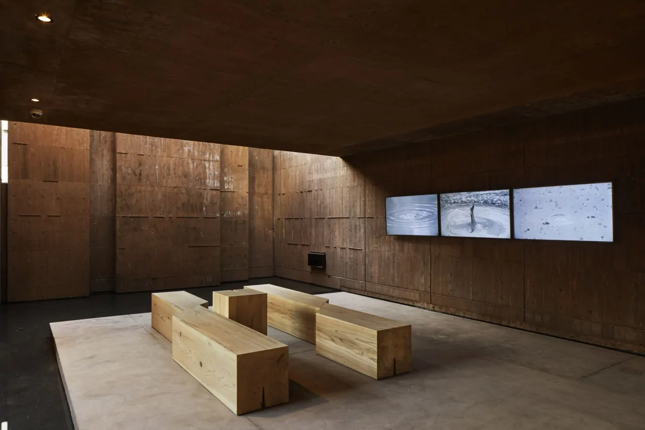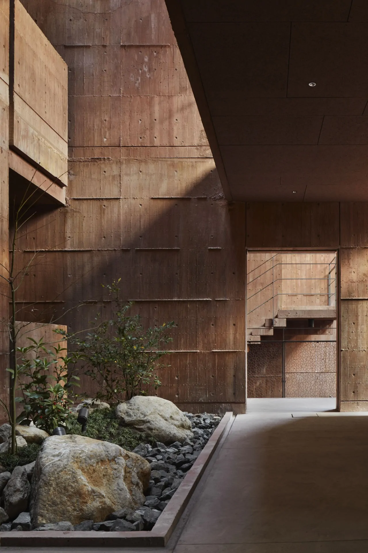 コンクリート自体にも効果を与えています。コンクリートに酸化鉄を主体とする無機混和材を顔料として加え、大地と連続する存在感を求めました。コンクリート表面に発生するエフロレッセンスや型枠の木材、転用に由来するムラなどもすべて制作プロセスで発生する現象、「景色」として受け入れて仕上げました。コンクリートは人工的な素材としてのイメージが強く、時に精緻な工業製品のような精度を求められますが、コンクリートには別の顔もあると感じています。大分県や近隣にはセメント産地も多く、九州では砂利や砂は近場のものが使われることが多く、みな元はナチュラルマテリアルであり、コンクリートのナチュラルな側面を引き出したいと考えました。心身を休めにくる場所には、精緻な人工物よりも、おおらかでざっくりとした、土塊のような表情のコンクリートがよいという考えです。