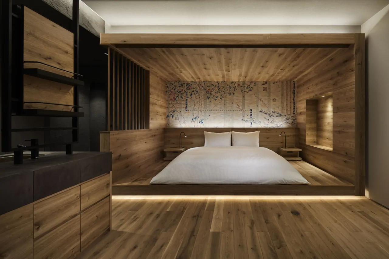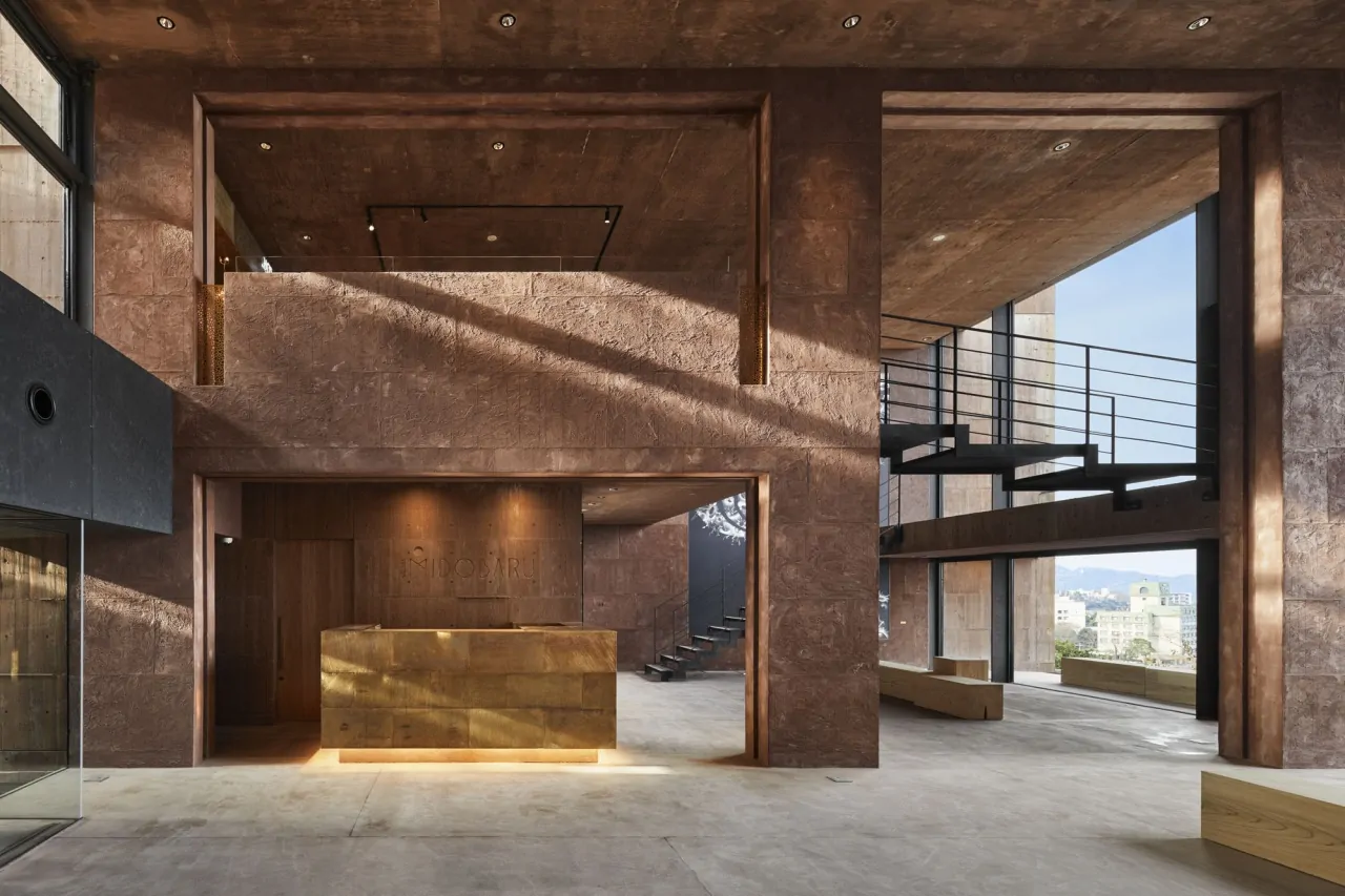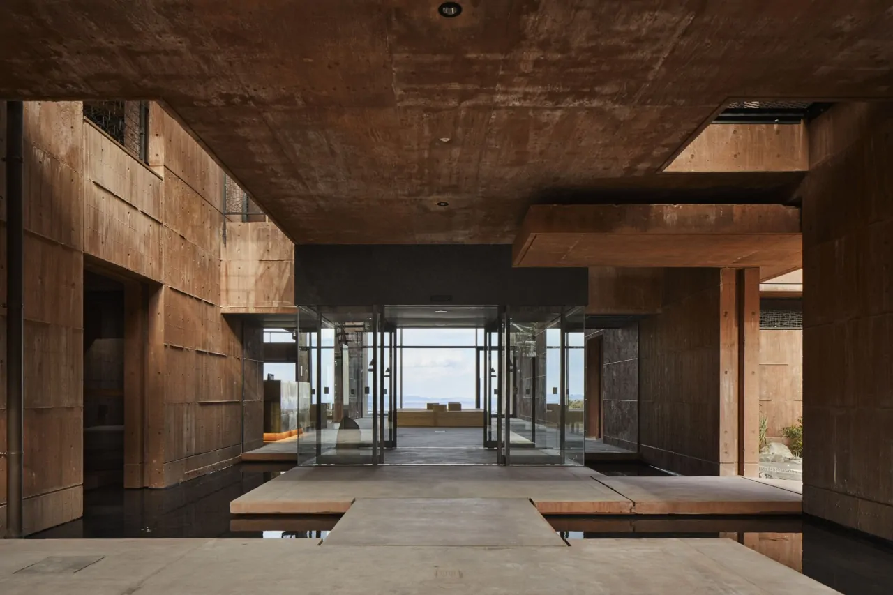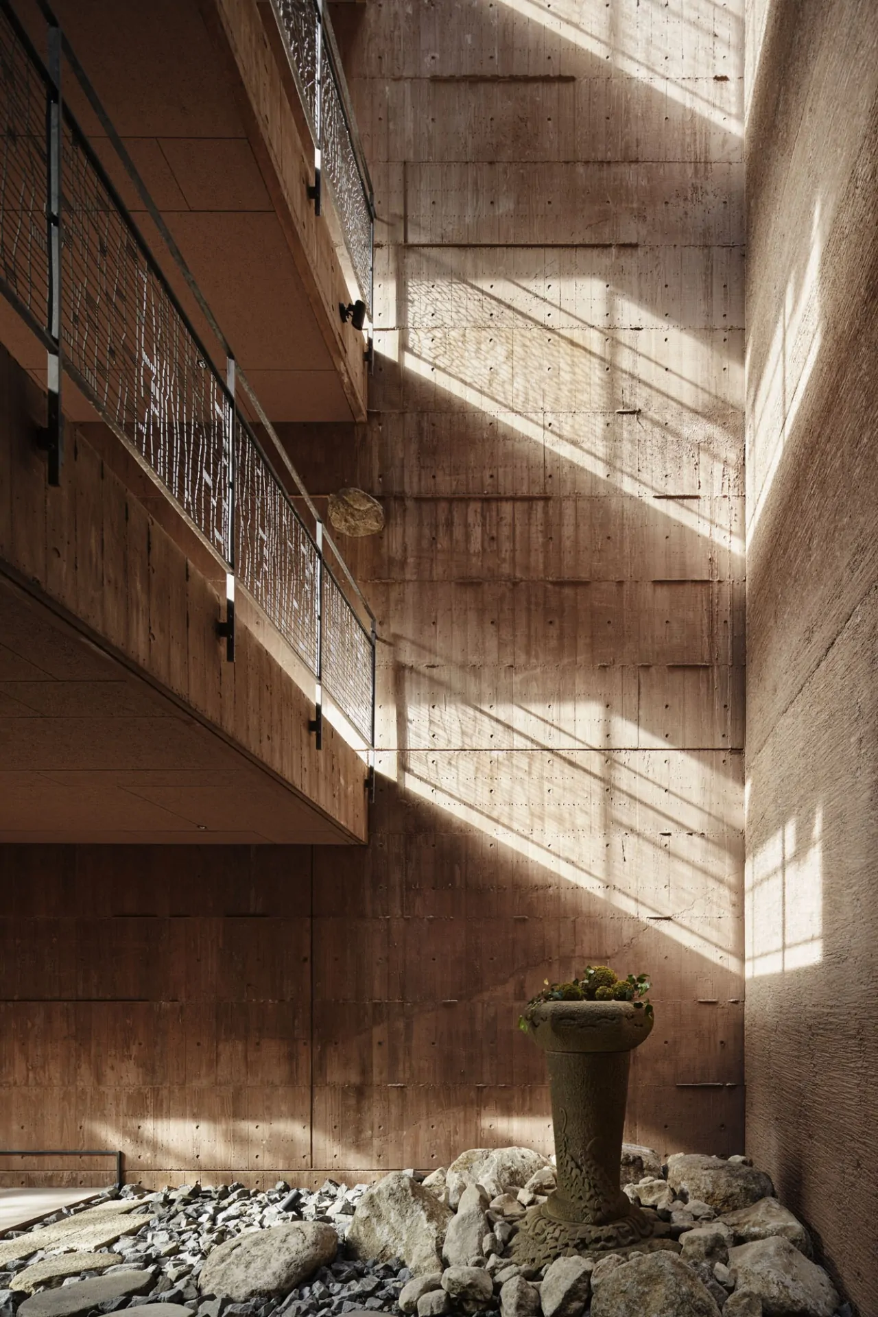 この建築を訪れると、壁に穿たれた孔に突き刺さるロングキャノピーを目にし、それに誘われるように厚い壁を潜ると、一度感覚が日常から切り離され、水の音や、壁やスラブの孔から染み込んでくるような光を感じます。館内では、アートと出会い、孔を潜りながら客室やレストランへ至る、路地のまちあるきのような空間体験をもたらします。随所で壁や孔によってフレーミングされ異化された風景と出会い、まちとつながります。