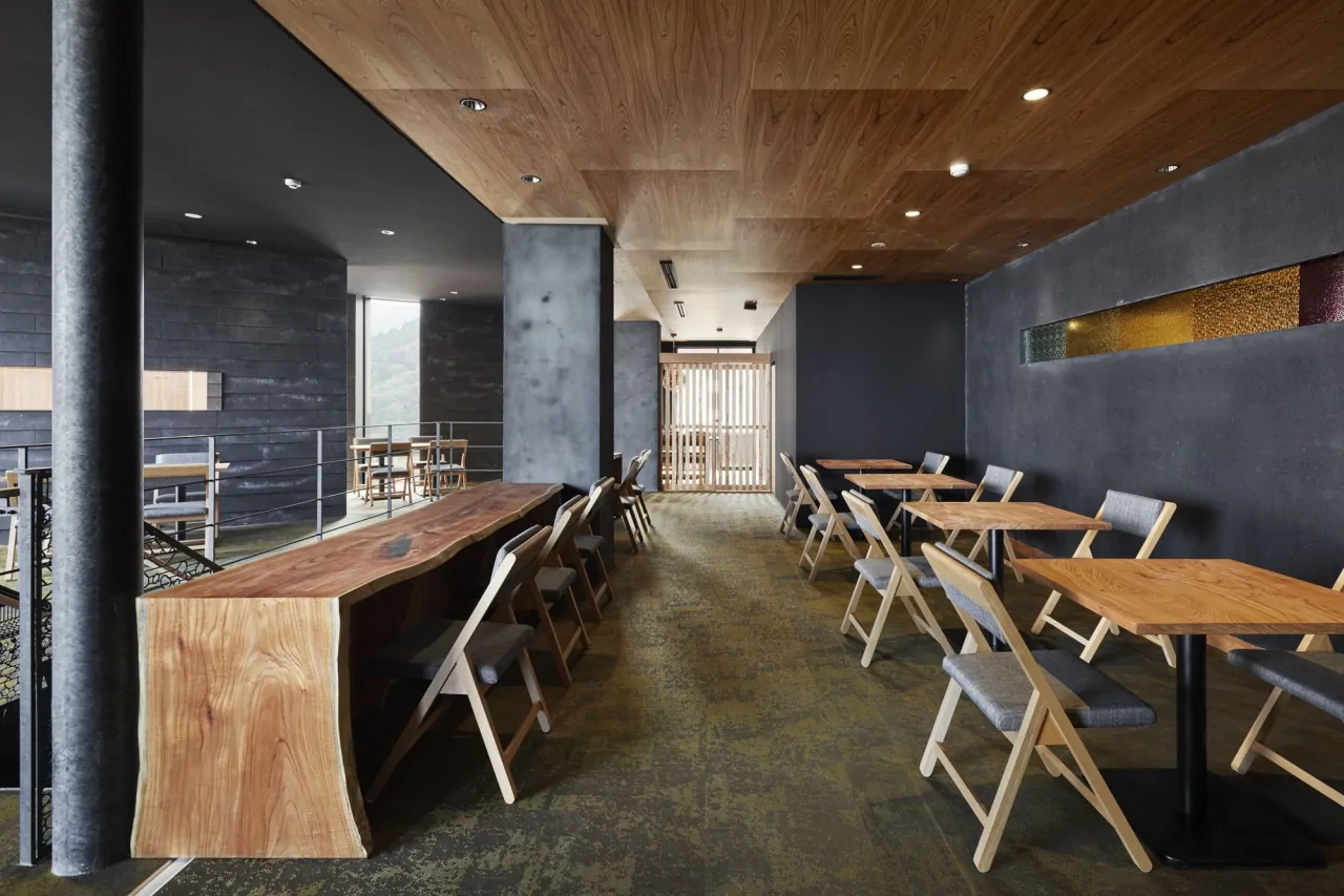 レストラン棟は既存建築物を再生活用した再生建築です。クライアントが土地を求めた際に、RC造3階建ての別荘が残存していました。この既存建築物の3階部分を減築し、上部重量軽減により耐震性を高めて、建築基準法より求められる負担を下げ、同一クライアントが運営する隣接施設からの眺望を良くしました。既存部分に対しては、耐震診断と補強も実施しています。その上で、鉄骨造により、本棟からくる壁のリズムを連続させる形で増築部分を設け、客室部分で新旧の空間の変調を感じられる空間構成としました。
