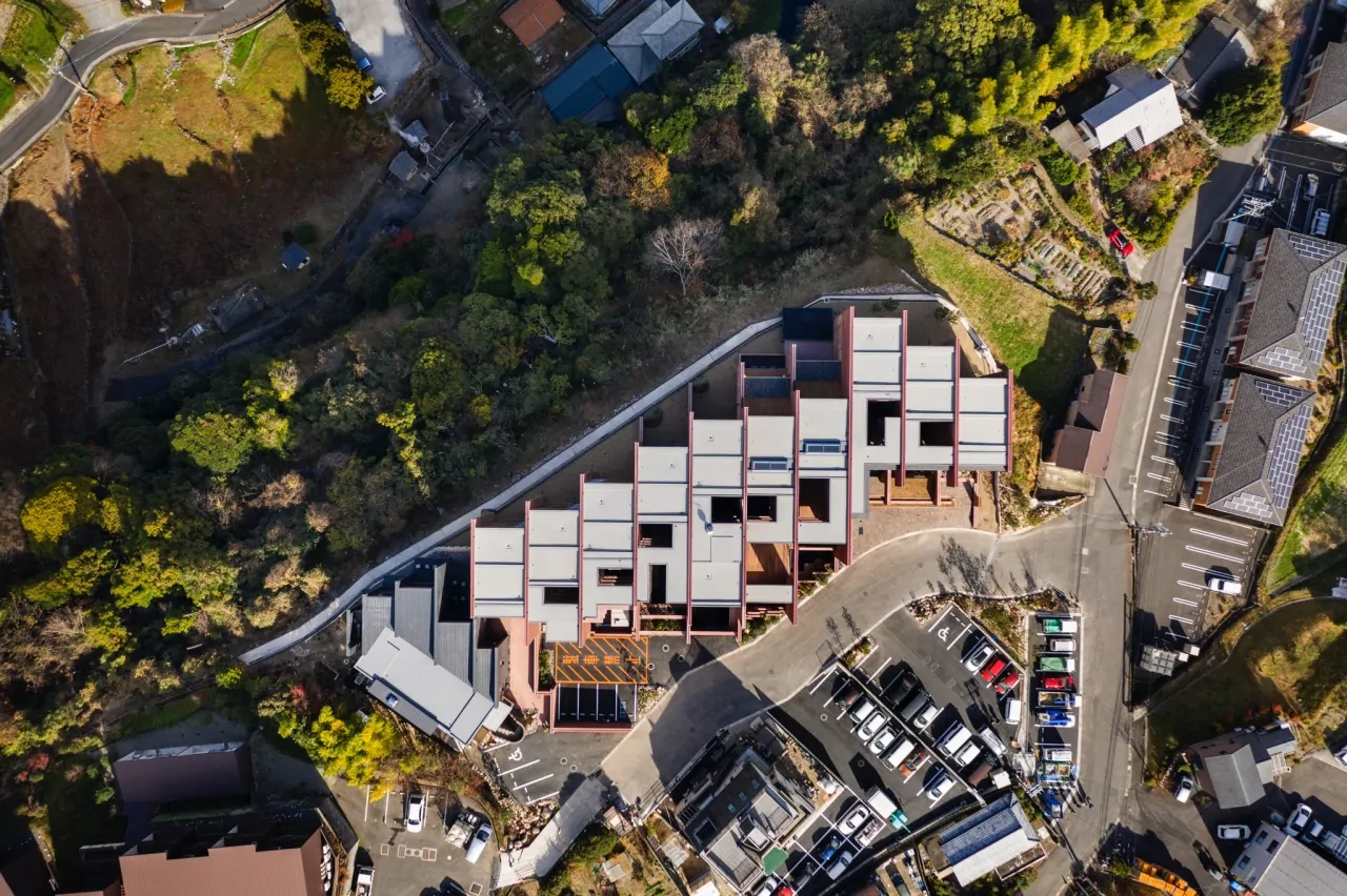 この建築が建つのは、別府市の南西部、「別府八湯」のひとつである温泉場「堀田温泉」エリアの断層崖の上の「御堂原(みどうばる)」地区です。別府といえば温泉で有名ですが、その起源は地球の地殻・造山運動にあります。