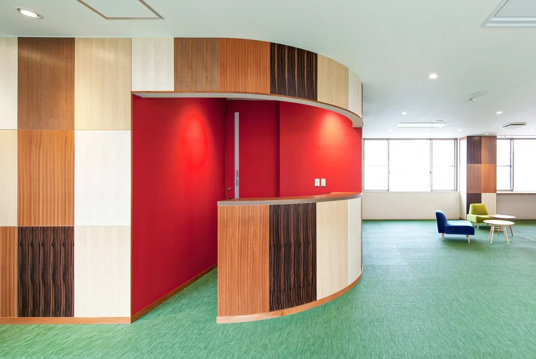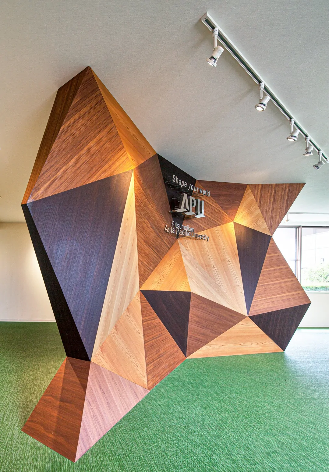 APU本部棟4階の学長室フロアにある秘書課の事務室を、来訪するゲストをもてなし、また学生たちと交流するための空間として空間再生しました。世界中の様々な国から学びに来ているAPUの学生たち。親近感を持ってもらい、学生や関係者一人ひとりがその環境の中で自らの成長や将来を切り開き世界中の人とつながりながらこの世界を形作っていって欲しいという想いから、世界の各大陸や地域でポピュラーなオーク、チーク、ウォルナット、ウェンジ、ヒノキ、サペリ、クルミなどの様々な樹種を組み合わせて利用しました。