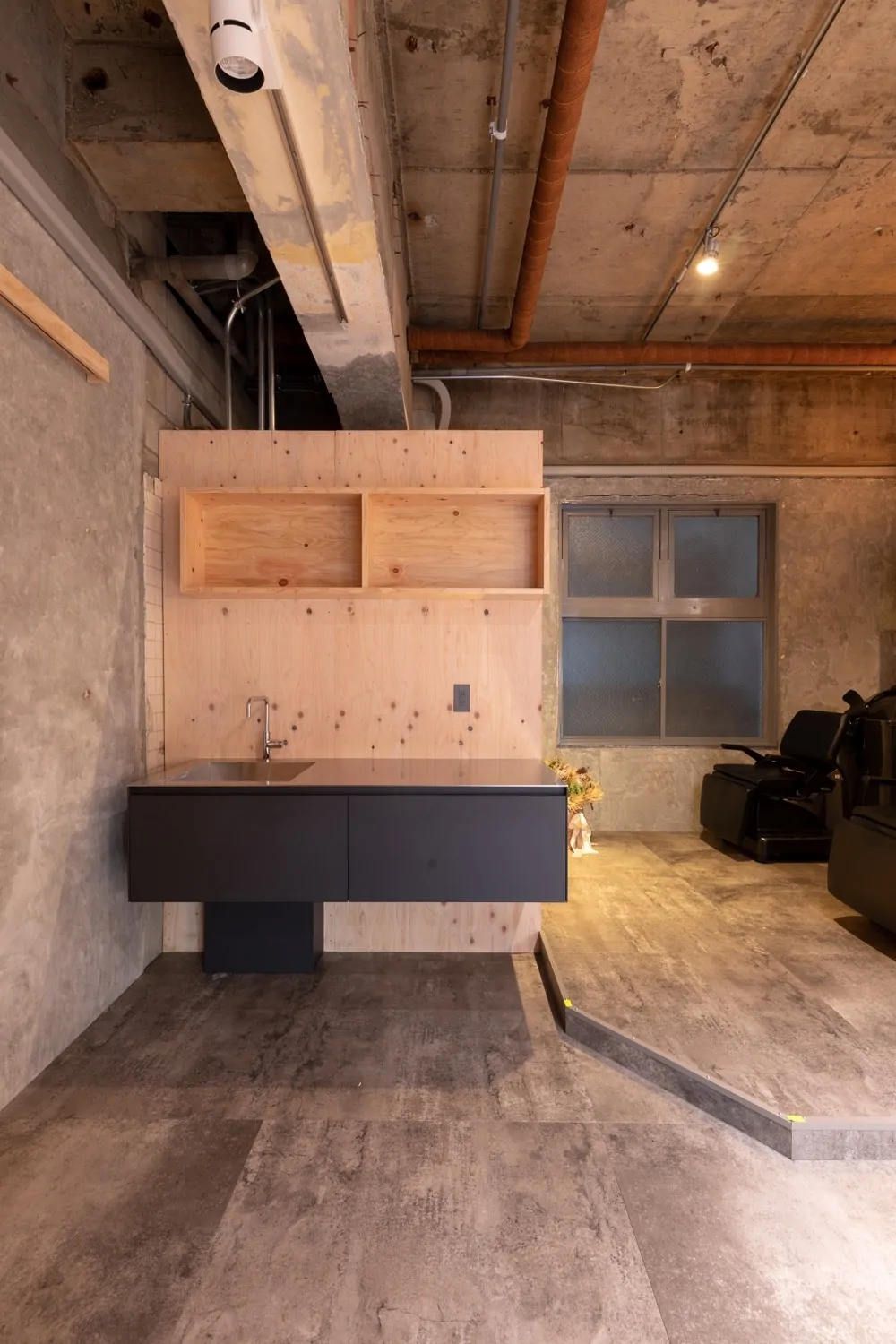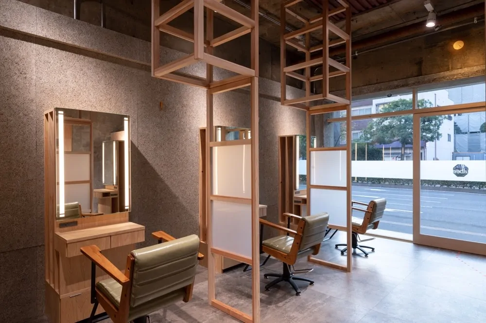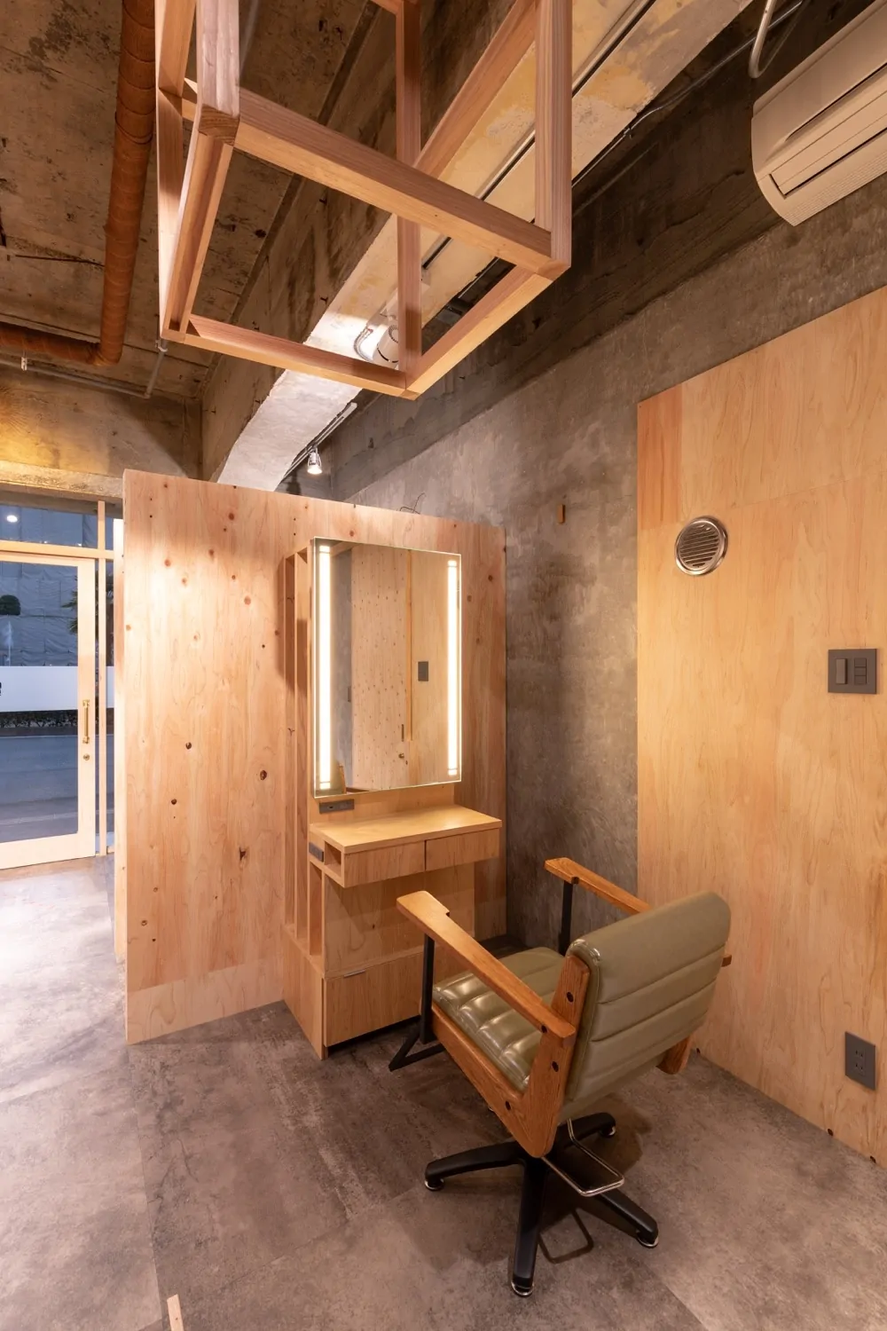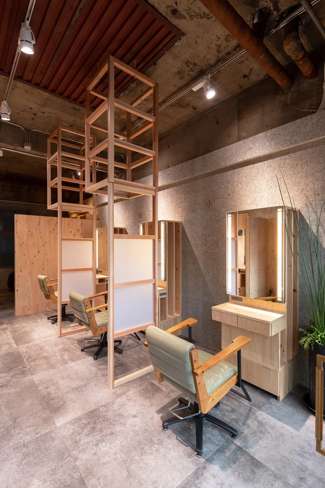 大分市大手町の遊歩公園に面する1階のテナントをハイブリッドサロンに空間再生した。毎月通えるローコストプランのサロンをというご依頼で、既存空間のコンクリートの表情を残しつつ、家具・建具・間仕切りに流通材を用い空間に統一感を持たせた。withコロナ時代への対応として、はしご状の取外し可能なパーテーションで半個室化を実現させている。シャッター内側を新設の大開口木製サッシにし、より多くの人に認知してもらえる入り口にした。