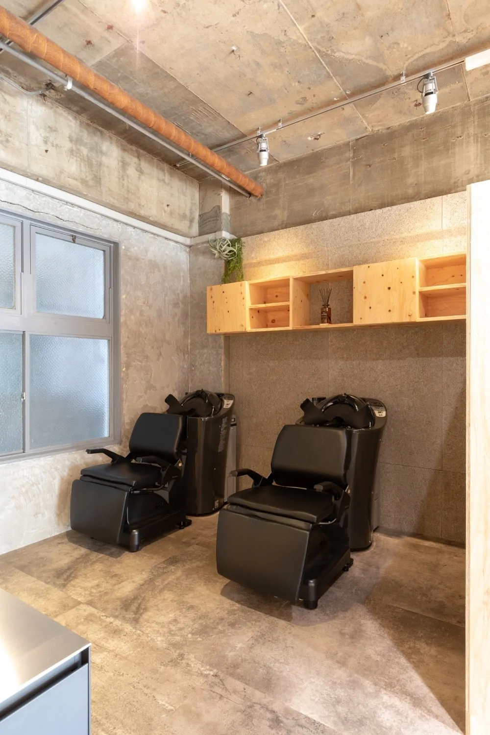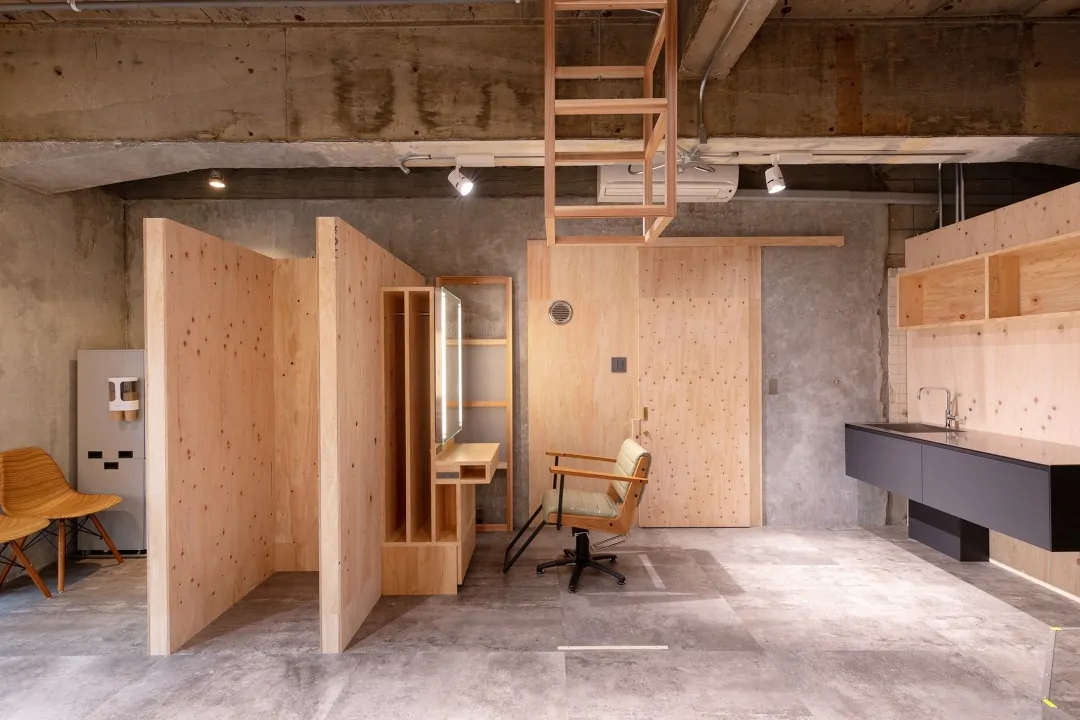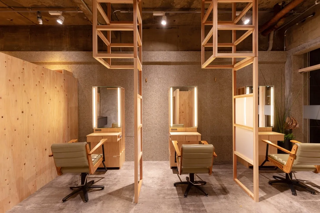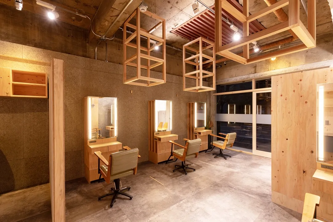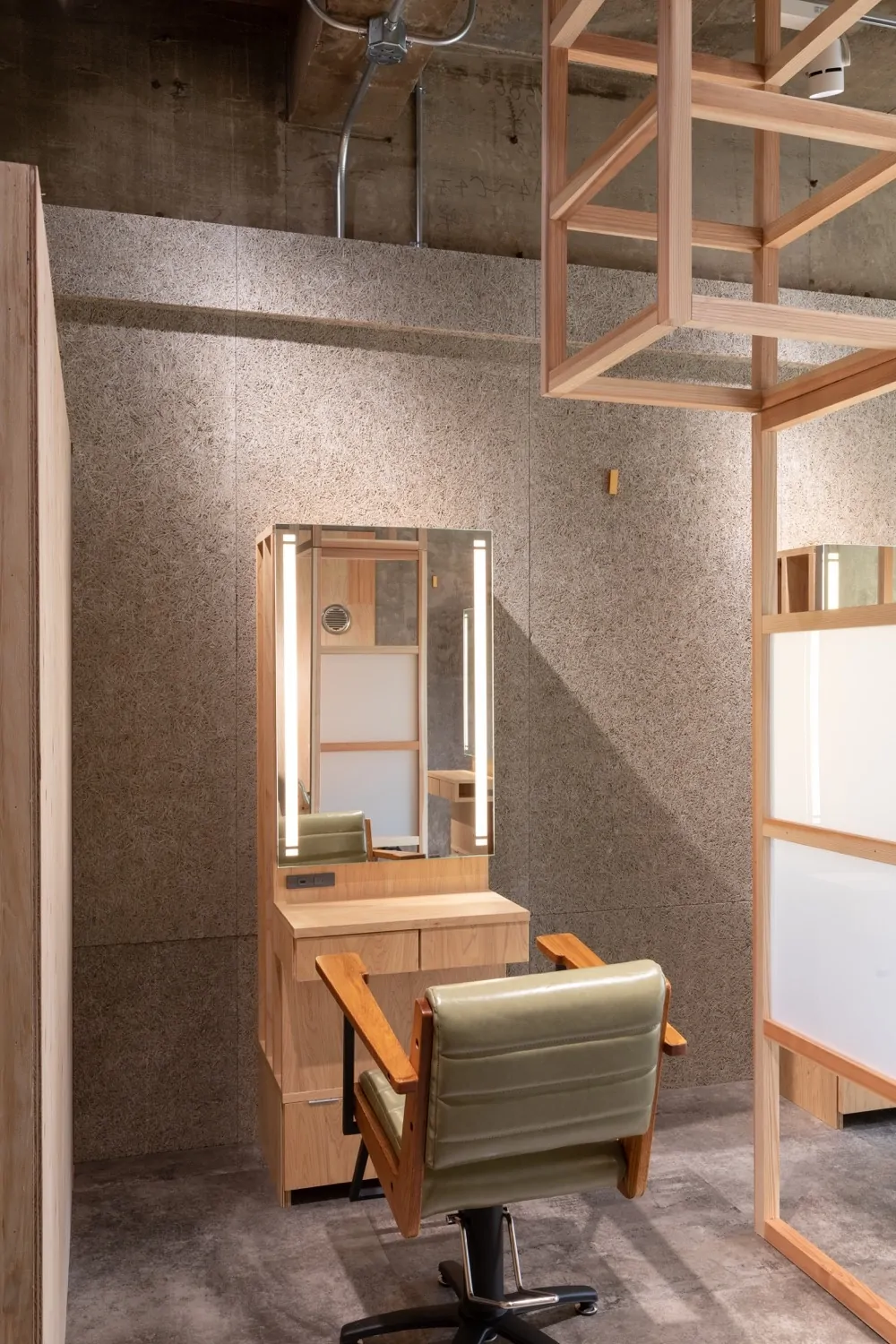 大分市大手町の遊歩公園に面する1階のテナントをハイブリッドサロンに空間再生した。毎月通えるローコストプランのサロンをというご依頼で、既存空間のコンクリートの表情を残しつつ、家具・建具・間仕切りに流通材を用い空間に統一感を持たせた。withコロナ時代への対応として、はしご状の取外し可能なパーテーションで半個室化を実現させている。シャッター内側を新設の大開口木製サッシにし、より多くの人に認知してもらえる入り口にした。