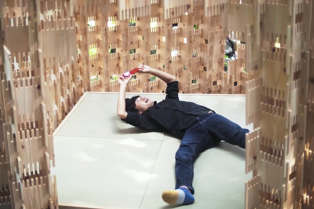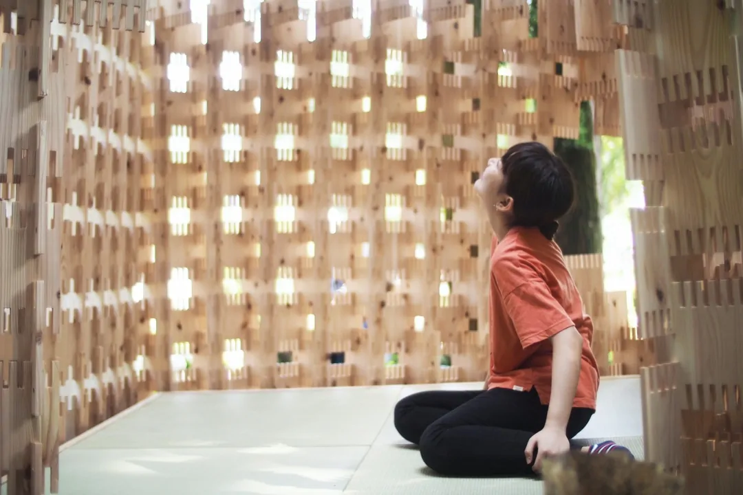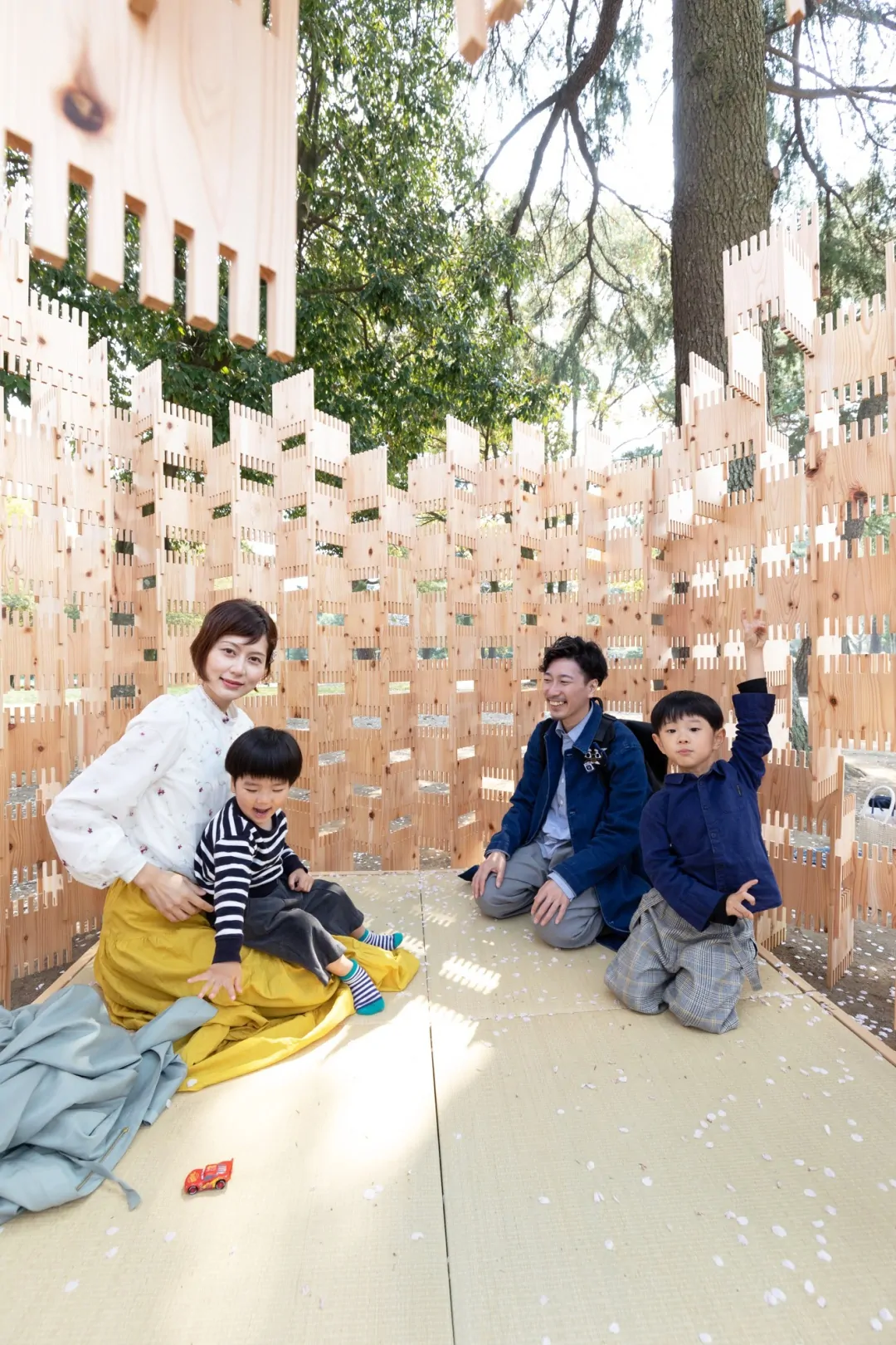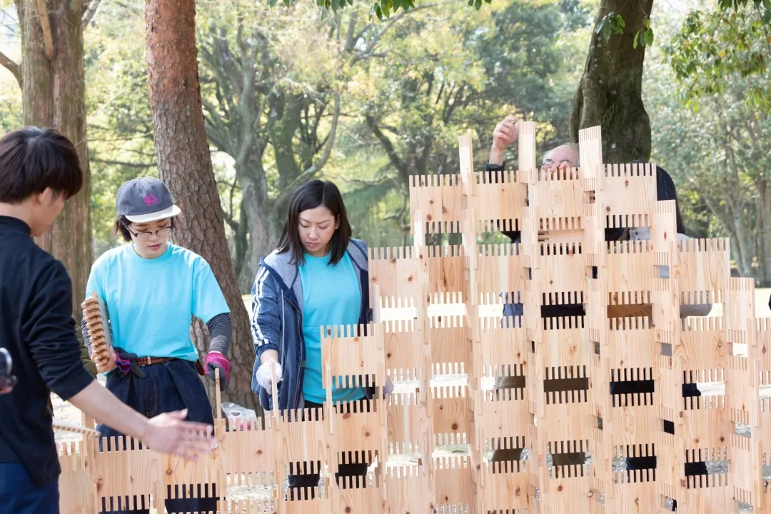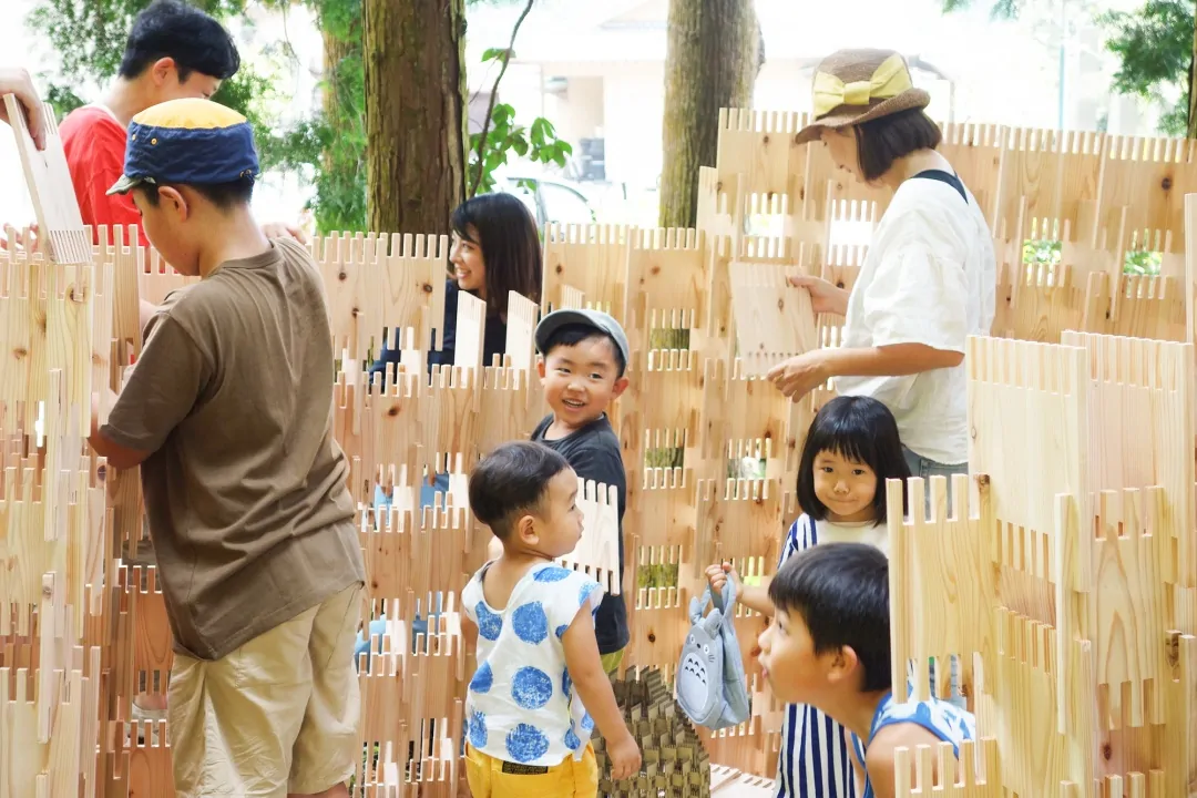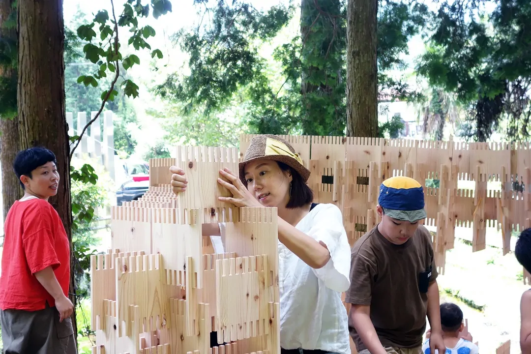 国産無垢スギ材パネルを切り抜き、両側に10本の歯を持つ櫛状の形に成形した1種類のパーツ。軽く持ちやすい大きさで、誰でも簡単にパブリックスペースなどに簡易な空間的設えを、このパーツを組み合わせて作ることができる。実際に森の中や公園、川床に沸く温泉脇などに設置され、仮設的フォリーや茶室として活用されてきた。