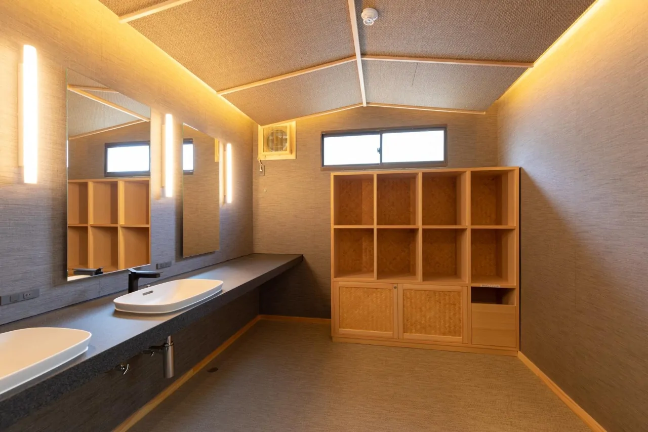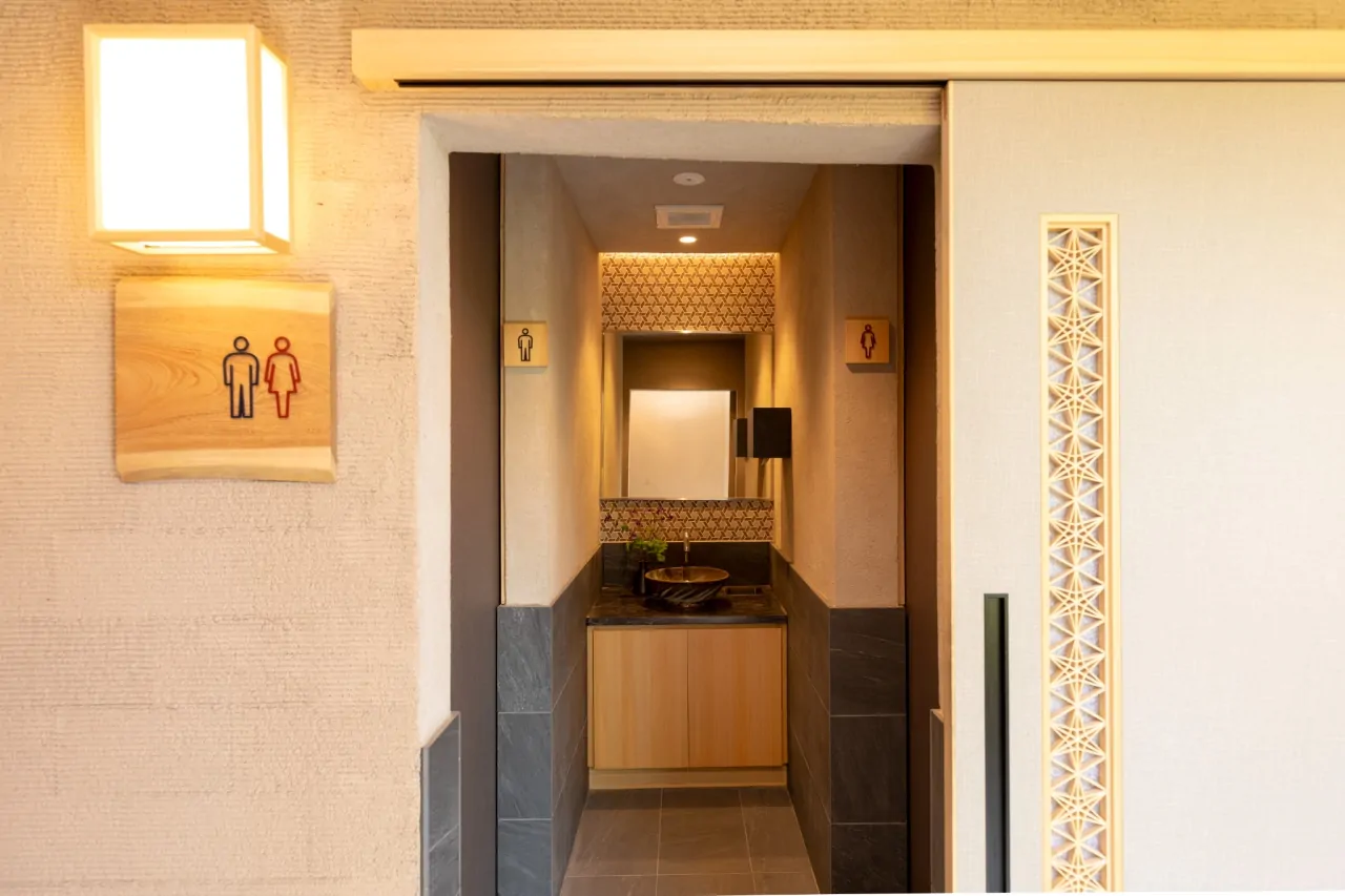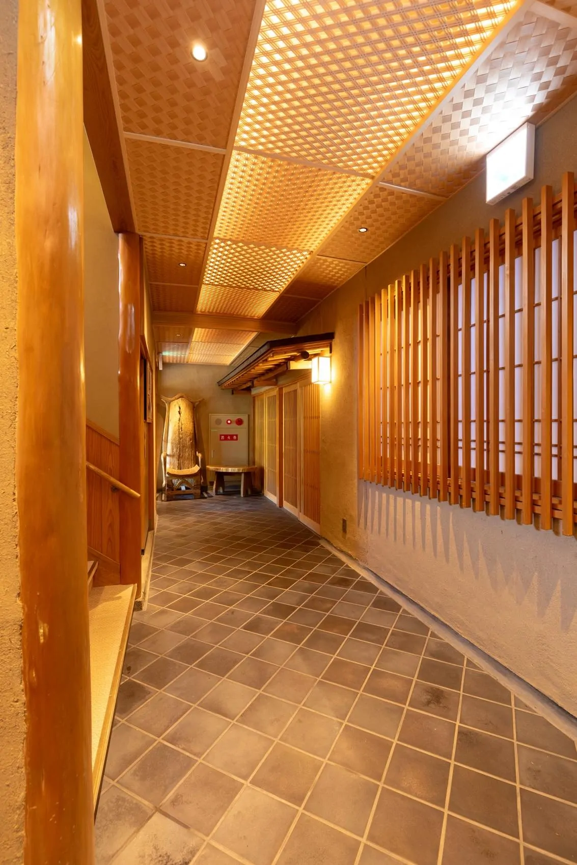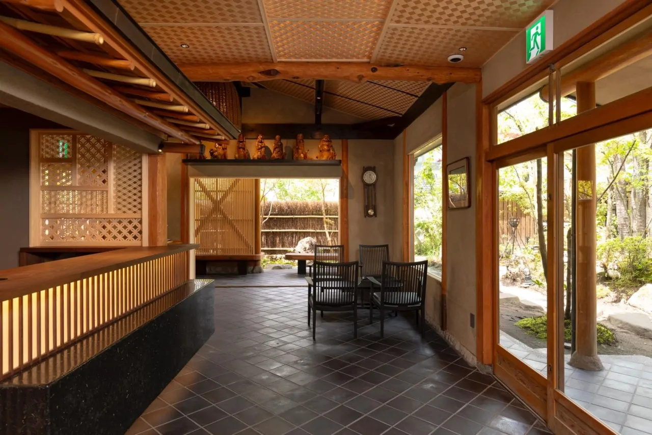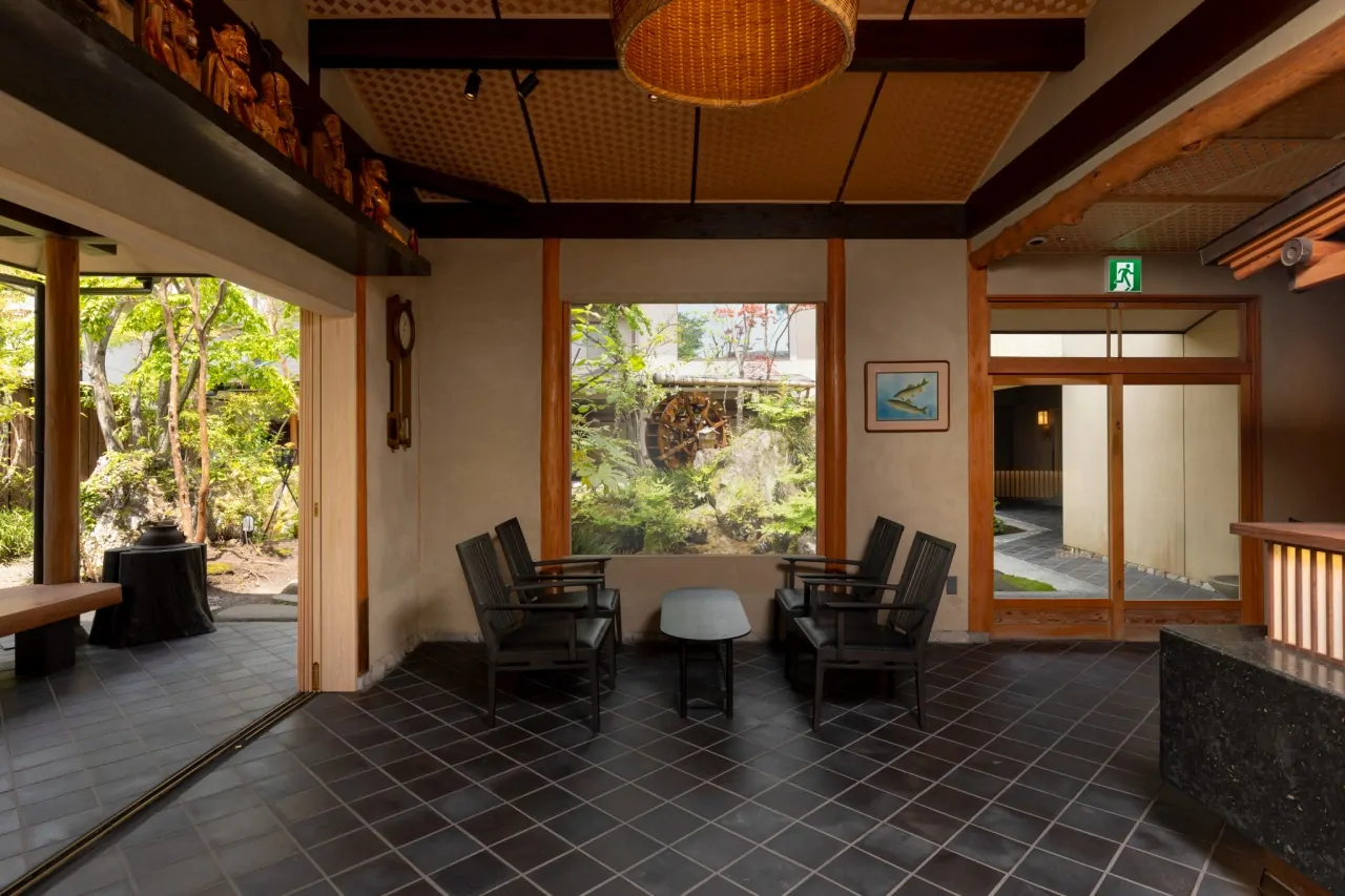 エントランスには、特別に焼成した陶板タイルを敷き、足元から土の質感を感じられるように。壁には藁スサを混ぜ込んだ左官仕上げを施し、田舎の温もりがにじむ表情をつくり出しました。さらに、組子細工の灯りと杉の網代天井が織りなす陰影が、訪れる人を穏やかに迎えます。新たに設けた大きな開口の先には、水車の庭がひらけ、風に揺れる葉や移ろう季節の色彩が、静かな時間を描きます。レセプションカウンターには、浮遊感をたたえた研ぎ出し仕上げを採用。内部には、由布=木綿(ゆふ、楮に由来)という語源にちなみ、楮のスサを練り込み、この地の記憶をさりげなく映し出しています。多様な素材が静かに調和し、空間全体の気配をやわらかく整えています。