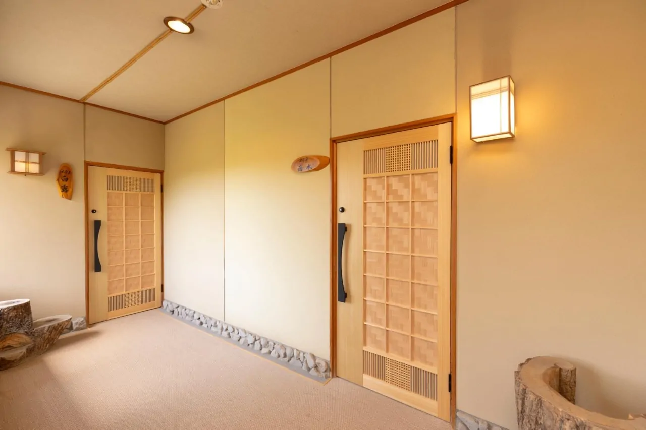 男女入れ替え制の大浴場「花子の湯」「太郎の湯」は、それぞれ異なる体験を楽しめる湯処です。2階組みの「太郎の湯」では、かつて一体化していた巨大な浴槽を改修し、天然石の岩風呂と壺湯、小庭を新たに設えました。上階の半露天風呂からは由布岳の稜線が遠望できます。「花子の湯」では既存の露天風呂の岩を活かしながら庭として再生。ガラスの屋根と窓を通して、岩の庭や夜空を眺められる内湯とし、光と緑が静かに移ろう上質な湯浴みの場となりました。