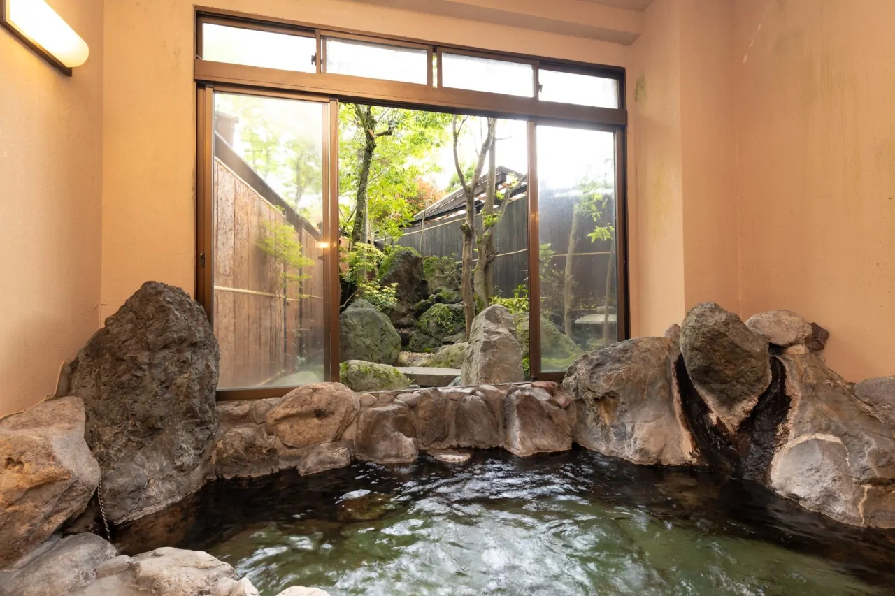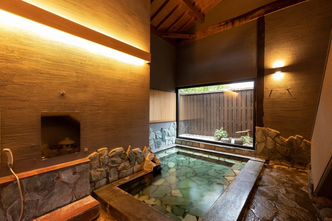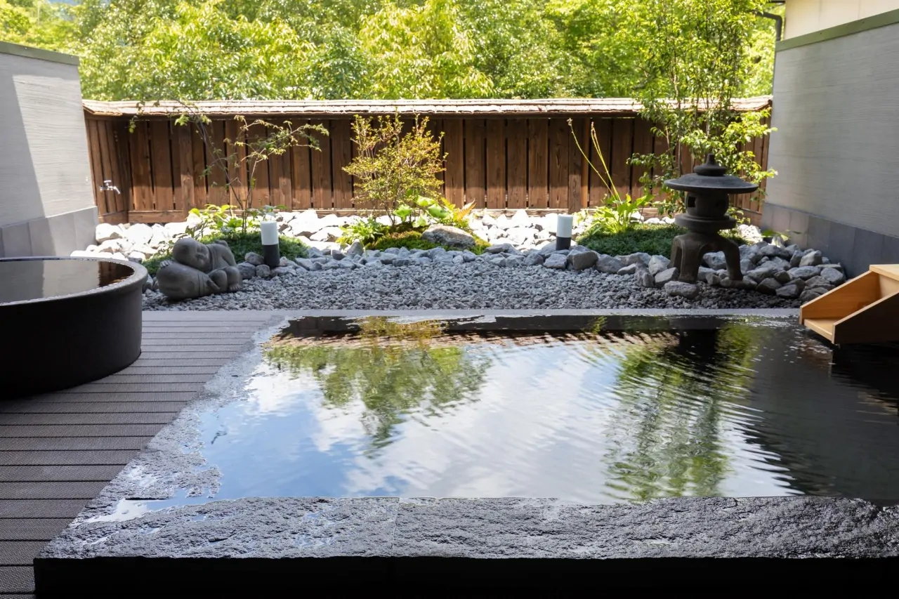 客室では、押入れだったスペースに冷蔵庫や掛け収納をしつらえるなど、現代の滞在に寄り添った和モダンの設えとしています。和紙や竹細工、竹編みを想起させる文様のモザイクタイルなど、由布の風土と響き合う素材を随所に取り入れ、くつろぎの時間に静かな品格を添えました。1階の特別な客室に備えられた露天風呂は、杉皮張りの塀で囲い、当初のお庭を更に上質な空間に。自然に溶け込むような設えのなかで、誰にも邪魔されない穏やかな湯の時間をお楽しみいただけます。