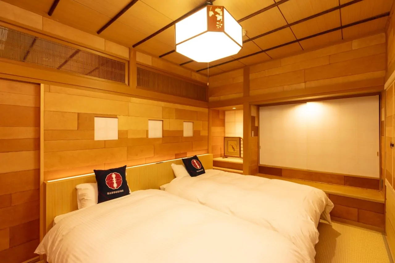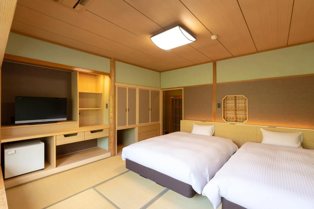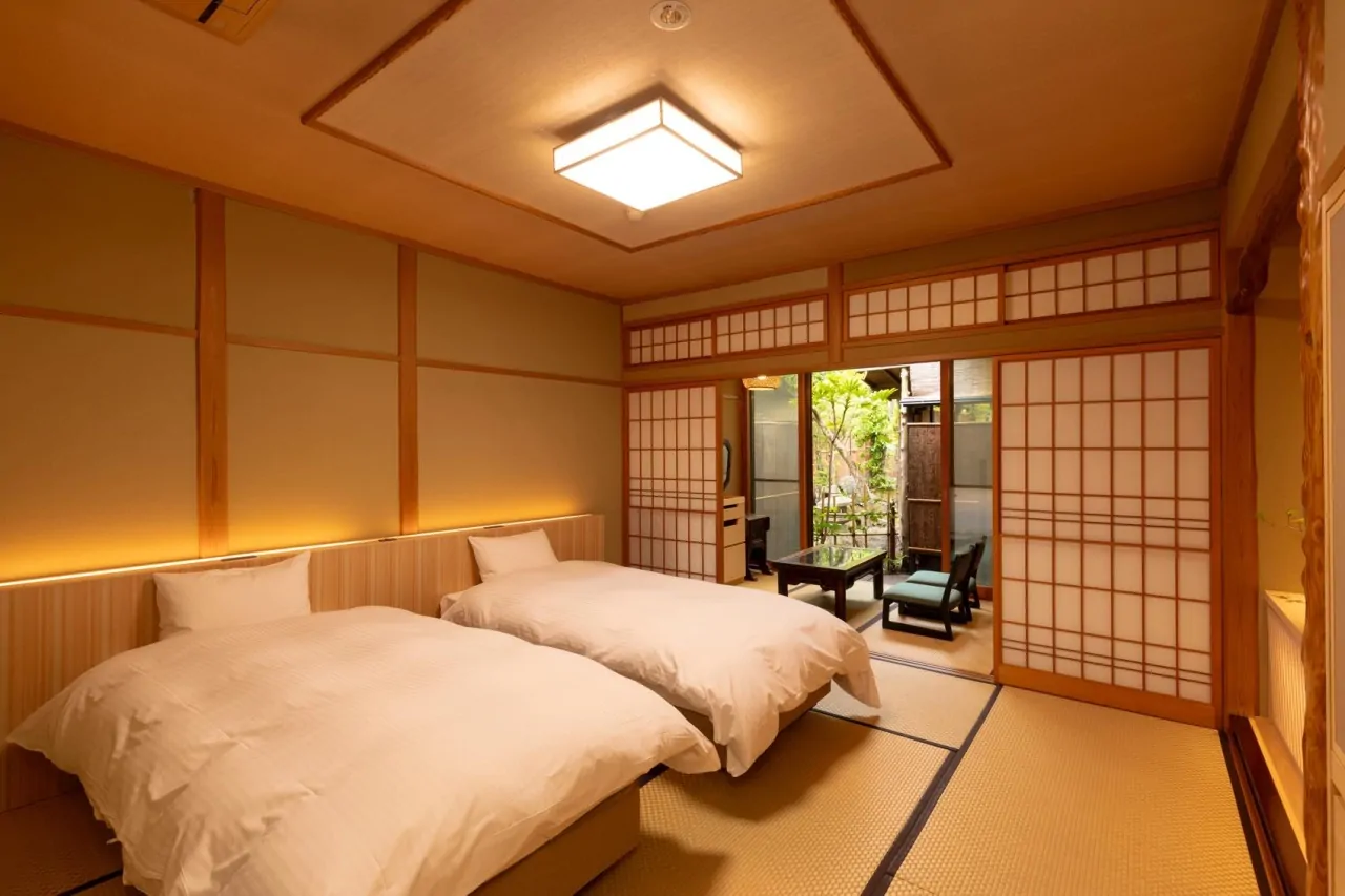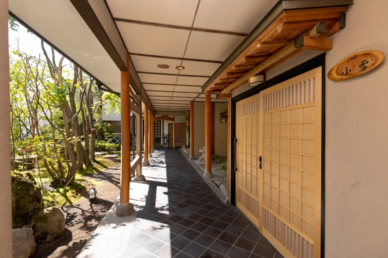 客室では、押入れだったスペースに冷蔵庫や掛け収納をしつらえるなど、現代の滞在に寄り添った和モダンの設えとしています。和紙や竹細工、竹編みを想起させる文様のモザイクタイルなど、由布の風土と響き合う素材を随所に取り入れ、くつろぎの時間に静かな品格を添えました。1階の特別な客室に備えられた露天風呂は、杉皮張りの塀で囲い、当初のお庭を更に上質な空間に。自然に溶け込むような設えのなかで、誰にも邪魔されない穏やかな湯の時間をお楽しみいただけます。