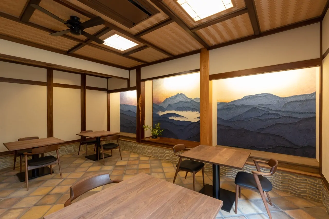 食事処は、かつての畳敷き大広間を刷新し、靴のまま気軽に立ち入れるフラットなダイニング空間へ。床にはエントランスよりもさらに表情豊かな土もの陶板タイルを用い、壁面には藍染和紙で漉き上げた由布の山並みを設えました。やわらかな朝の光に包まれながら、土地の空気を感じる食のひとときをお楽しみいただけます。